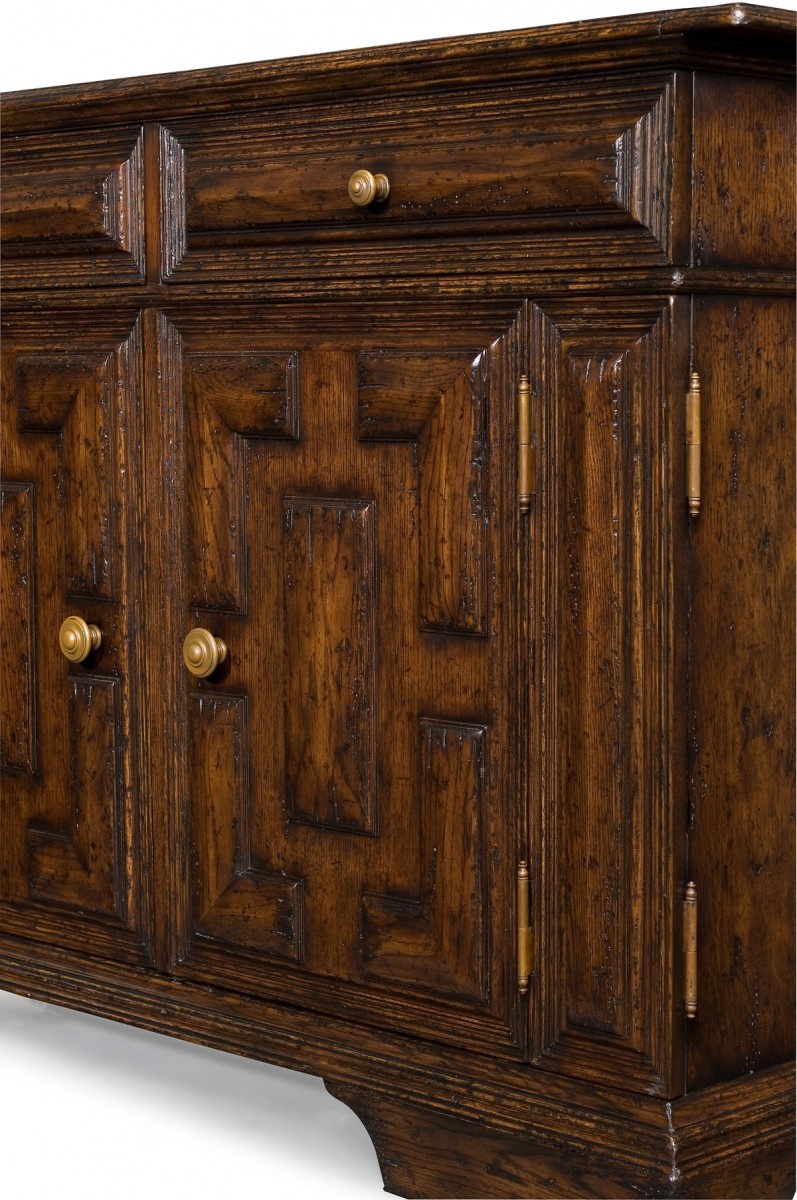 Tudor Oak sideboard from the American manufacturer Jonathan Charles. The model is equipped with two deep drawers and two doors. The case is made from natural wood with a weathered finish dark oak. The door panels are decorated with geometric patterns. Fittings made of patinated brass.