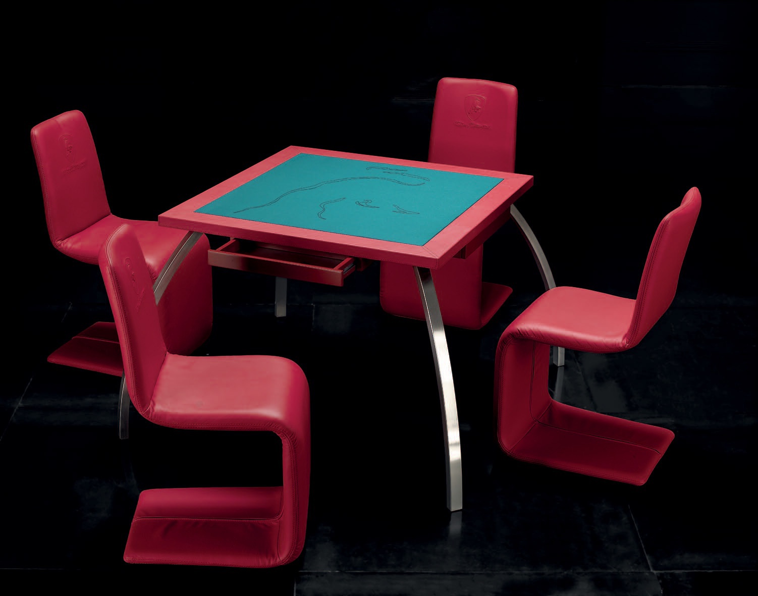 Poker game table from the Italian manufacturer Formitalia. The Tonino Lamborghini Collection. The finishing of leather. The legs are made of metal. Offers a wide range of colors.