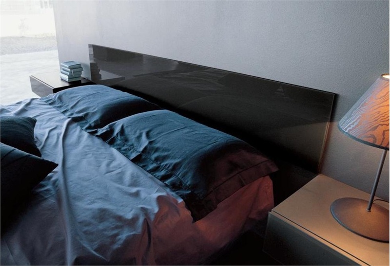 Double bed Fluttua R from Italian manufacturer Lago. The soaring modern design available in two versions: rectangular and round shape. The base is made of metal. Central support and fixing to the wall beds have a patented design; leg allows you to adjust the bed height even after installation. This hanging bed can withstand two people weighing up to 140 kg each during sleep and two people weighing up to 120 kg each, sitting on the edge. The holes in the frame made of high pressure laminate promote air circulation and provide natural ventilation of the mattress. Due to the lack of frame saves much space and easier cleaning. The bed is available with headboard glass, upholstery textile or eco-leather and Wildwood headboard that offers a warm wood texture. The design complements the built-in backlight and various shelves. Colors in the catalog range from the manufacturer.