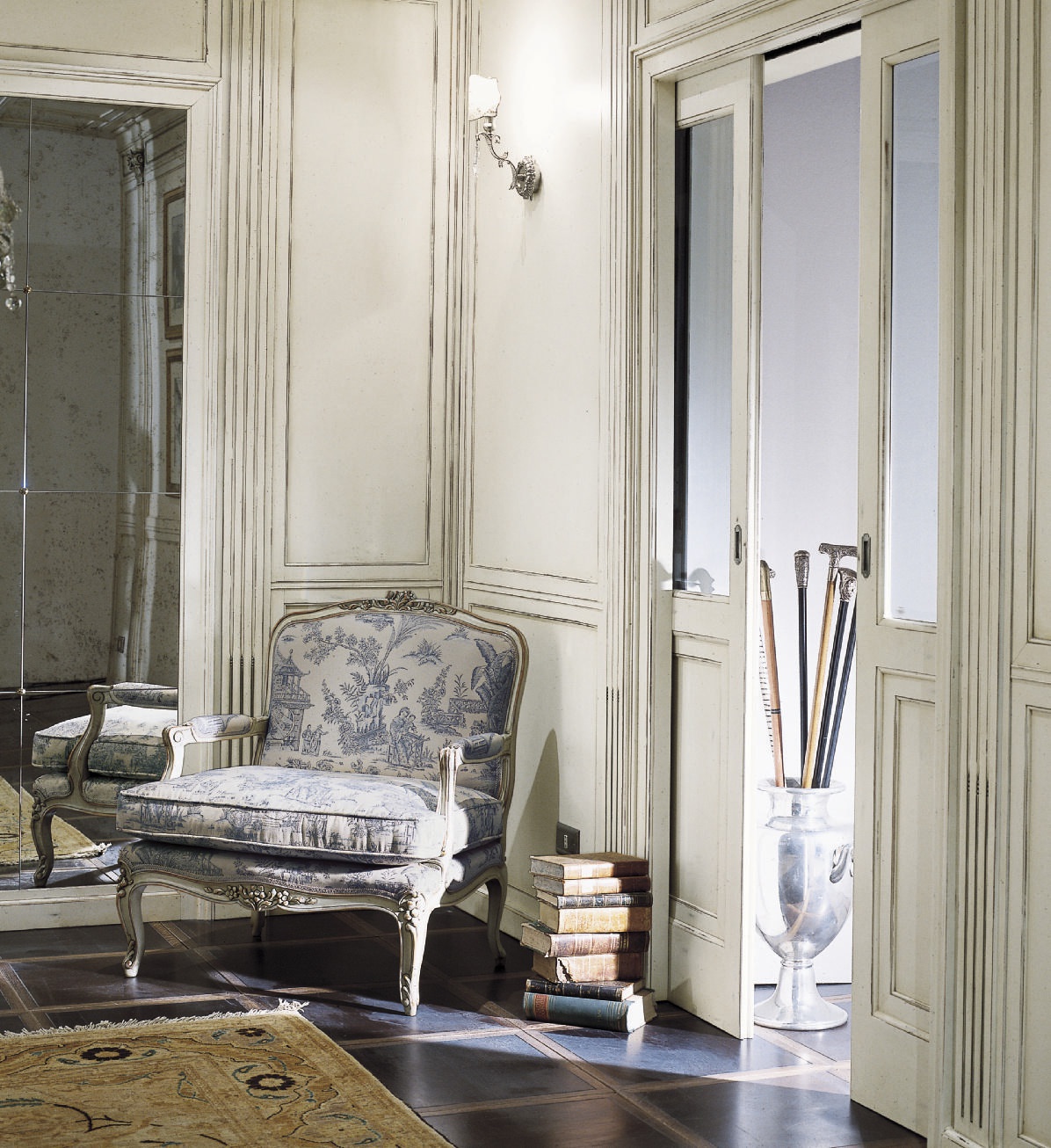 Chair Taormina Italian manufacturer Bizzotto. Presents a model of the chair is mounted on a wooden frame in fabric. The armrests, backrest and legs are decorated with hand-carved. The filler is polyurethane foam, upholstered in grey fabric with silver patterns. The classical solution for the interior of your living room or home library.