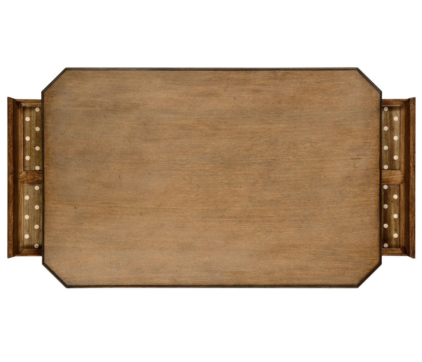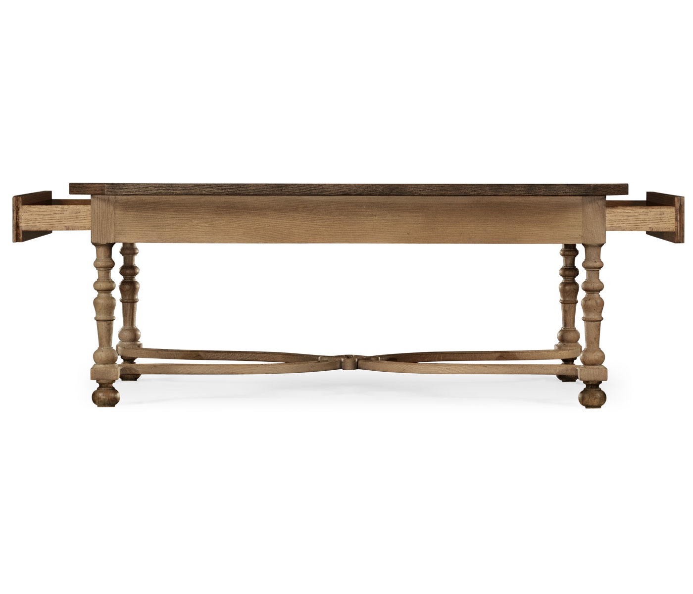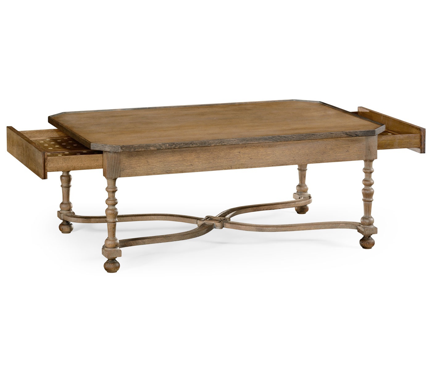 Coffee table from Ruthin American manufacturer Jonathan Charles. Rectangular model made of wood. Table has two hidden drawers. Legs are decorated with carvings.