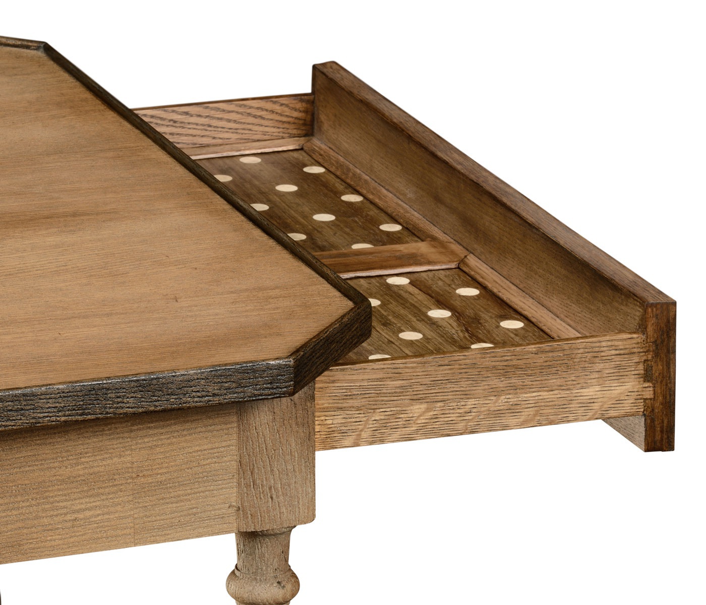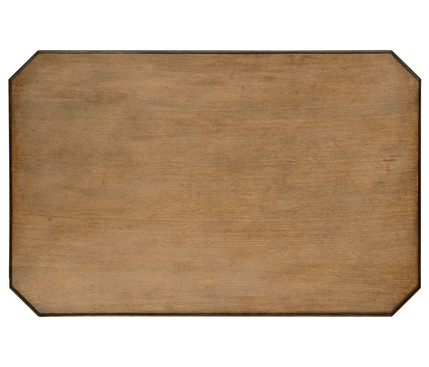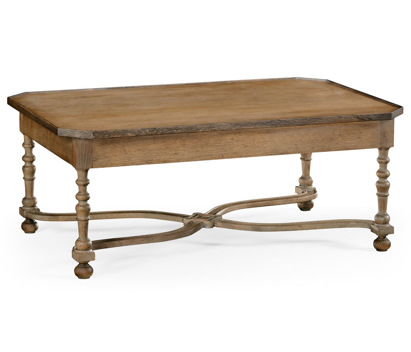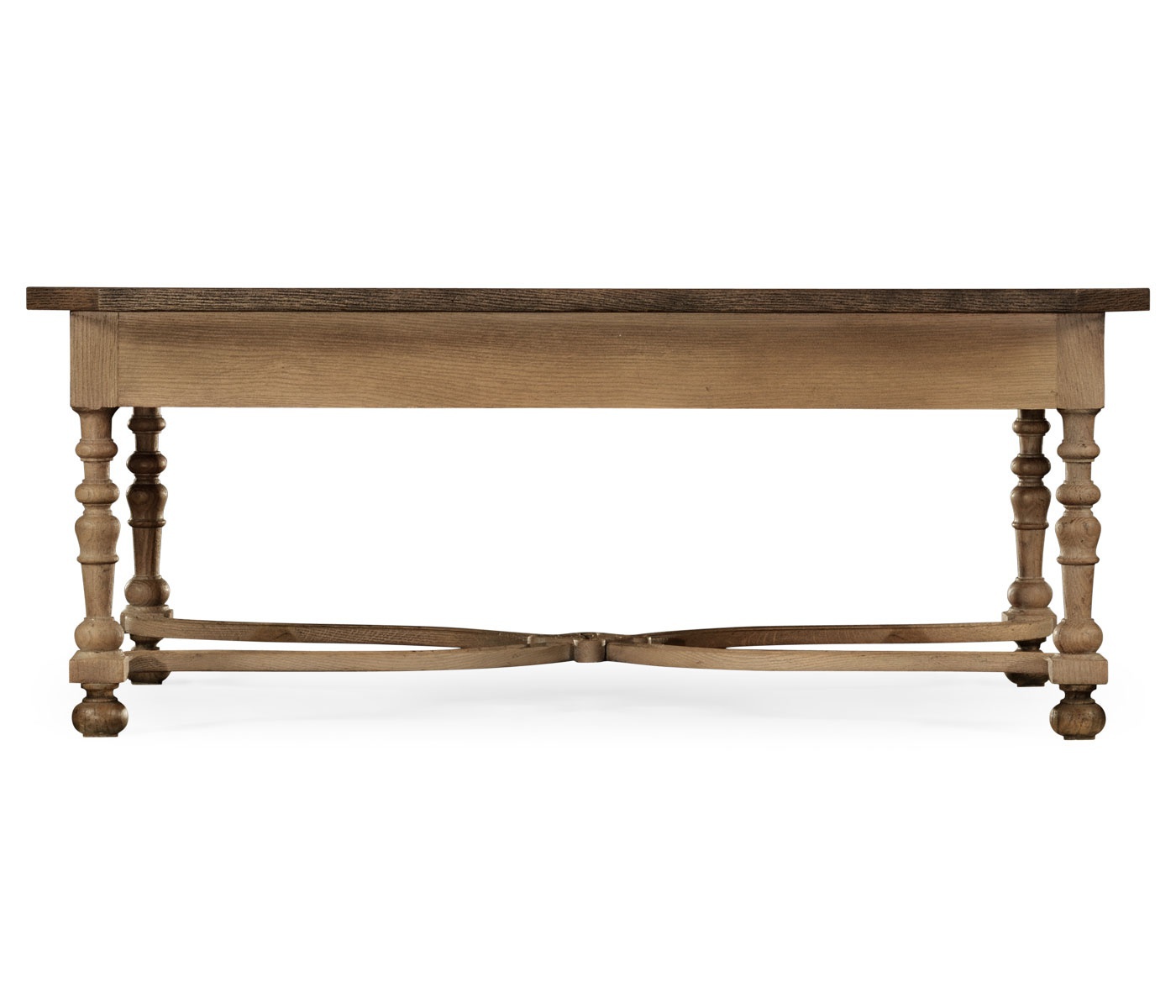 Coffee table from Ruthin American manufacturer Jonathan Charles. Rectangular model made of wood. Table has two hidden drawers. Legs are decorated with carvings.