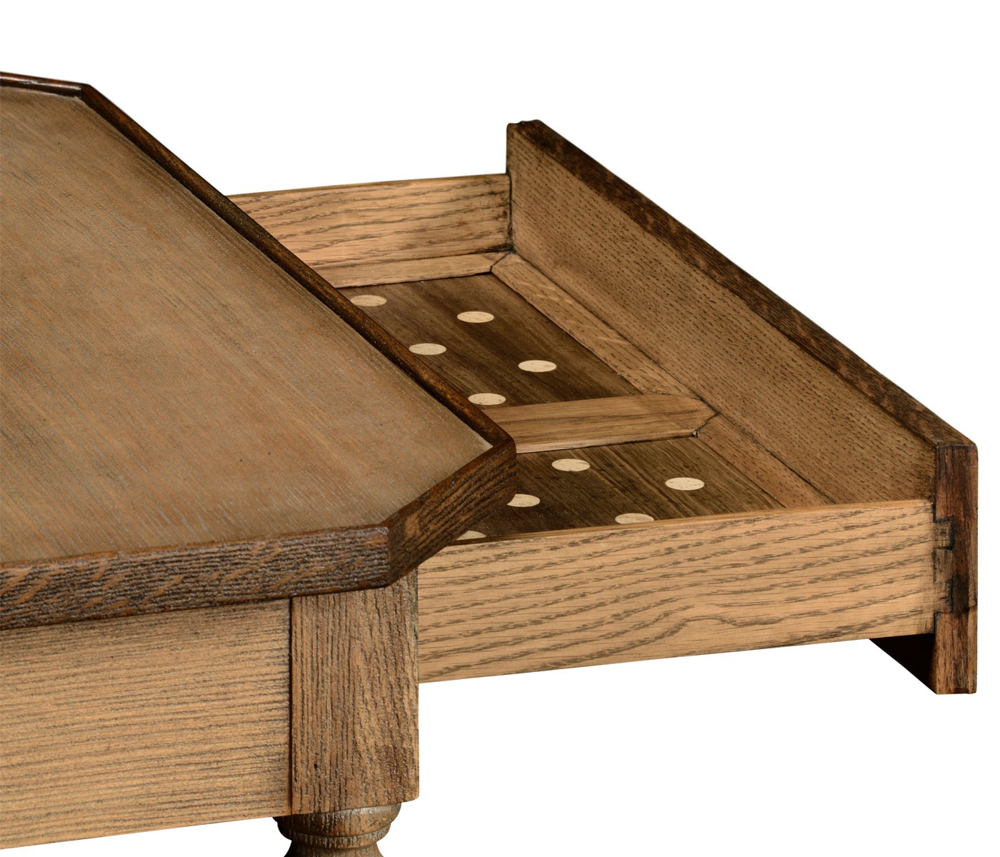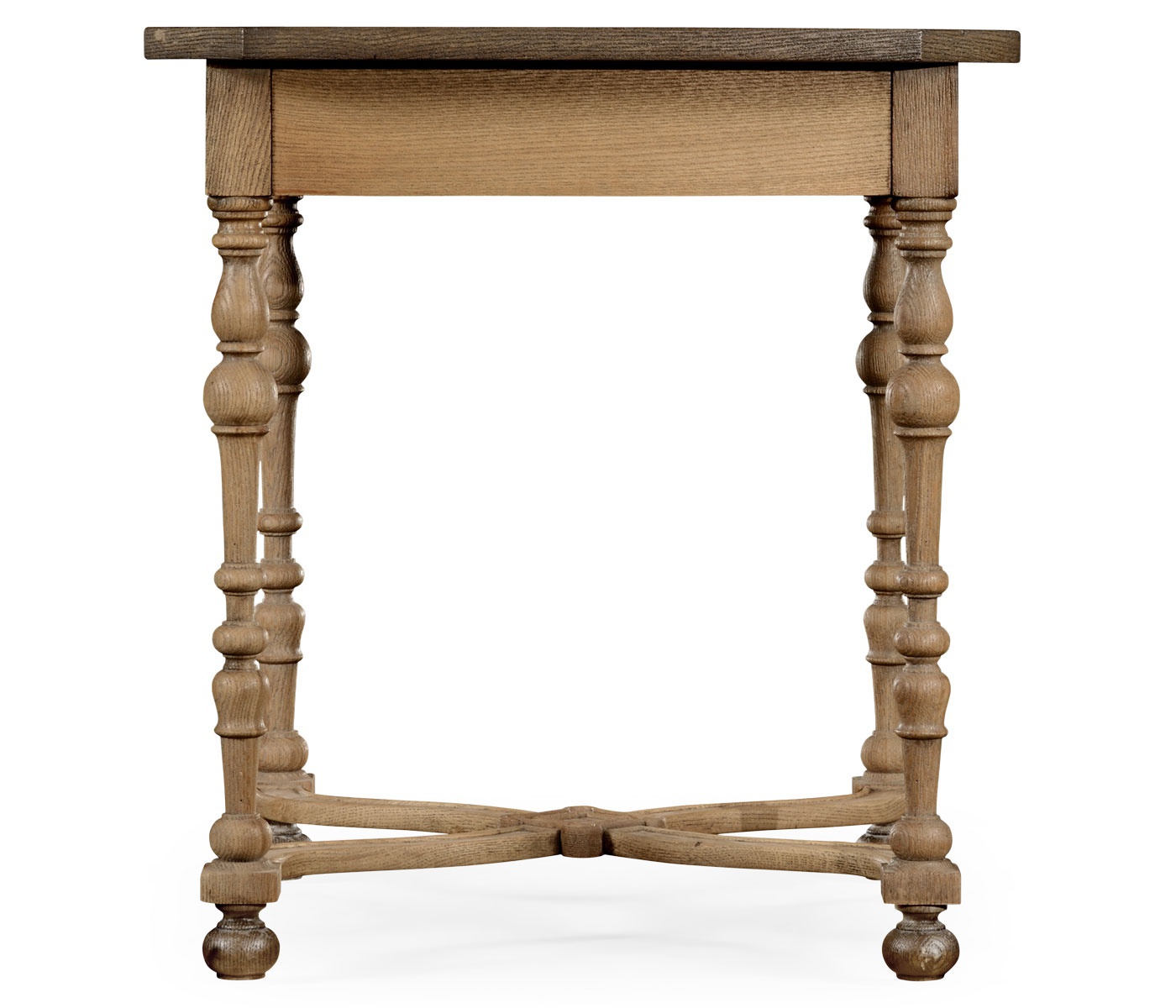 Coffee table from Ruthin American manufacturer Jonathan Charles. Model with a square table top made of natural wood with antique finishes. A table equipped with a drawer. Carved legs. The design is executed in a rustic style.