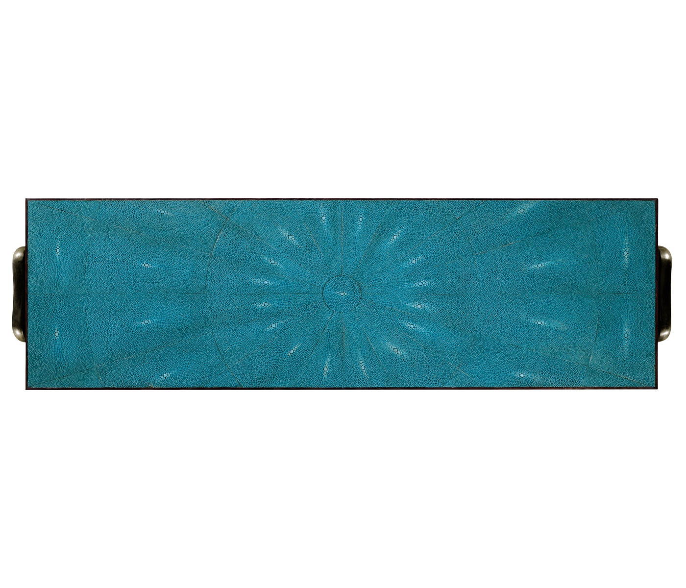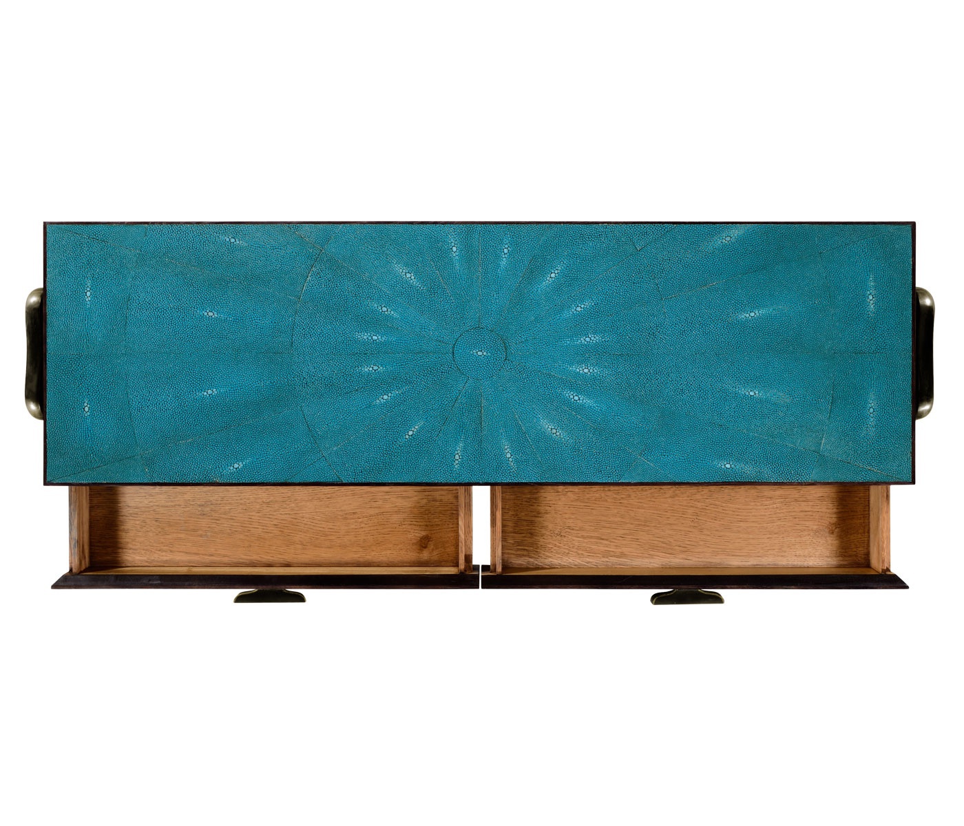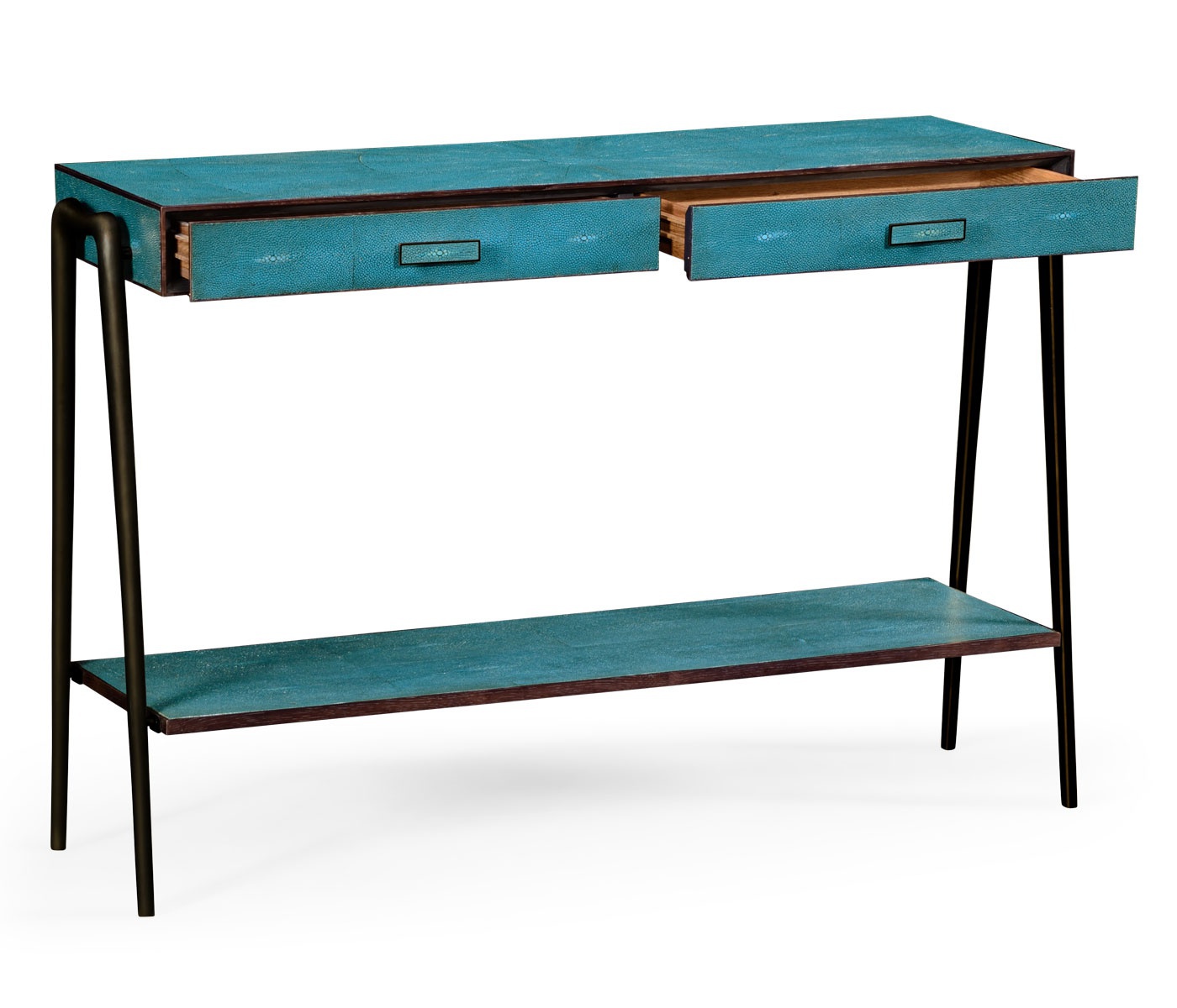 The Luxe console from an American manufacturer Jonathan Charles. The model of rectangular form fitted with two drawers and a shelf. The console is made of wood and trimmed in faux shagreen turquoise. The legs are made of bronze. The model is inspired by the design of the 1930-ies.
