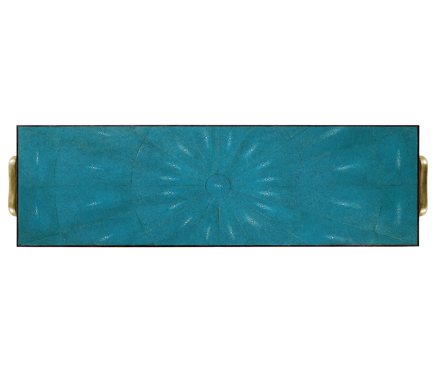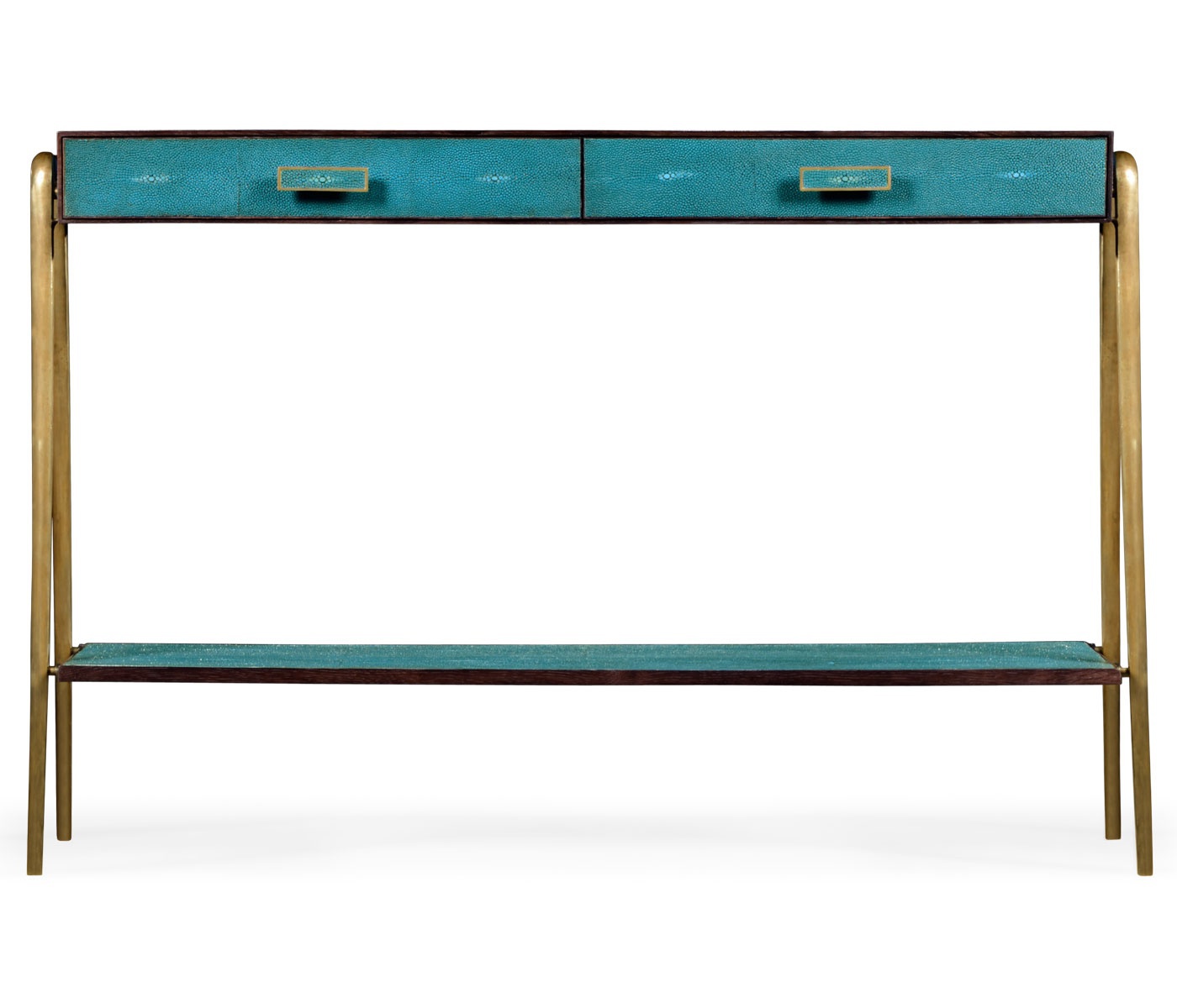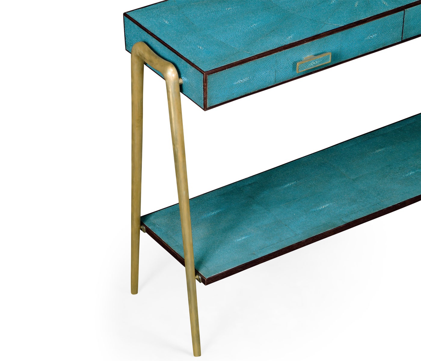 The Luxe console from an American manufacturer Jonathan Charles. The model of rectangular form fitted with two drawers and a shelf. The console is made of wood and trimmed in faux shagreen turquoise. The legs are made of brass. The model is inspired by the design of the 1930-ies.