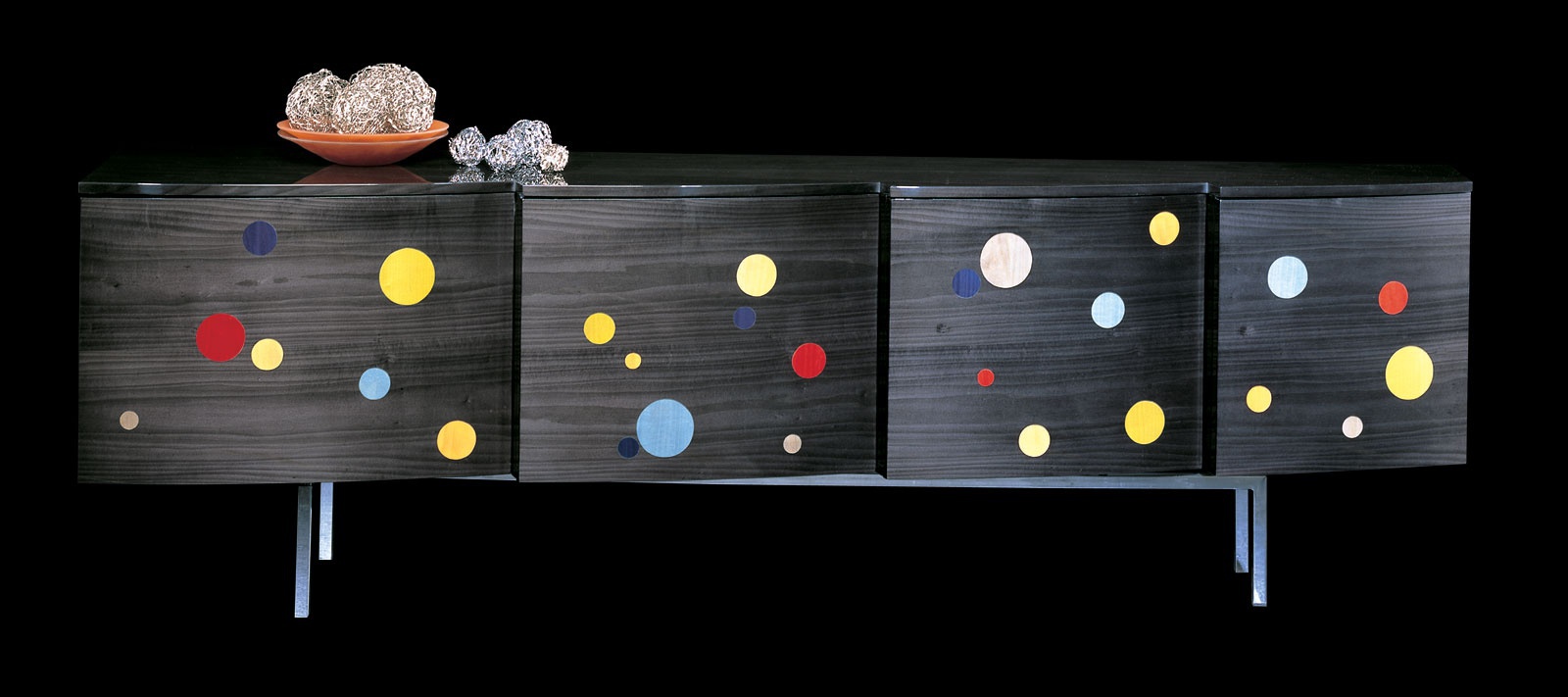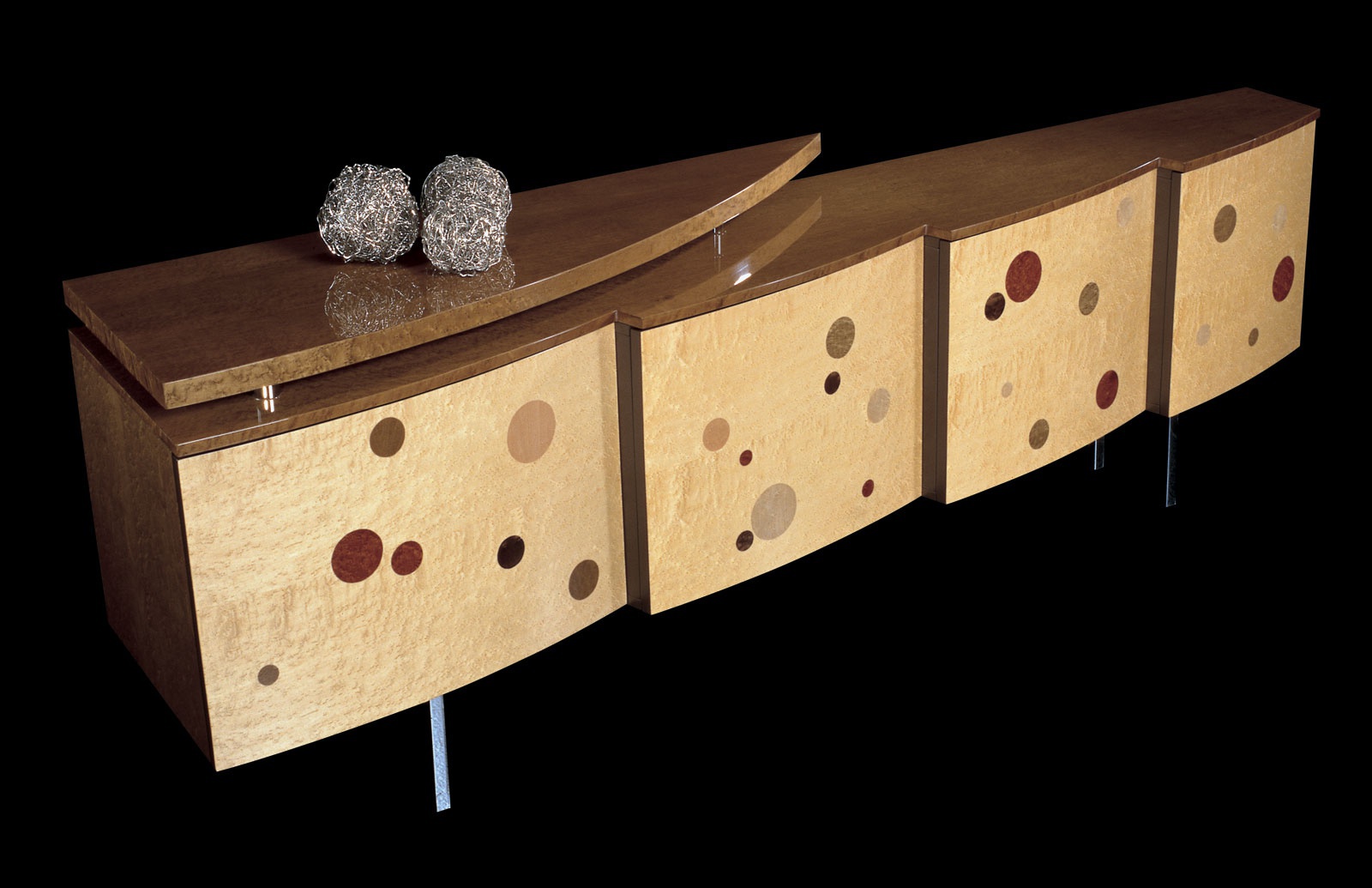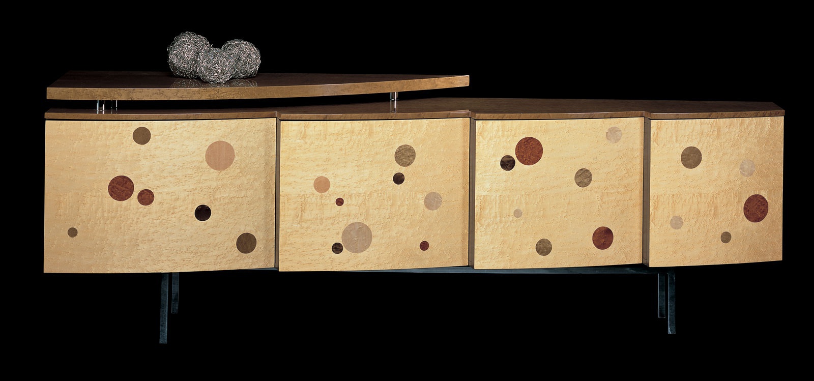 David Curvo curbstone from the Italian manufacturer Il Loft. Made of MDF and veneer, varnished wood, with legs made of metal. The model with four hinged doors. Self-opening push - pull (opening the press). Colours in stock. The modern design.