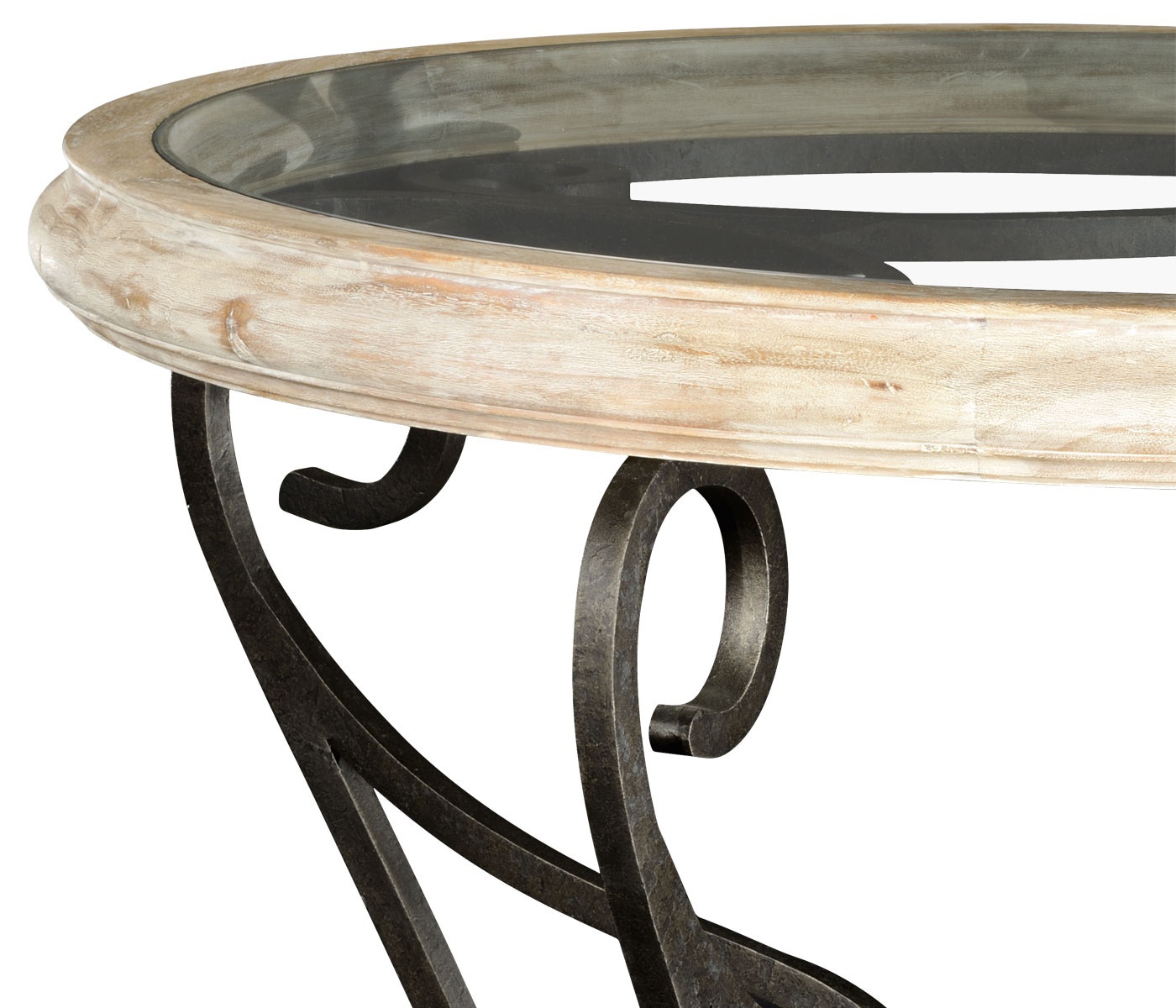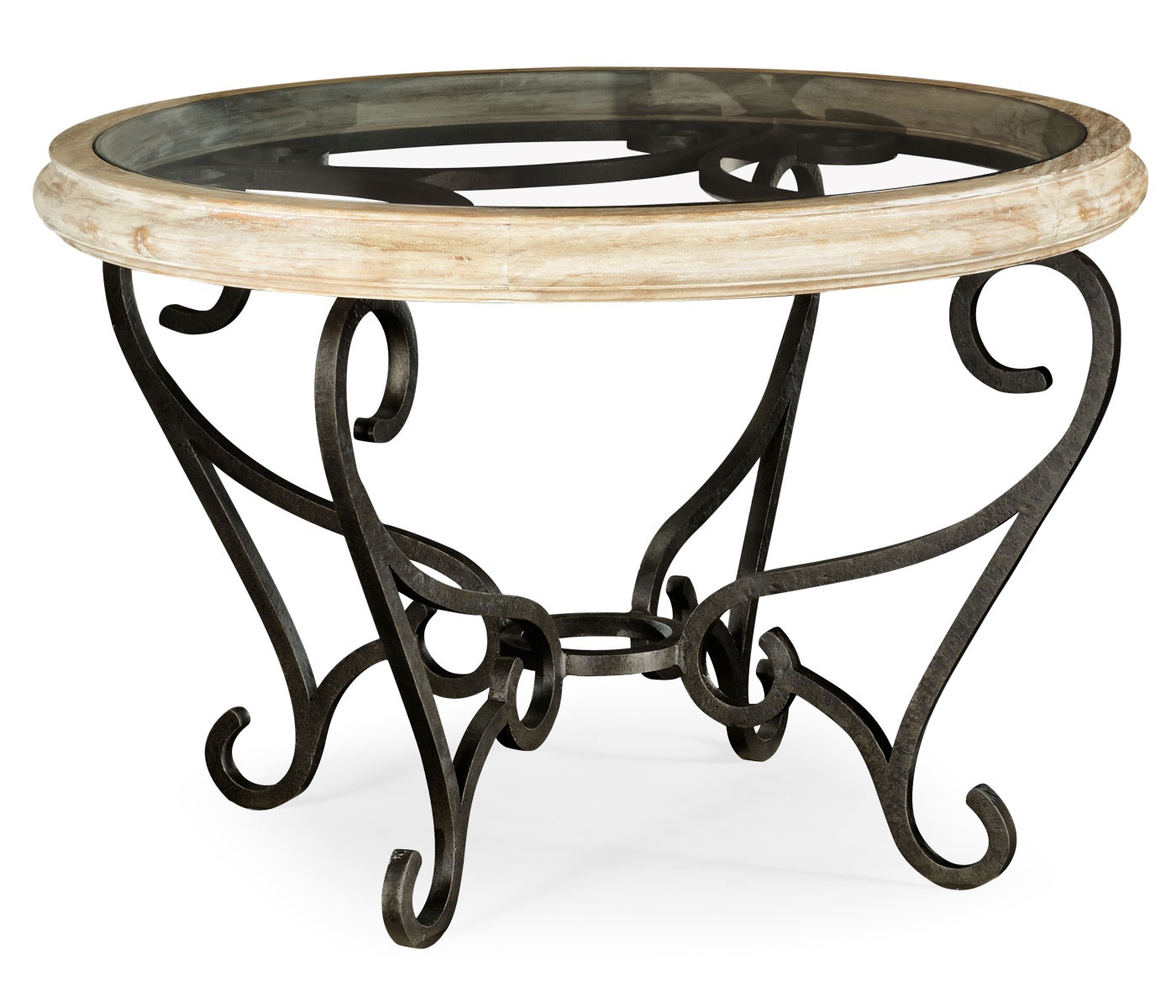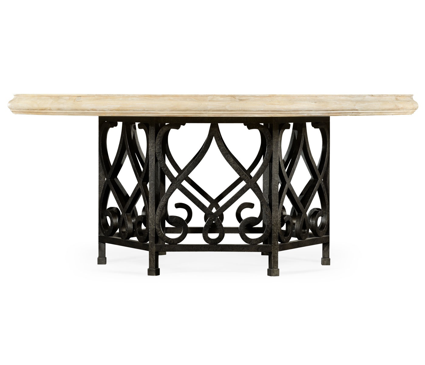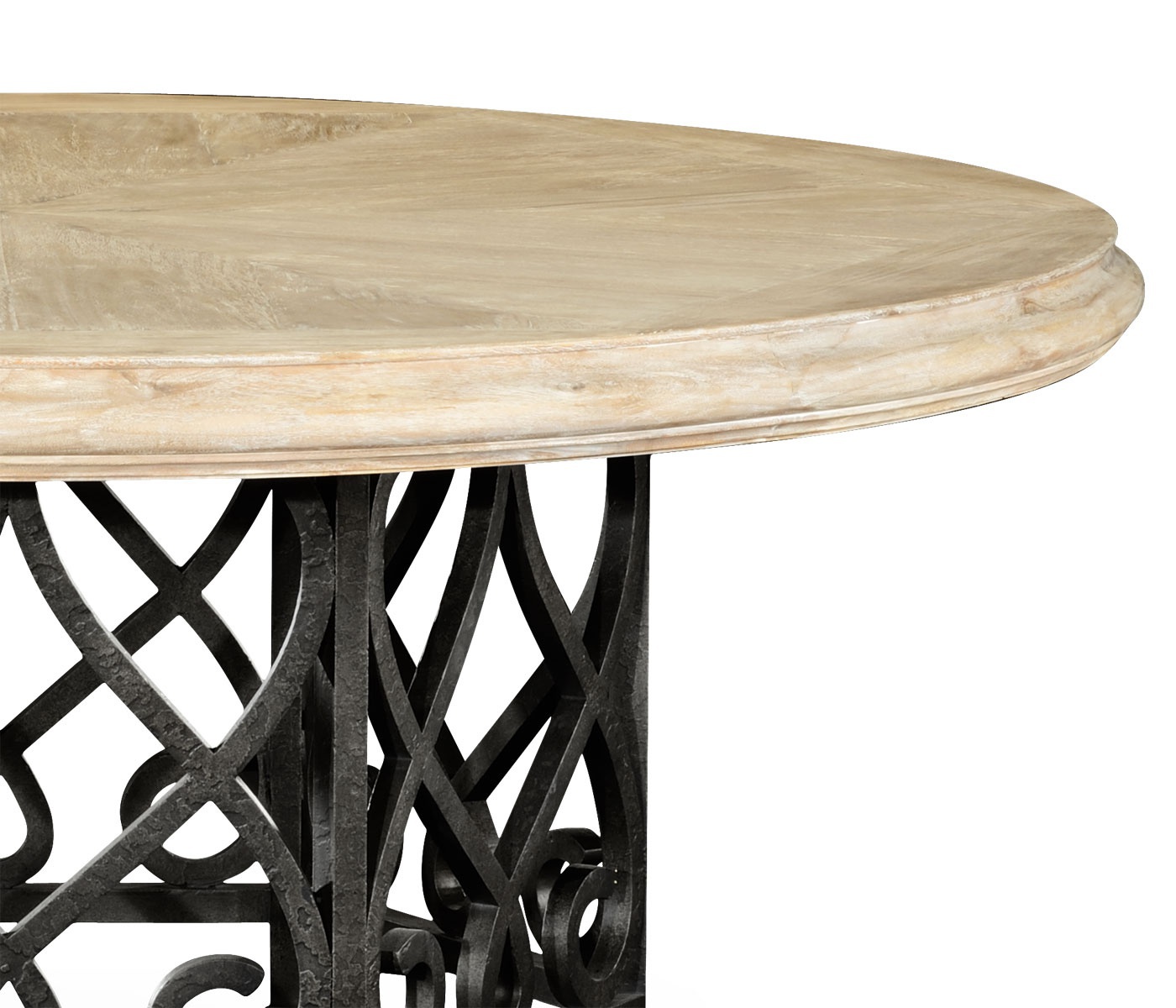 Dining table American Artisan from the manufacturer Jonathan Charles. Model with a round top on hexagonal pillar of wrought iron. Massive table top made of natural wood. Support with an openwork pattern in the Rococo style.
