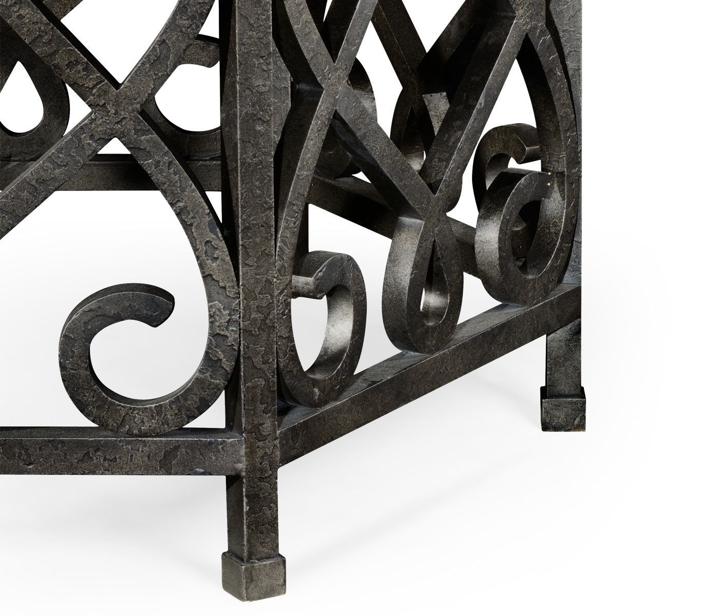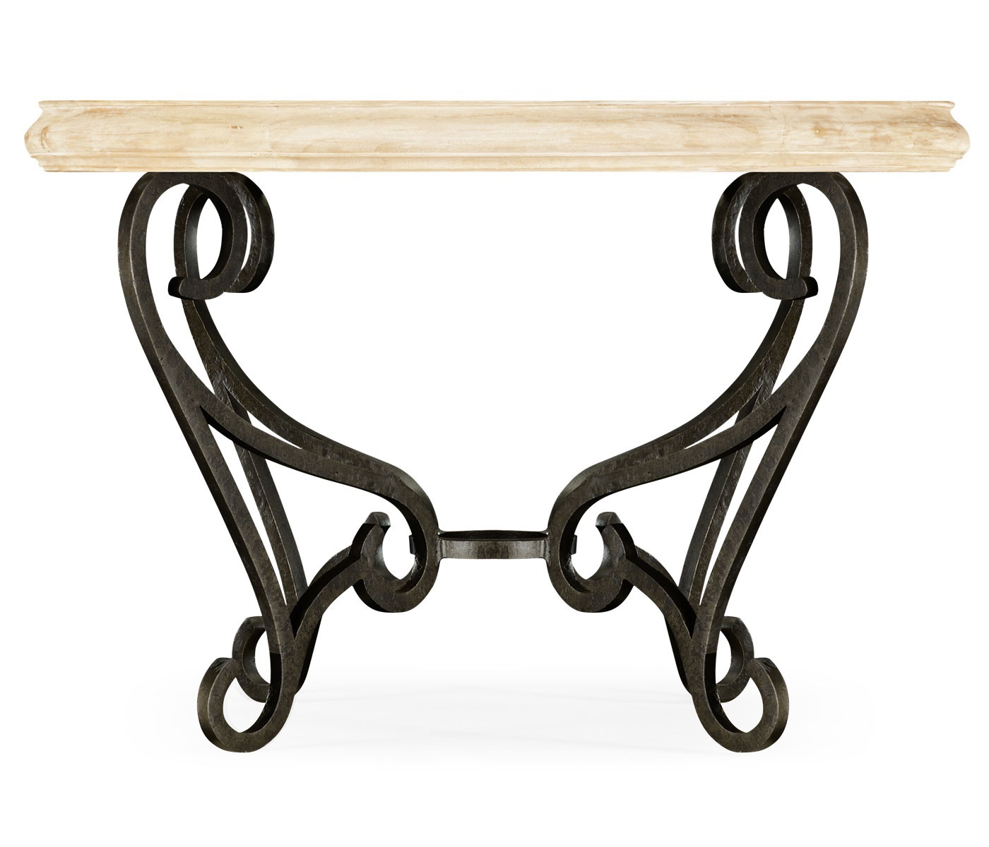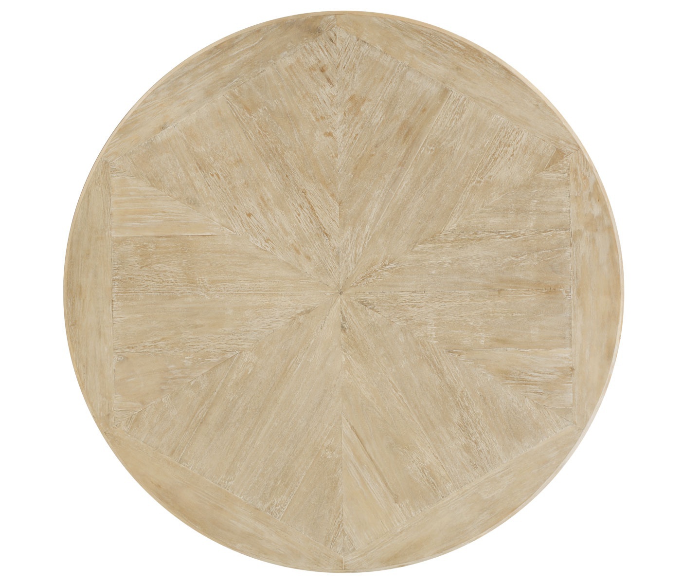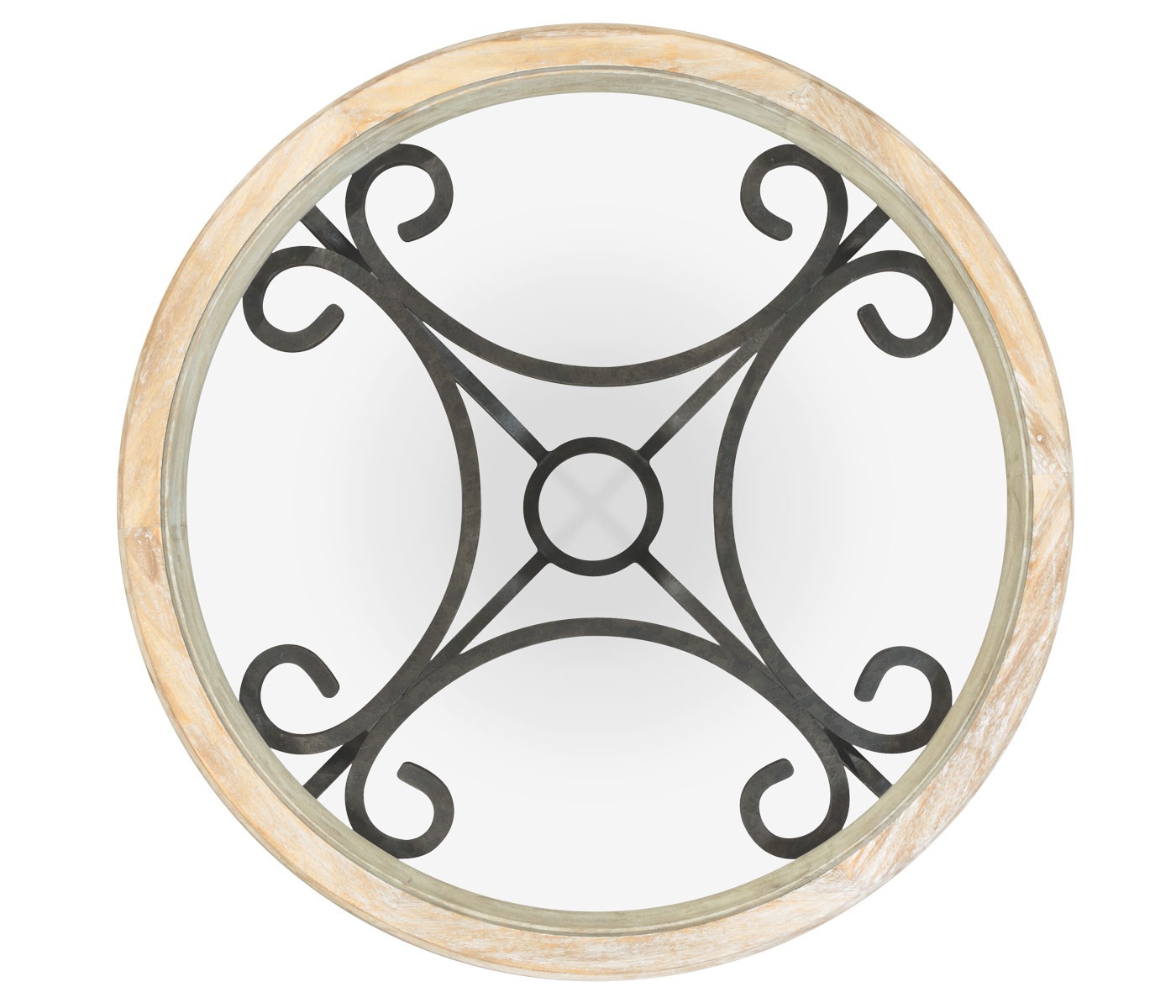 Dining table American Artisan from the manufacturer Jonathan Charles. Model with a round top on hexagonal pillar of wrought iron. Massive table top made of natural wood. Support with an openwork pattern in the Rococo style.