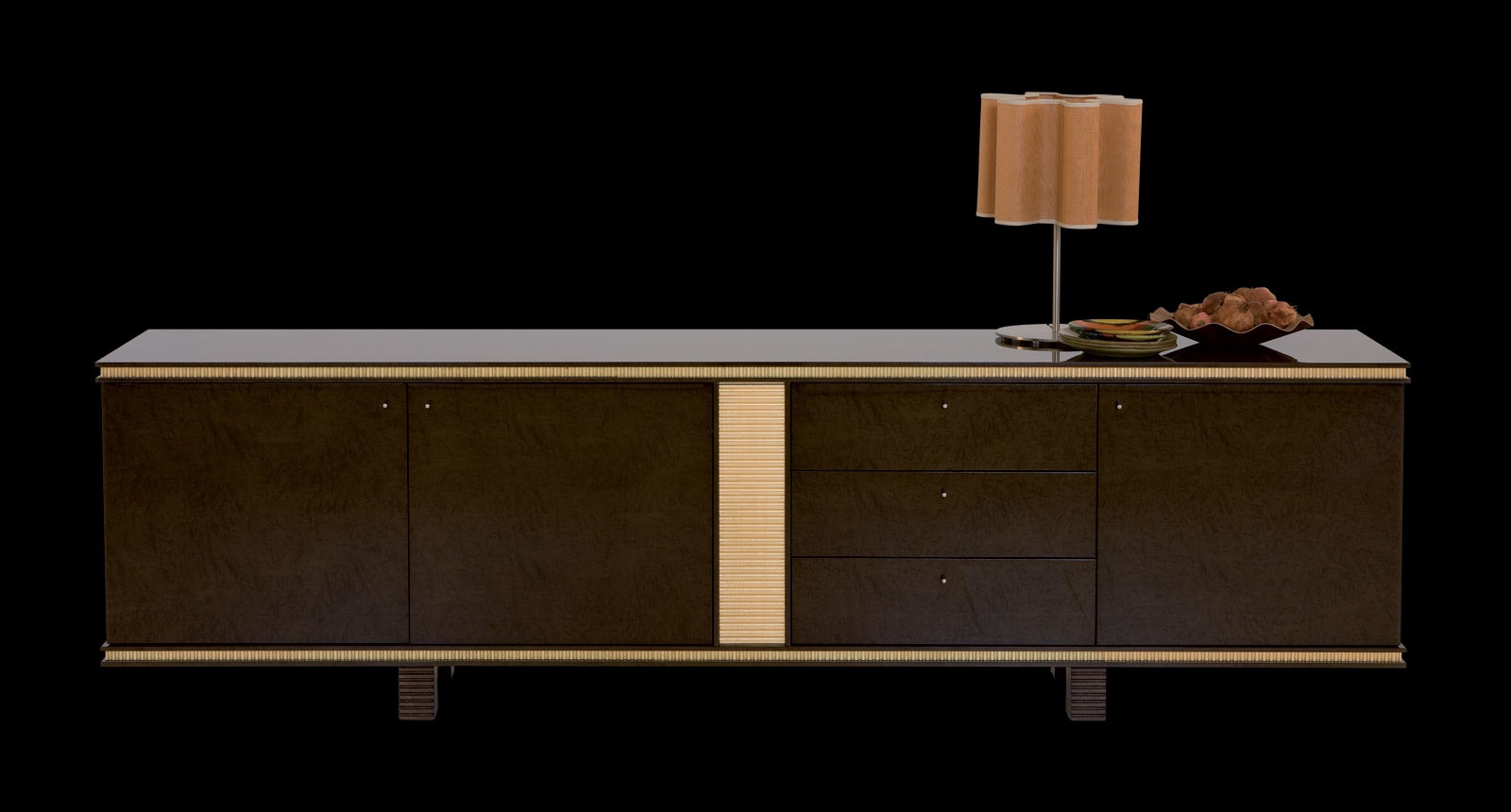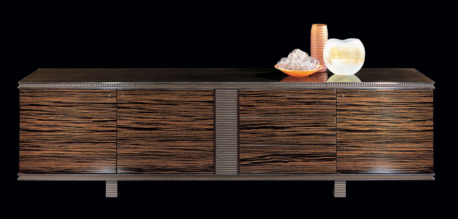 case: walnut tree accessories: metal coating: veneer legs, base, top: carved the surface: lacquered |