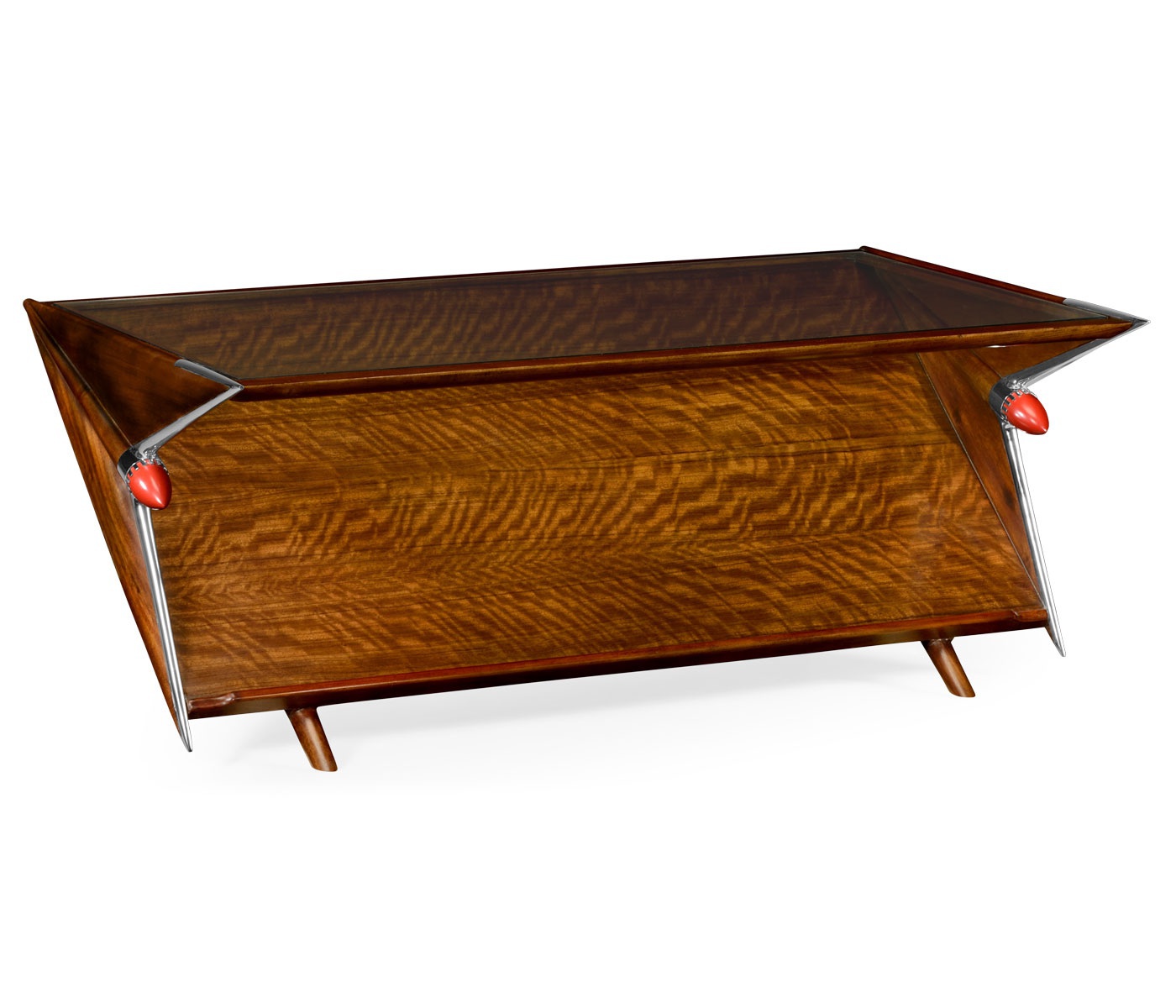 Table Detroit from the American manufacturer Jonathan Charles. The model is of an unusual shape with glass top. The frame is made from natural wood and finished with veneer. Model design inspired by the 1950-ies in America.