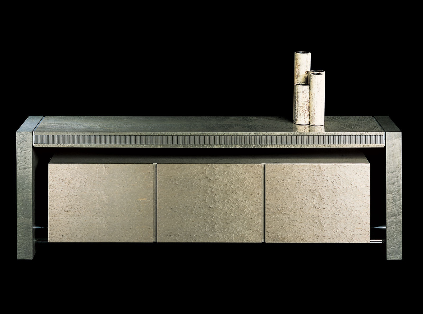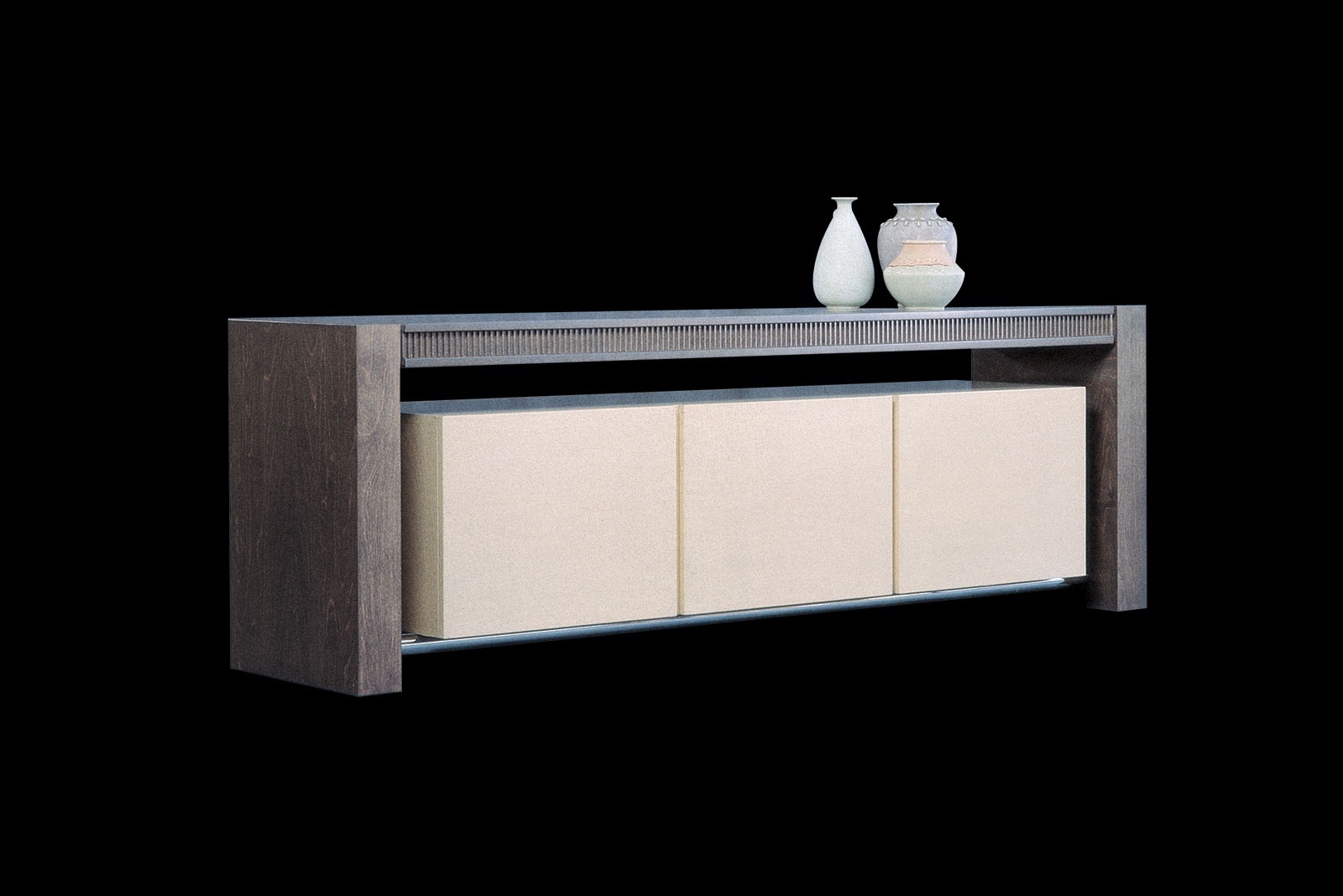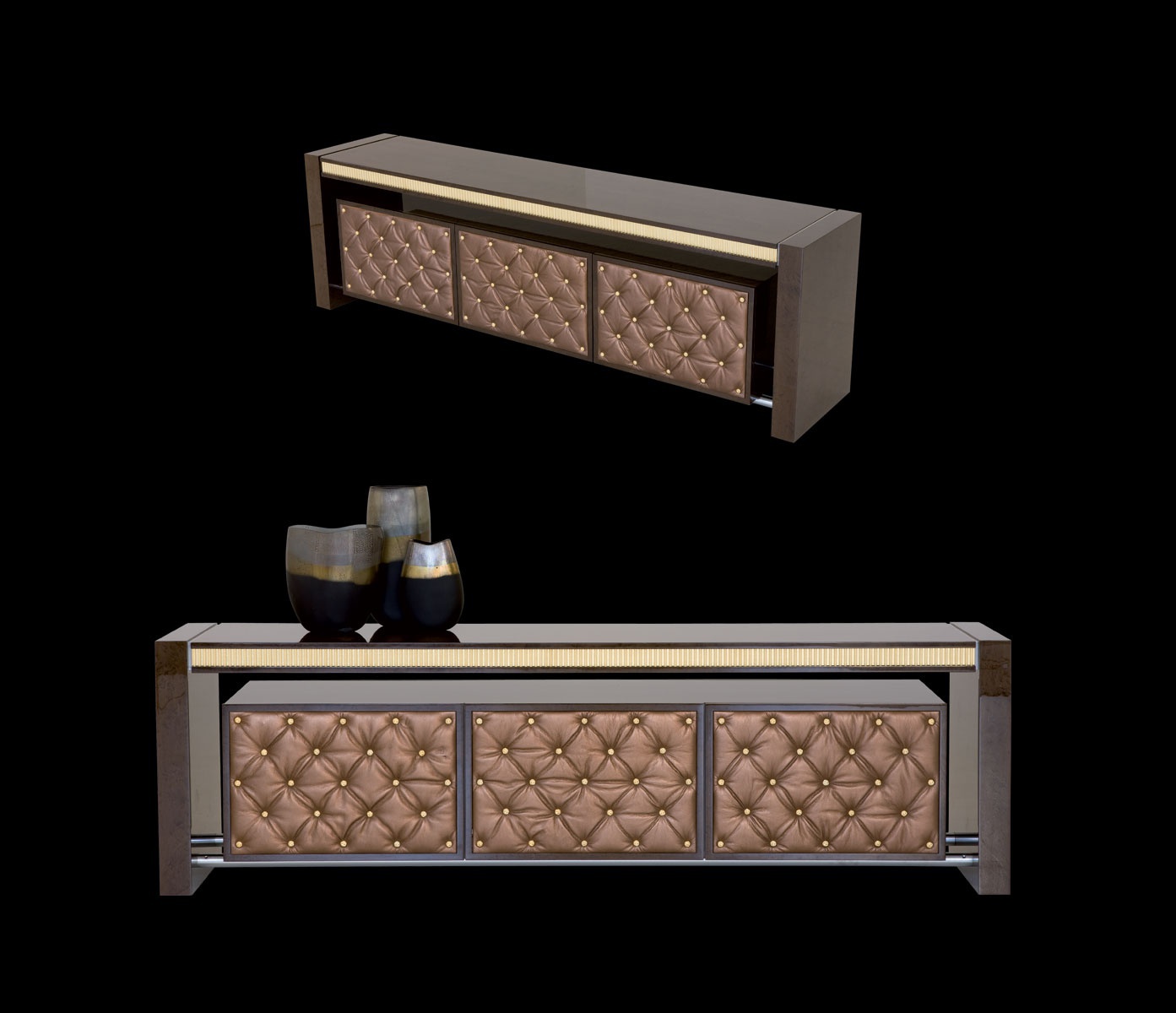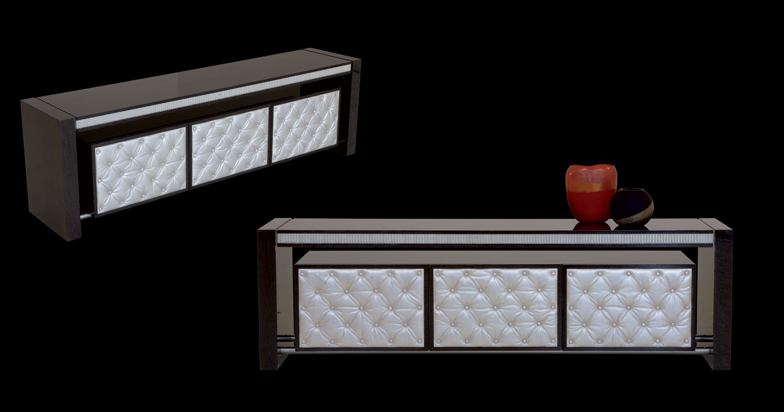 Ruthy stand from Italian manufacturer Il Loft. The model with carved accents. The frame is made of natural wood with three compartments. The doors are decorated with upholstery Capito or painting. Made in a modern style. Color in stock.