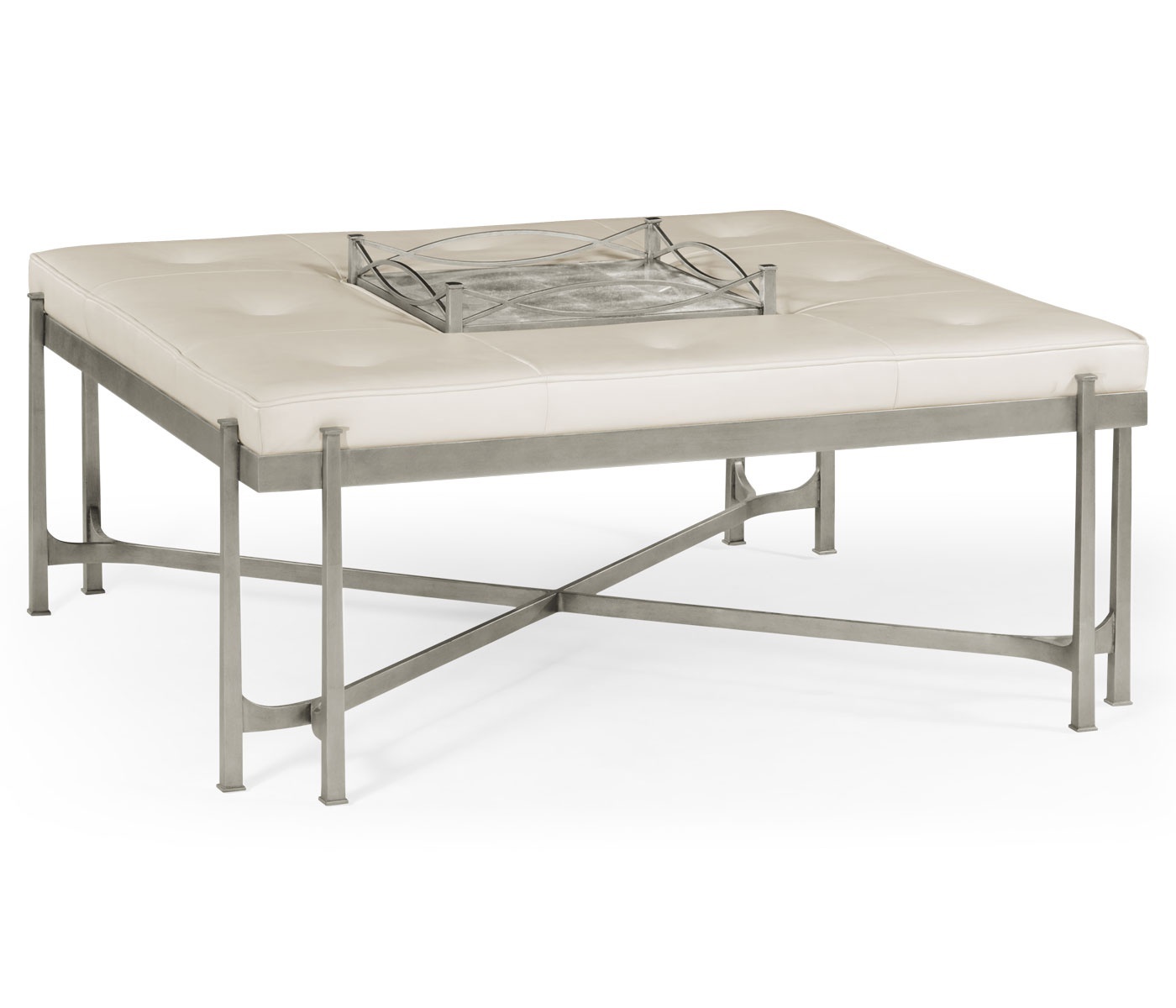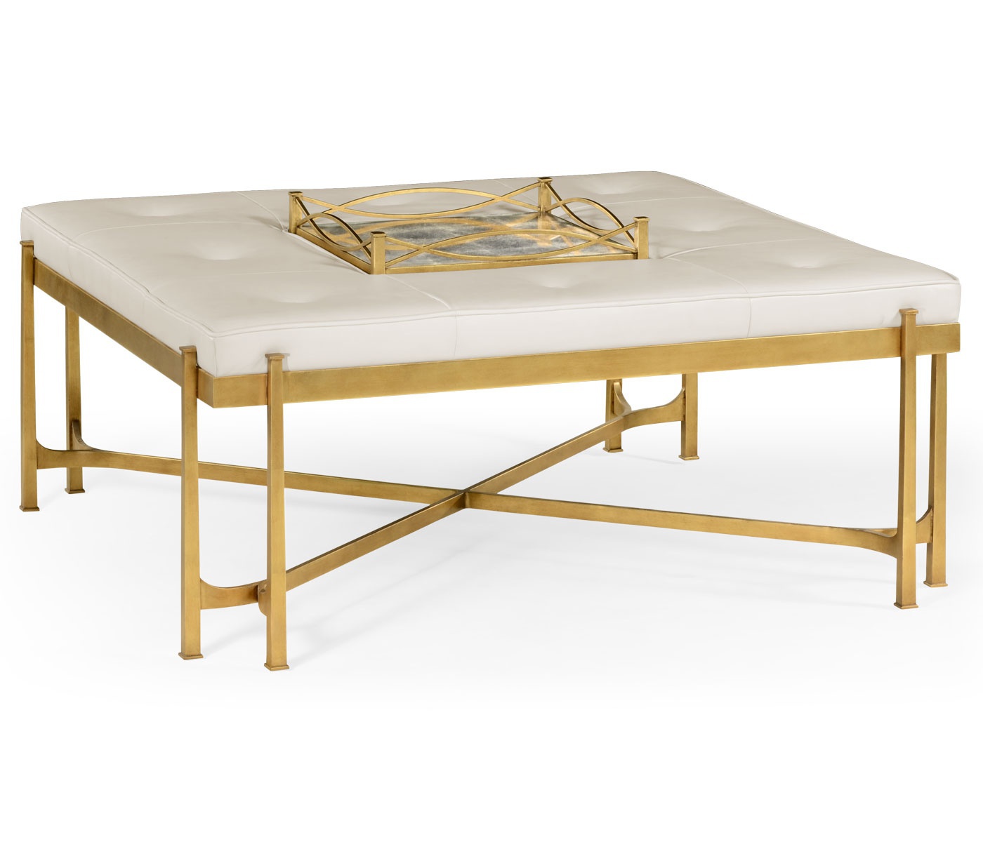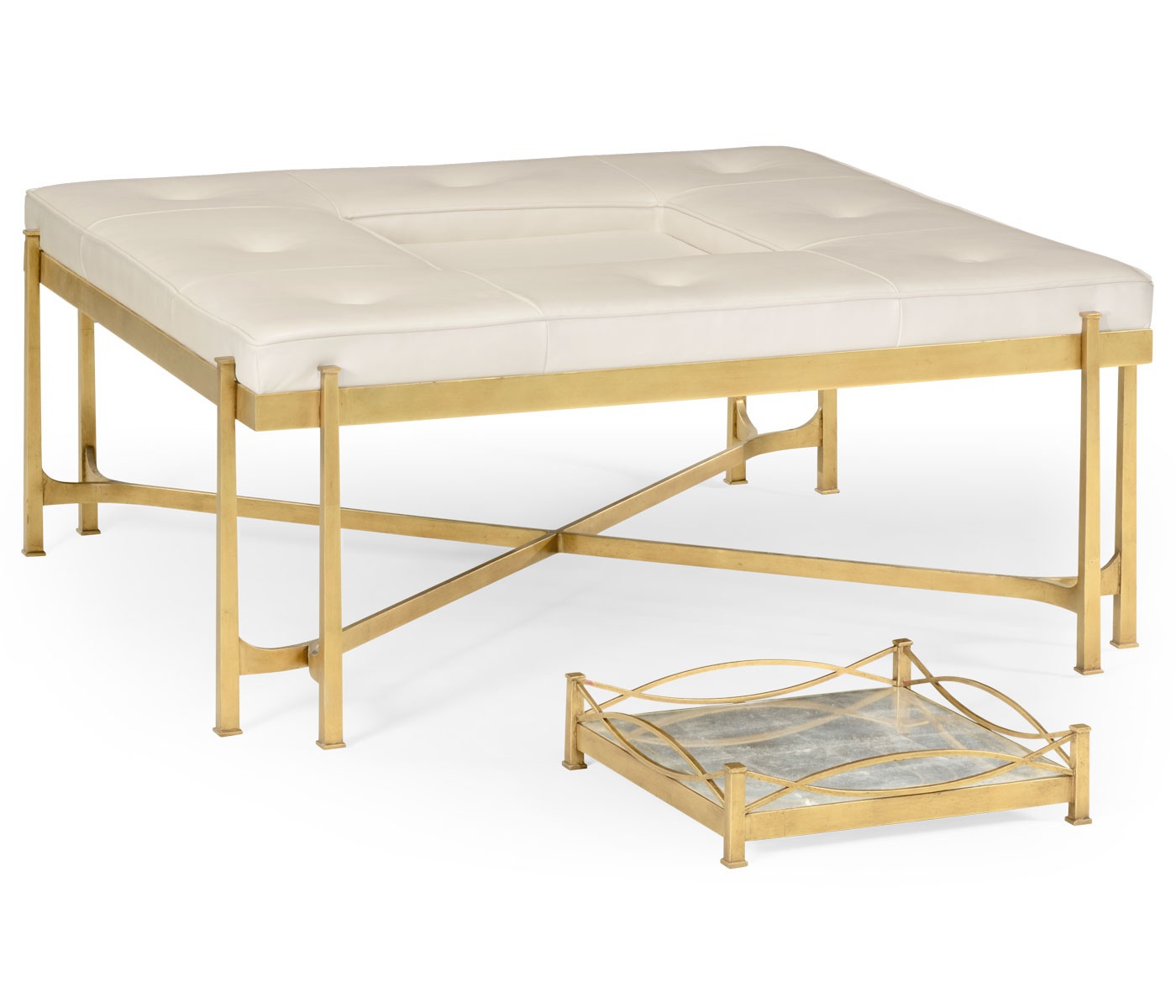 Poof table Luxe from American producer Jonathan Charles. A model with a frame of iron. Finishes frame available in gold, silver and bronze. Upholstery made of leather in white color. Removable tray with engraved glass countertop in an openwork frame of iron.