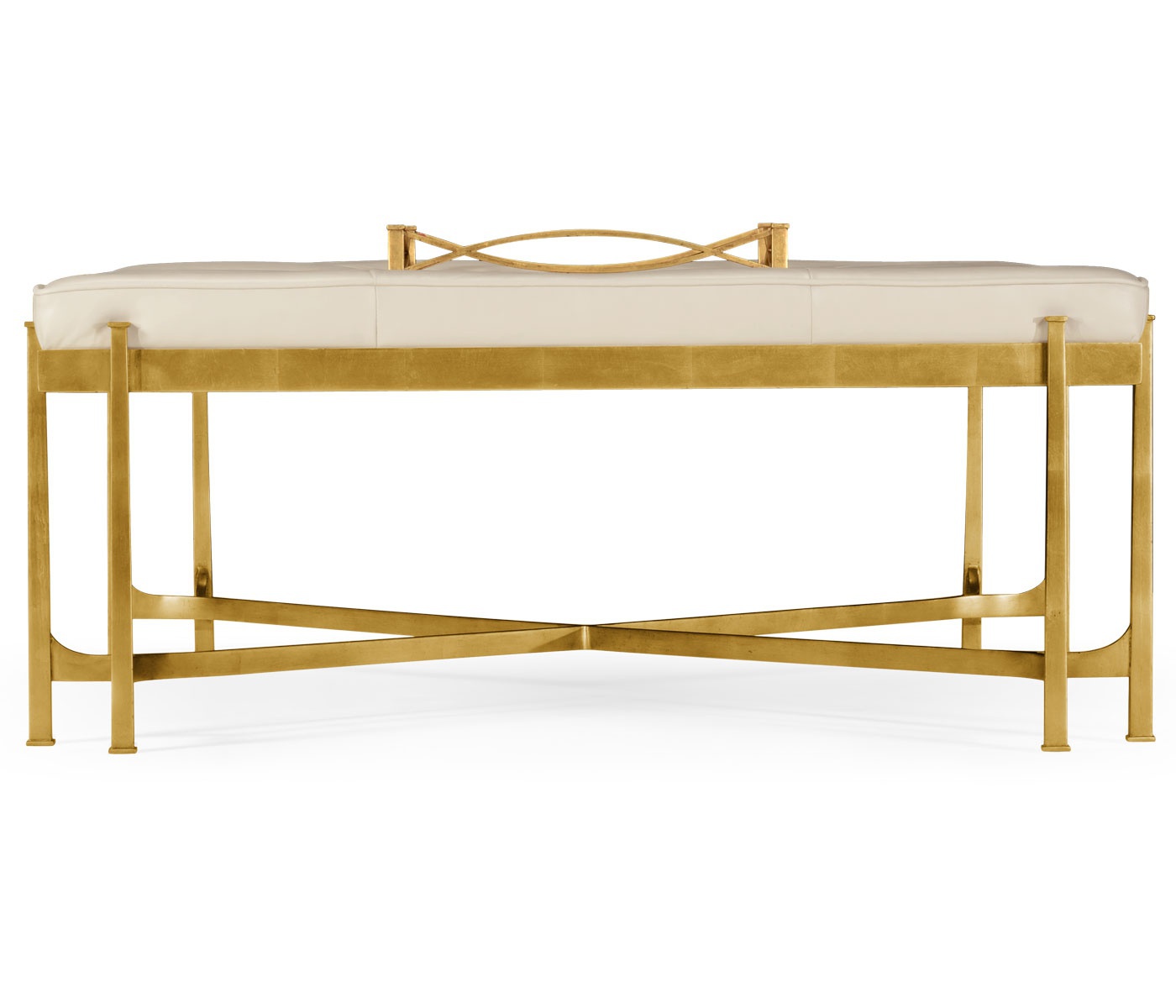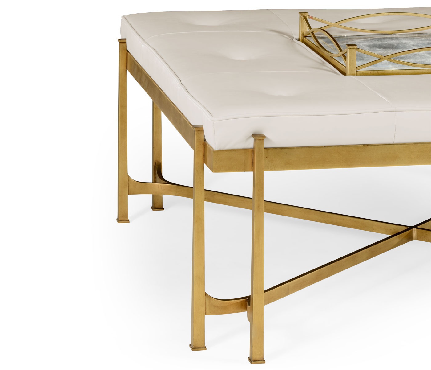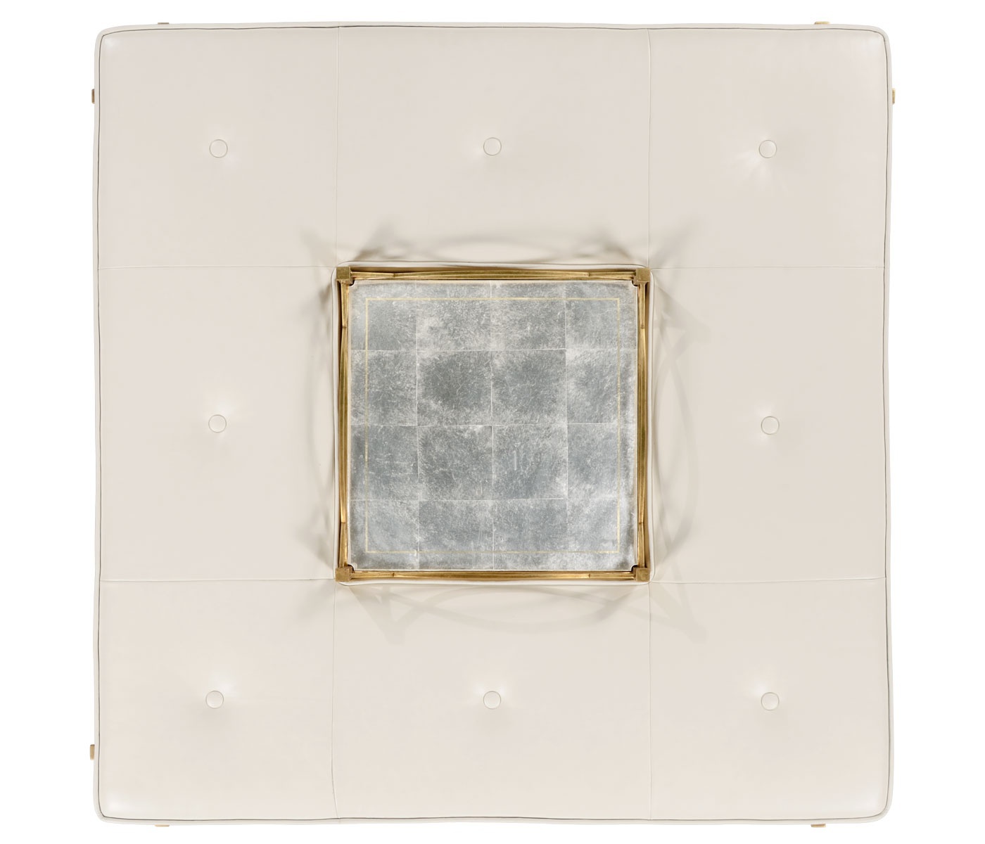 Poof table Luxe from American producer Jonathan Charles. A model with a frame of iron. Finishes frame available in gold, silver and bronze. Upholstery made of leather in white color. Removable tray with engraved glass countertop in an openwork frame of iron.