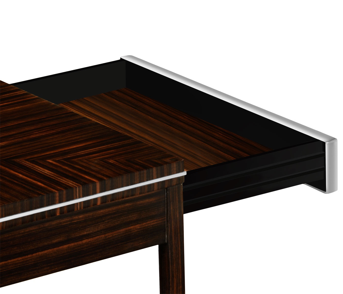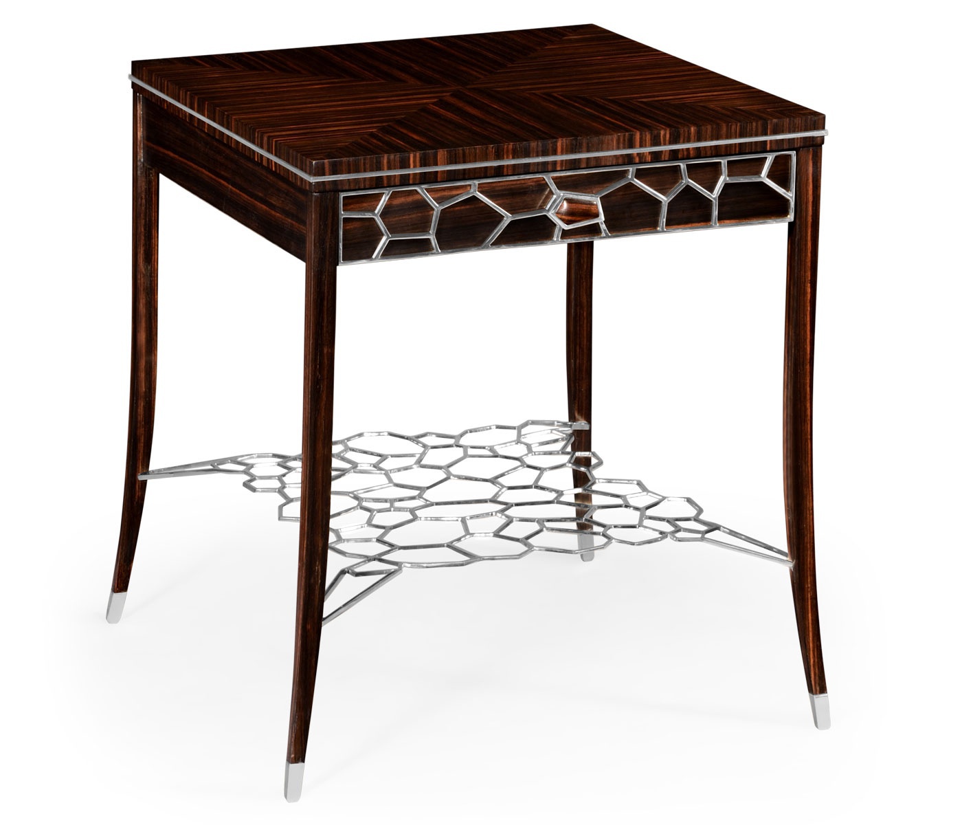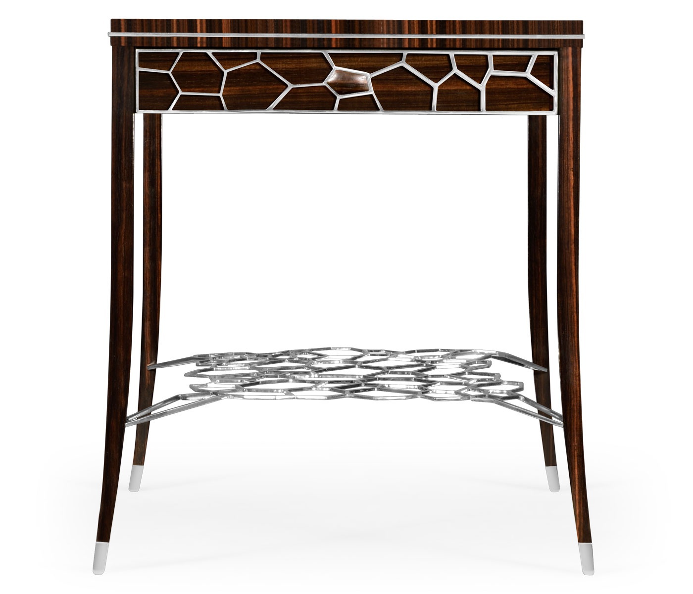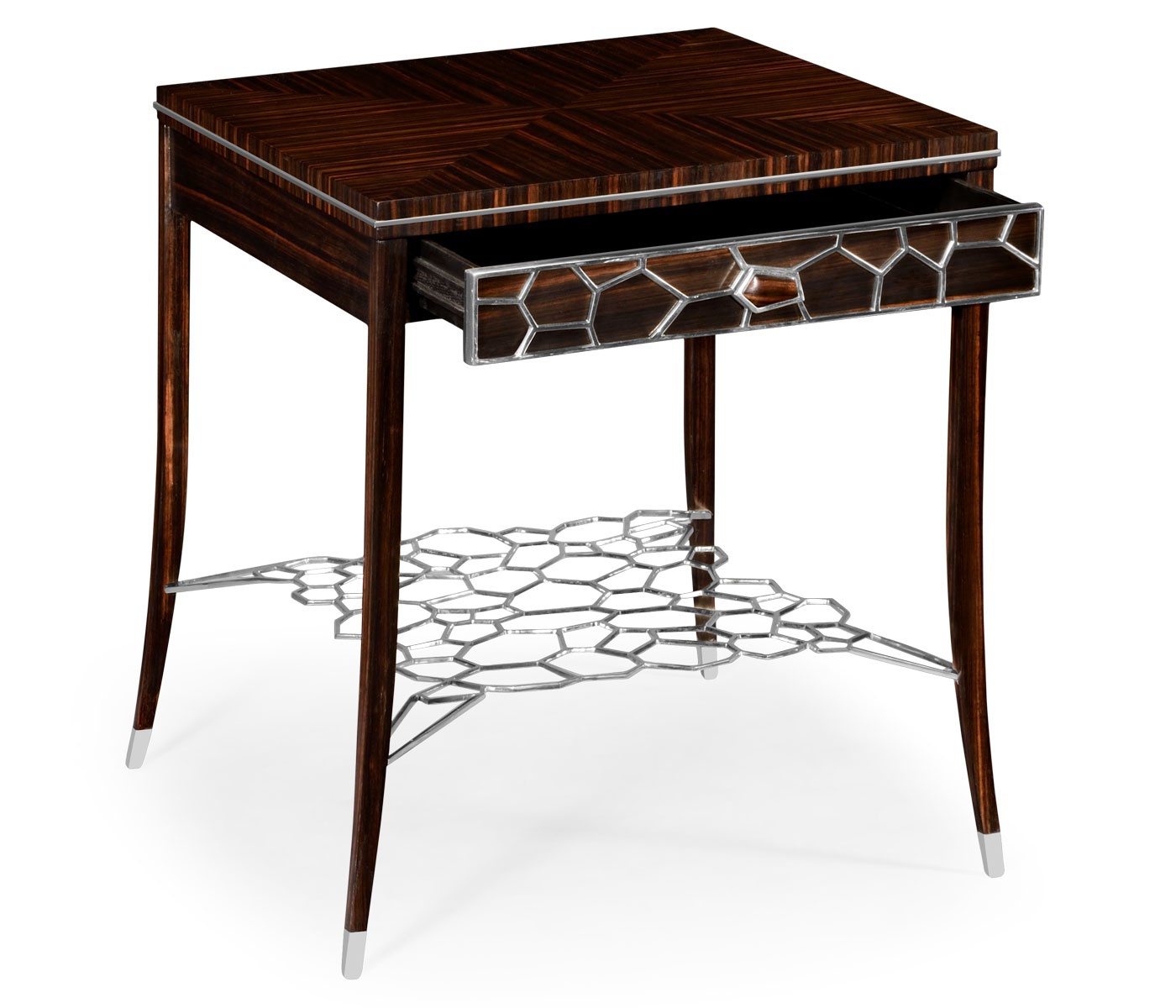 Soho table from the American manufacturer Jonathan Charles. Coffee table with a rectangular top with slightly curved legs is equipped with a drawer and shelf. Shelf made of white brass in the form of a braided network. The model is inspired by French design of 1950-ies.