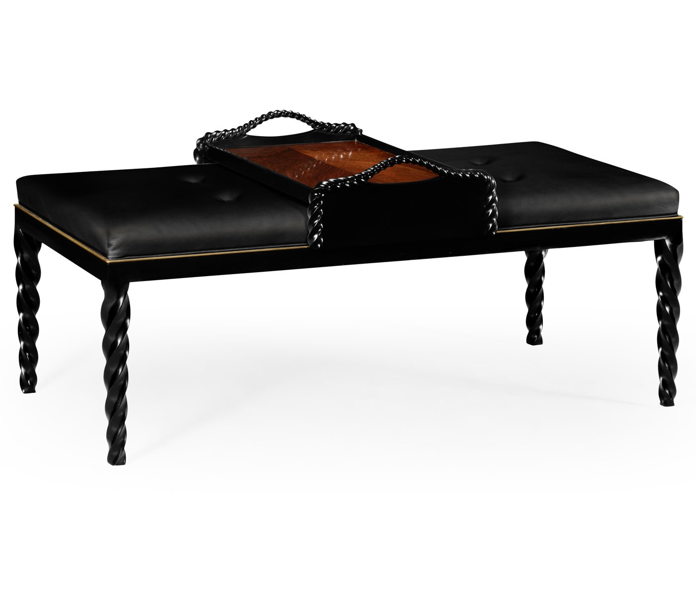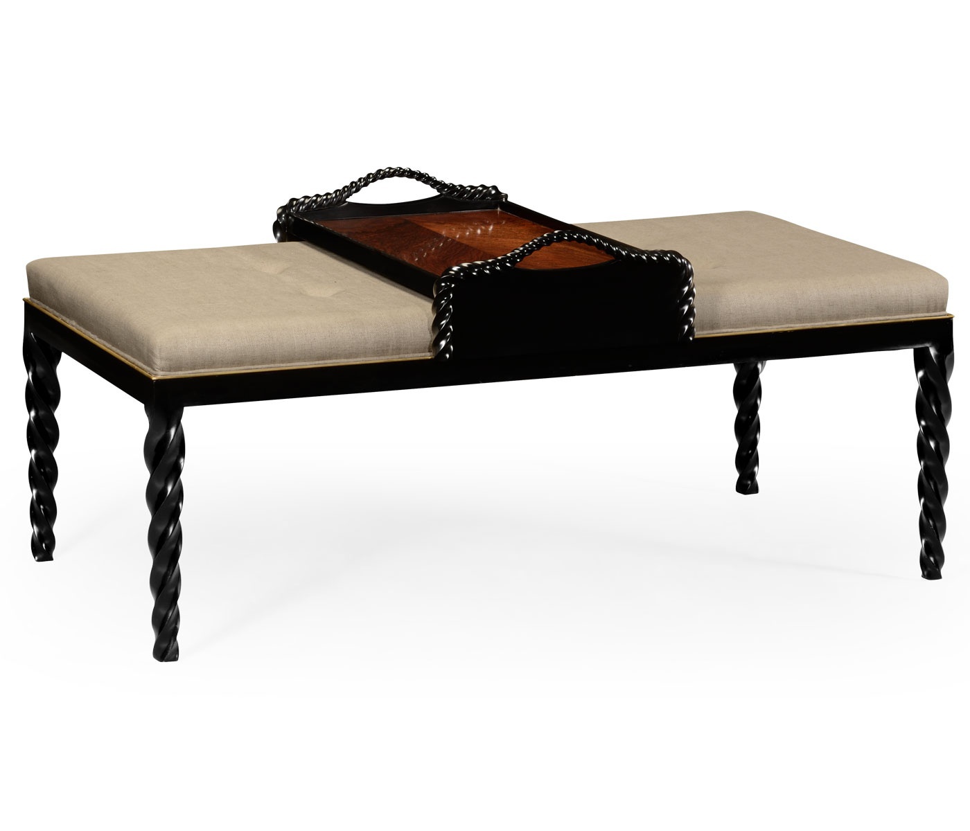 Pouf table Twist from the American manufacturer Jonathan Charles. Model with frame and top made of wood. Legs - carved. The trim is made of lacquer black. The upholstery is made of leather or textile fabric.