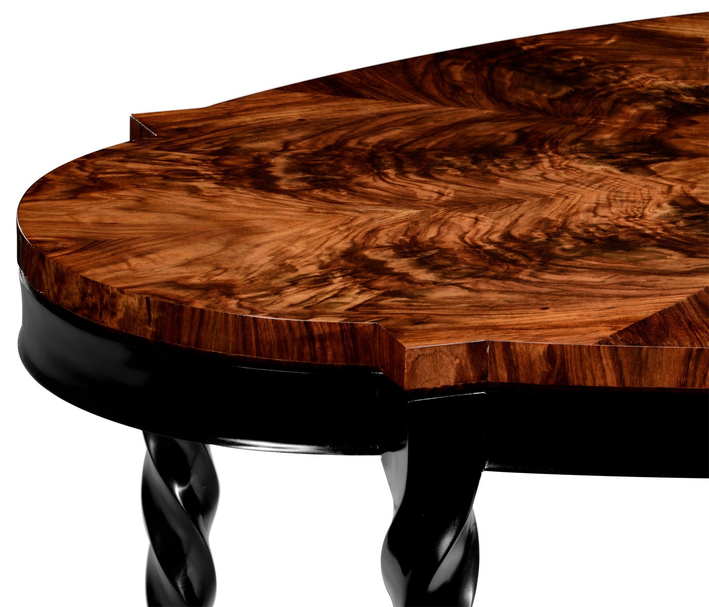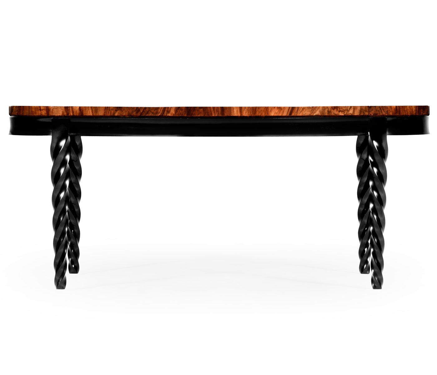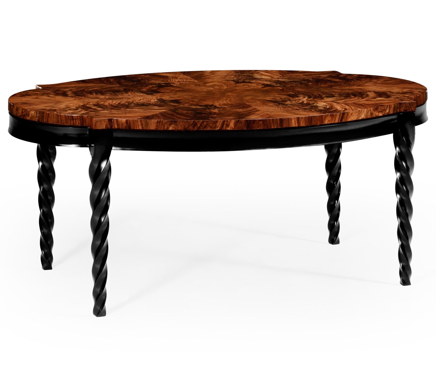 Twist table from the American manufacturer Jonathan Charles. Oval model on the original twisted legs. The counter is made of wood and covered with veneer. The frame and carved legs are available in walnut finish or lacquered black. The design is executed in classical style.