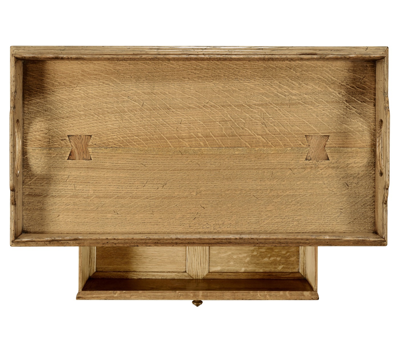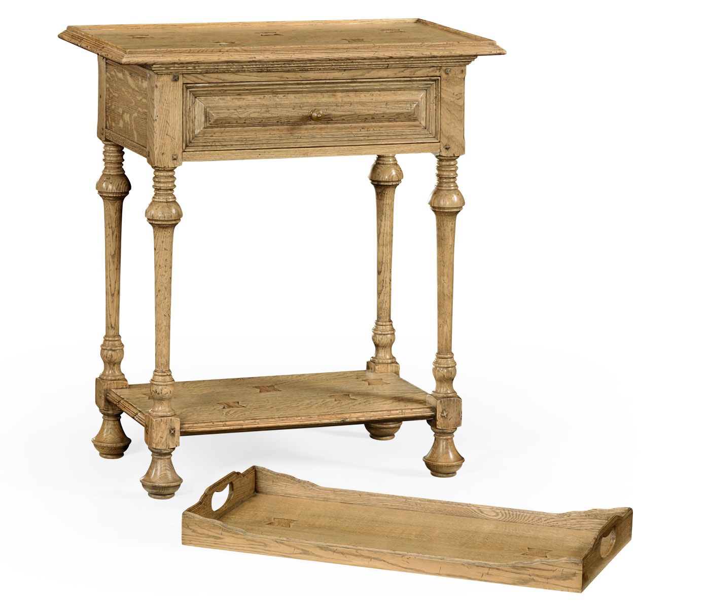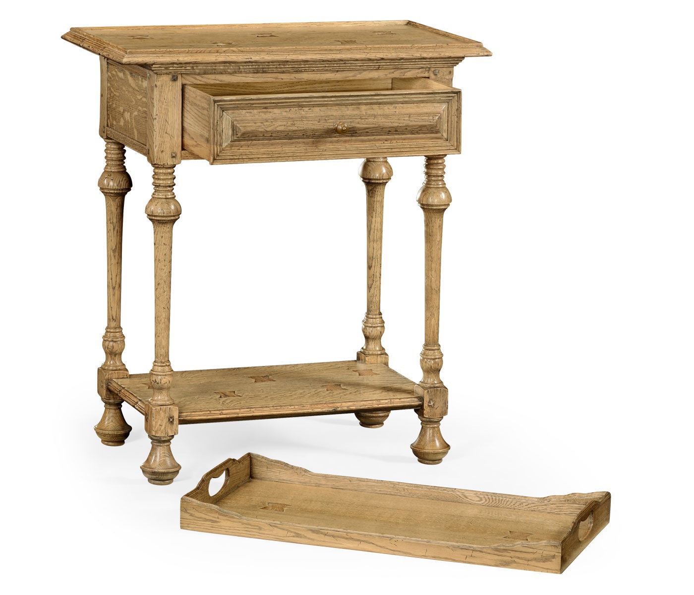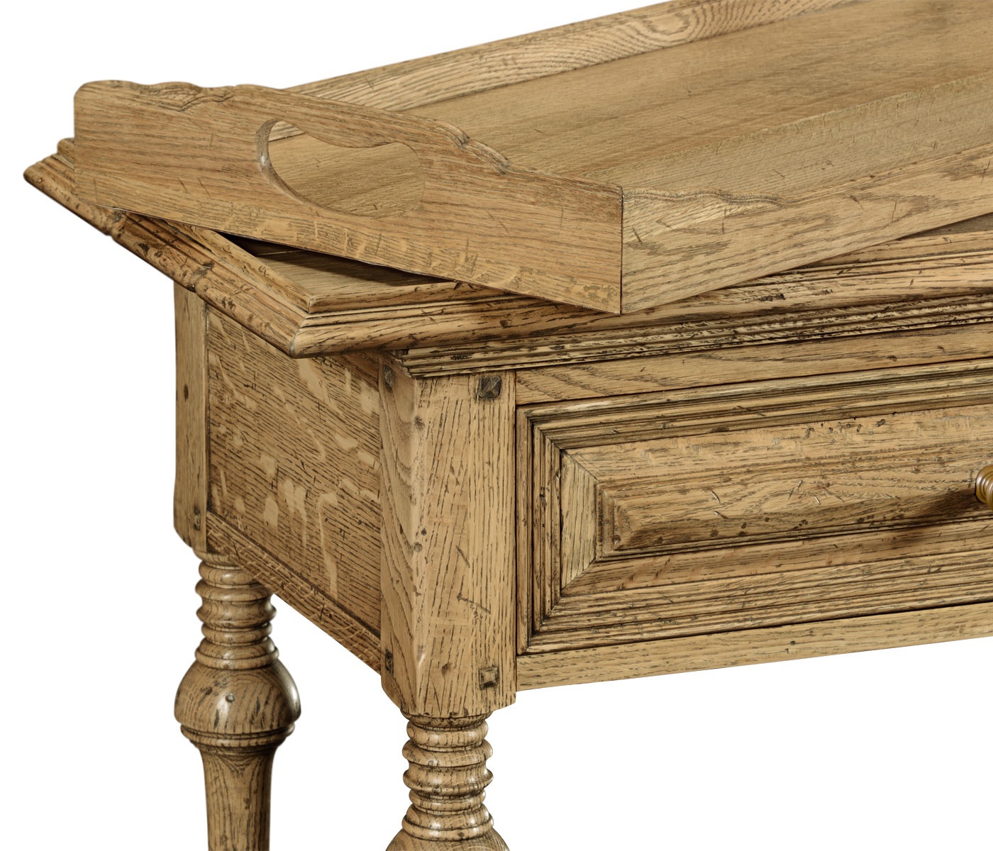 Table Natural Oak from the American manufacturer Jonathan Charles. The model is made from wood with a weathered finish in light oak. Carved legs. A table fitted with a drawer, a shelf and a removable tray on top.
