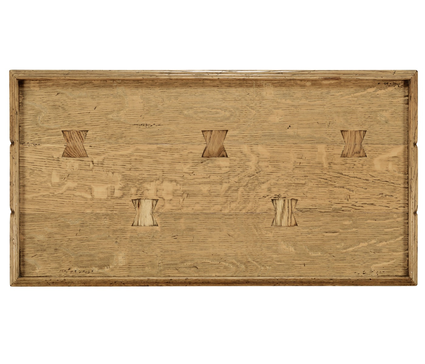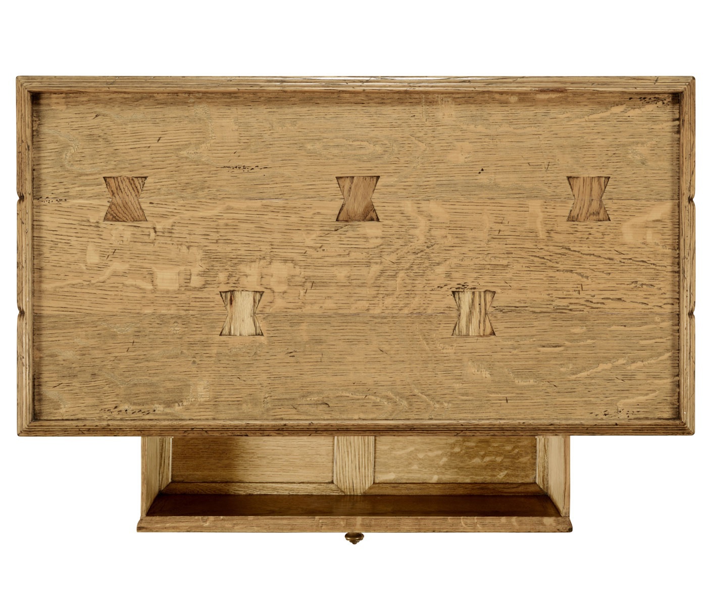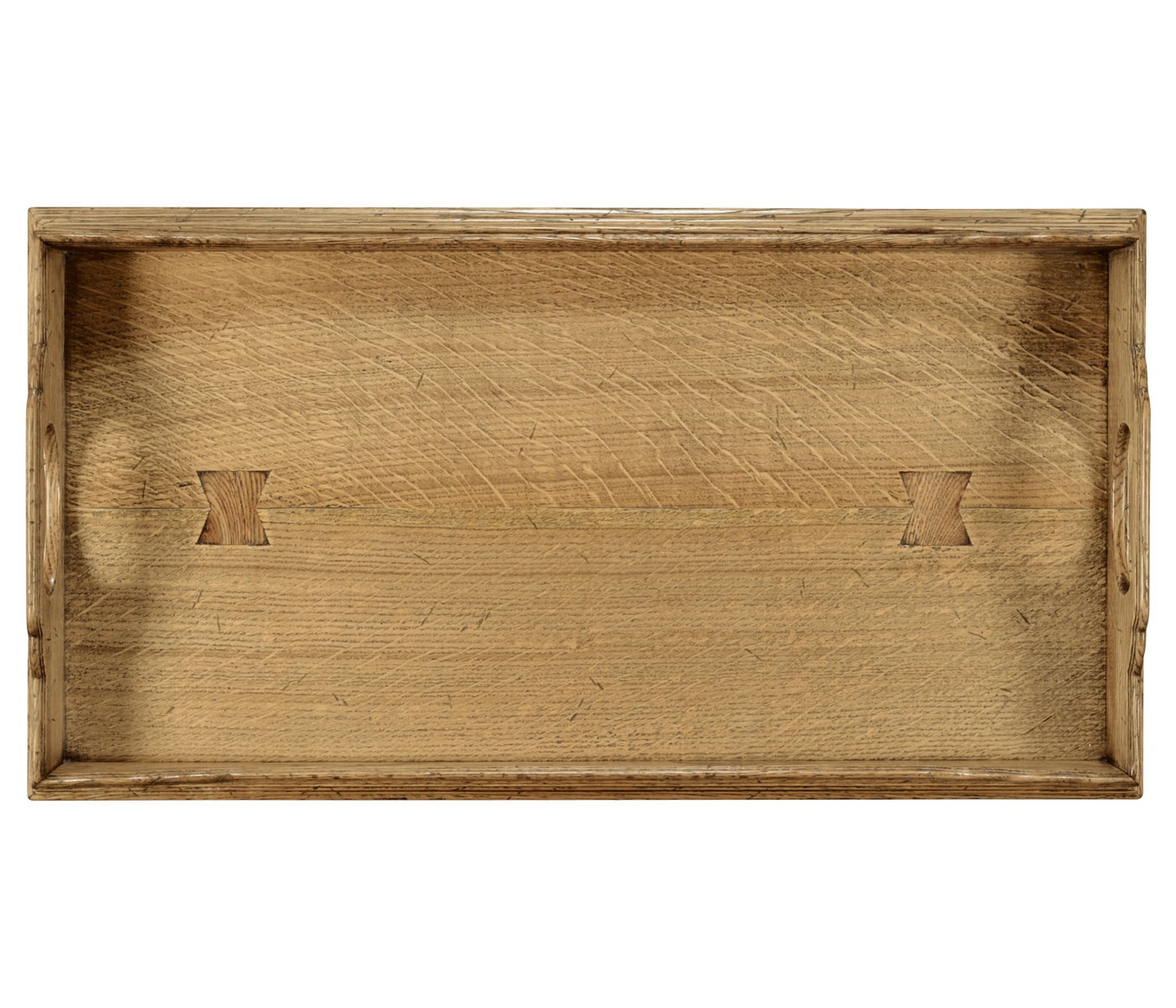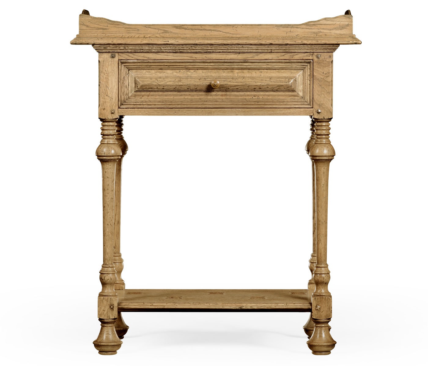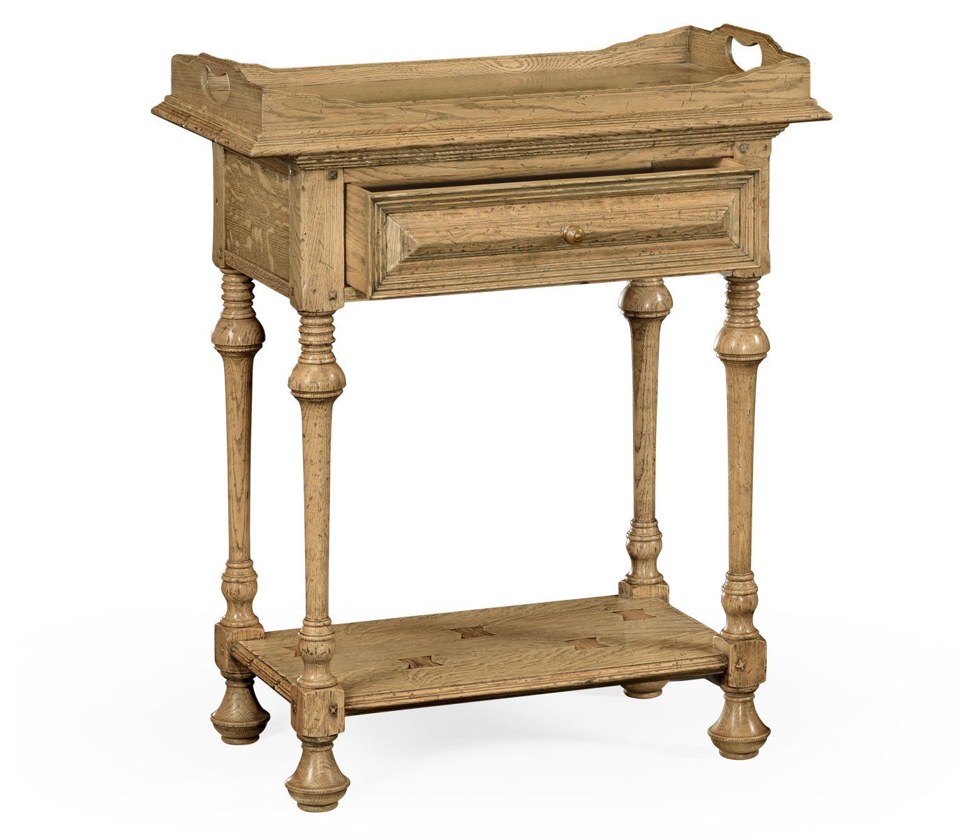 Table Natural Oak from the American manufacturer Jonathan Charles. The model is made from wood with a weathered finish in light oak. Carved legs. A table fitted with a drawer, a shelf and a removable tray on top.