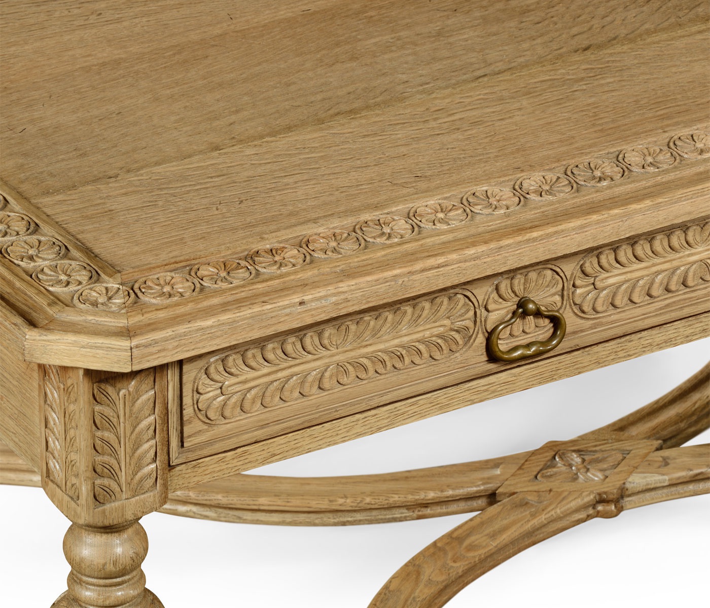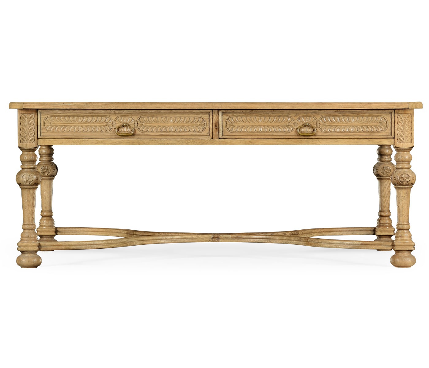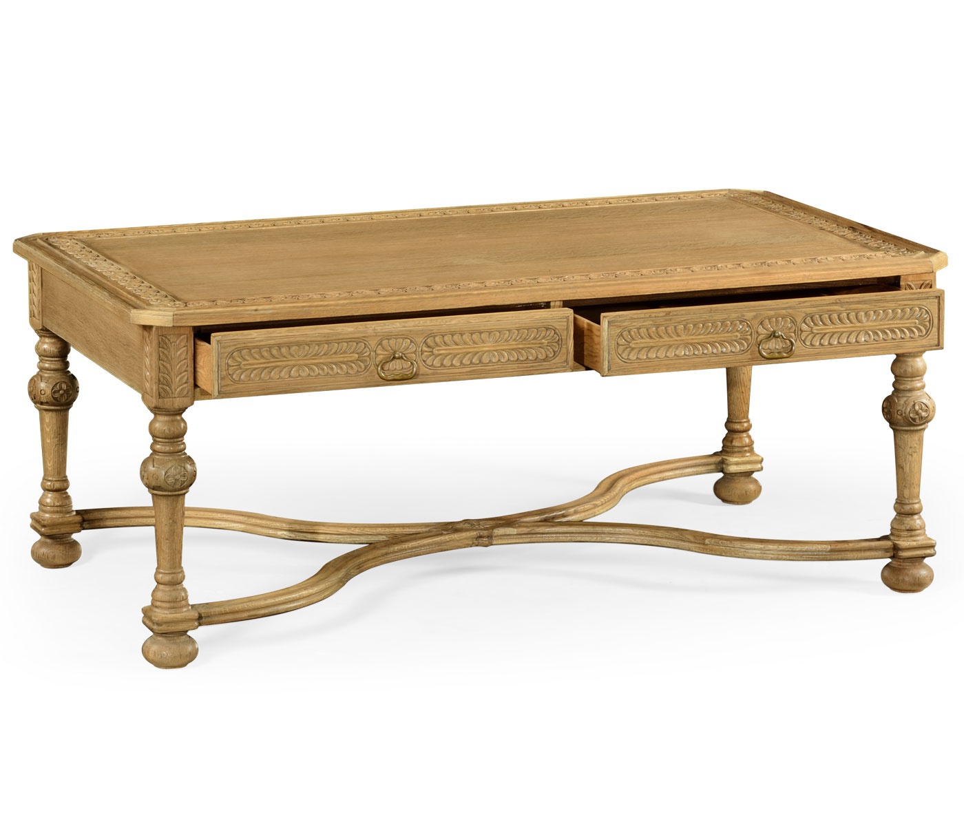 Coffee table in Natural Oak from the American manufacturer Jonathan Charles. The model with rectangular table top is made from oak. A table with sliding drawers and fronts of the boxes and the tabletop is decorated with carvings. Legs balusters with carved decoration.