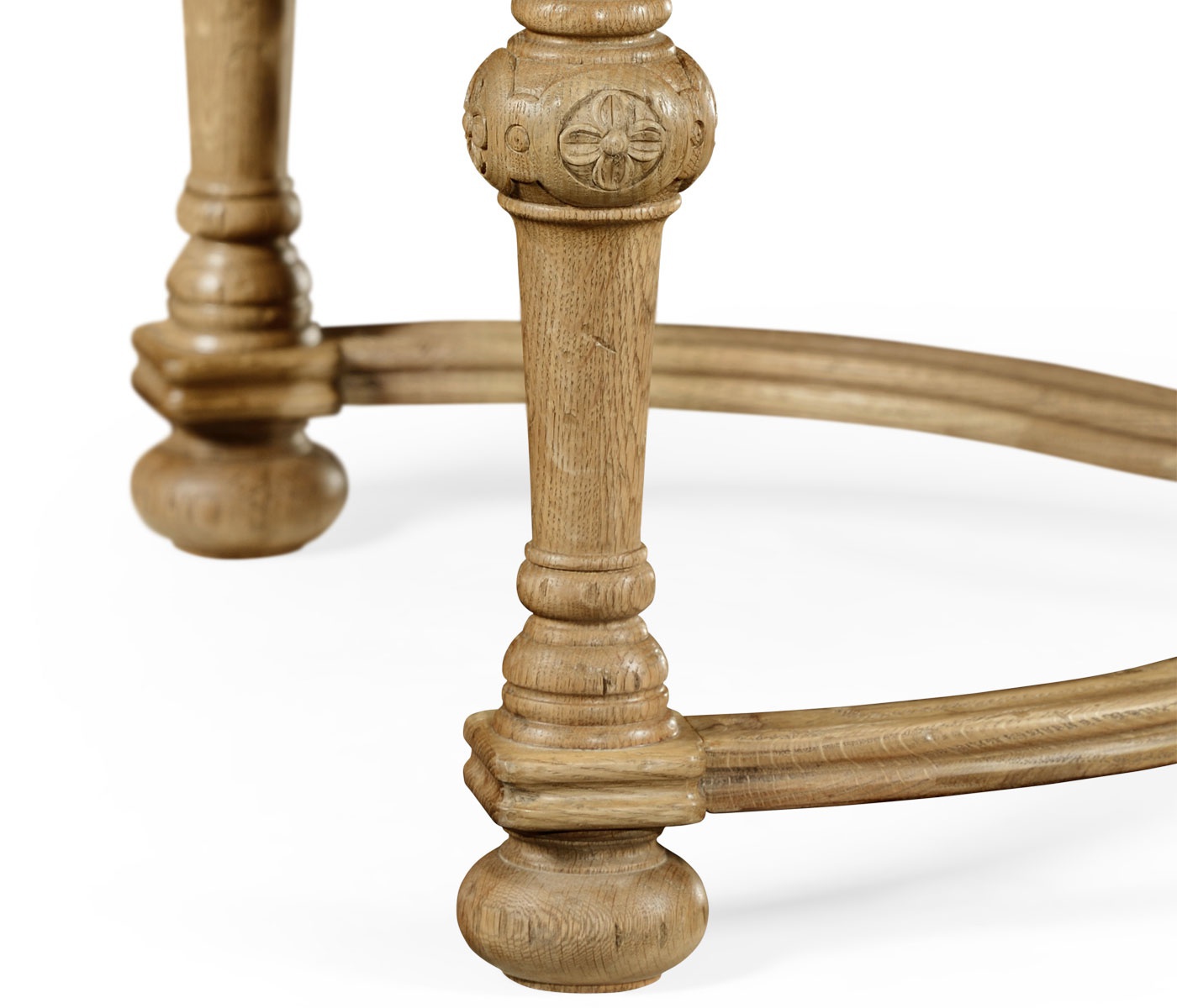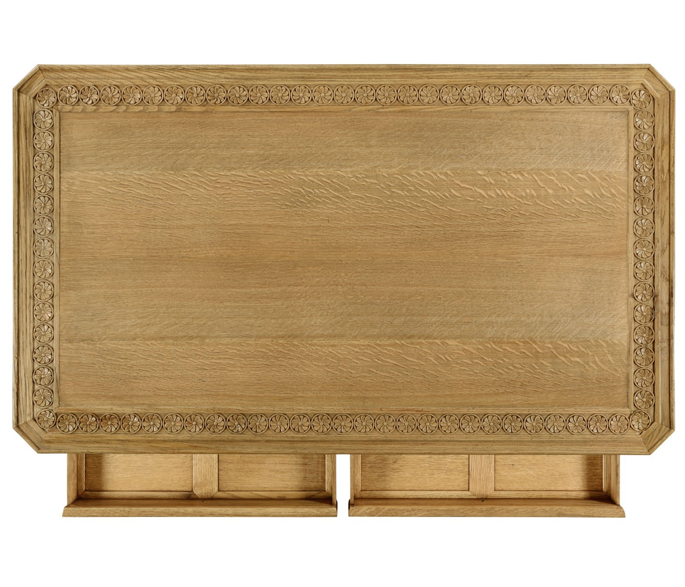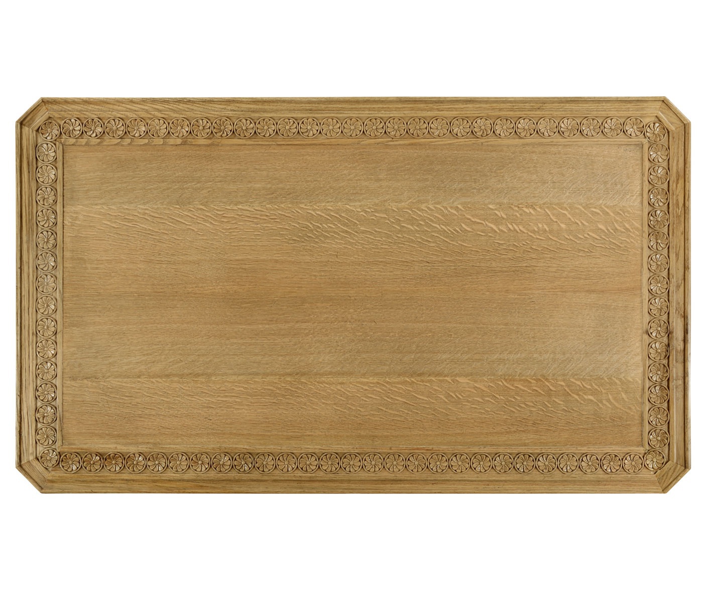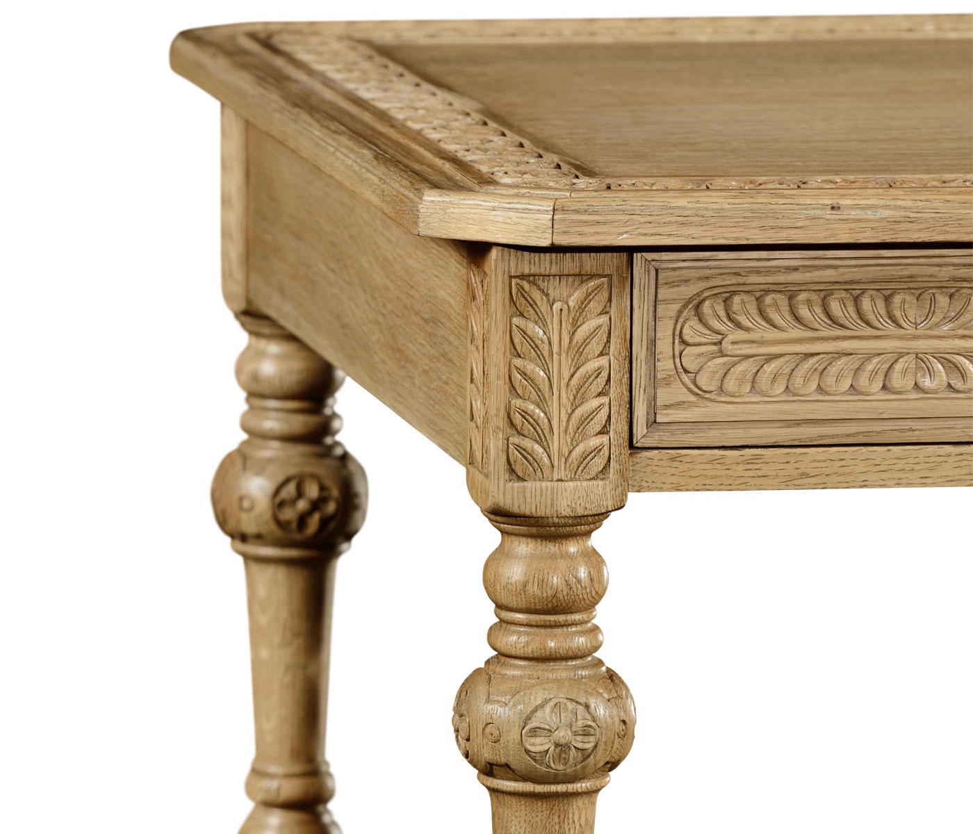Coffee table in Natural Oak from the American manufacturer Jonathan Charles. The model with rectangular table top is made from oak. A table with sliding drawers and fronts of the boxes and the tabletop is decorated with carvings. Legs balusters with carved decoration.