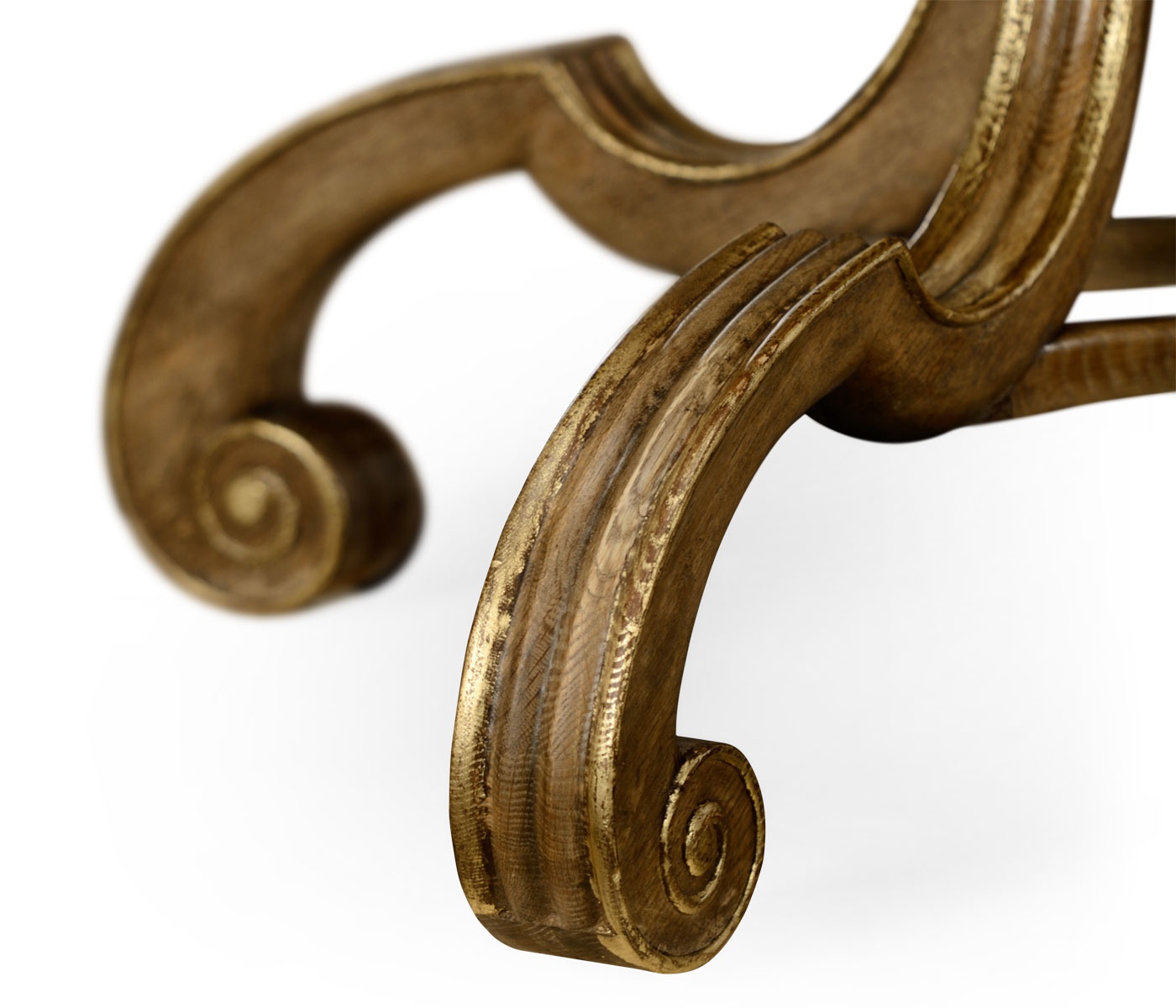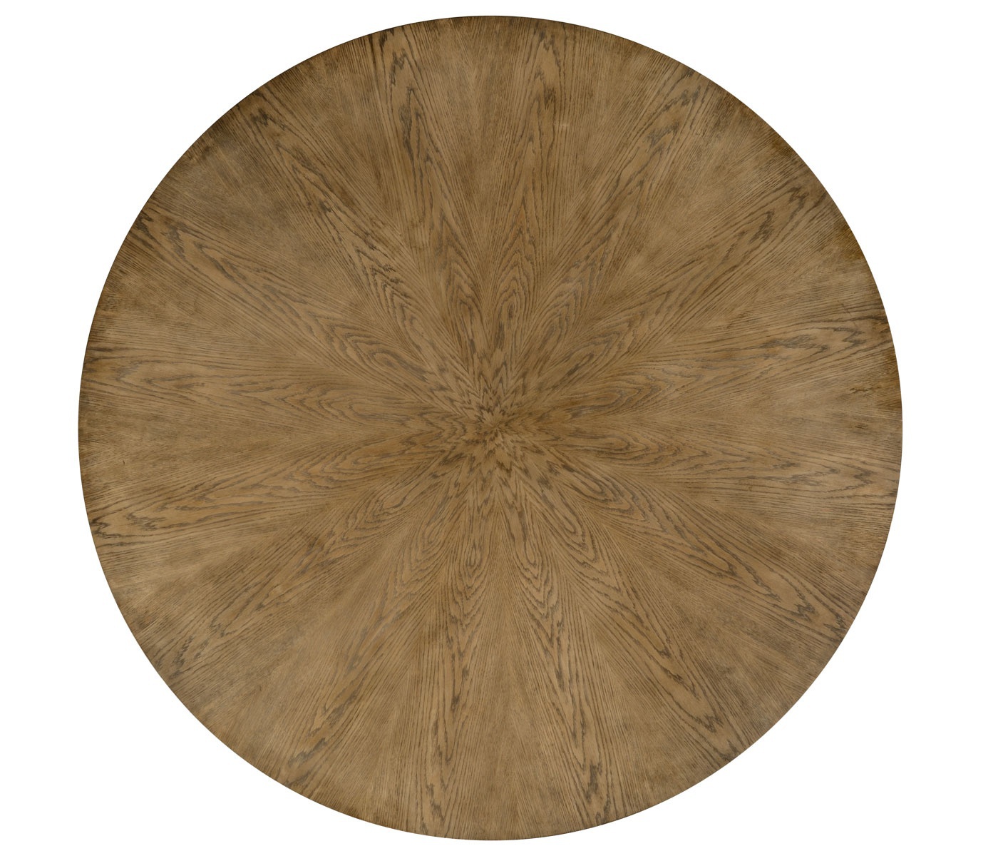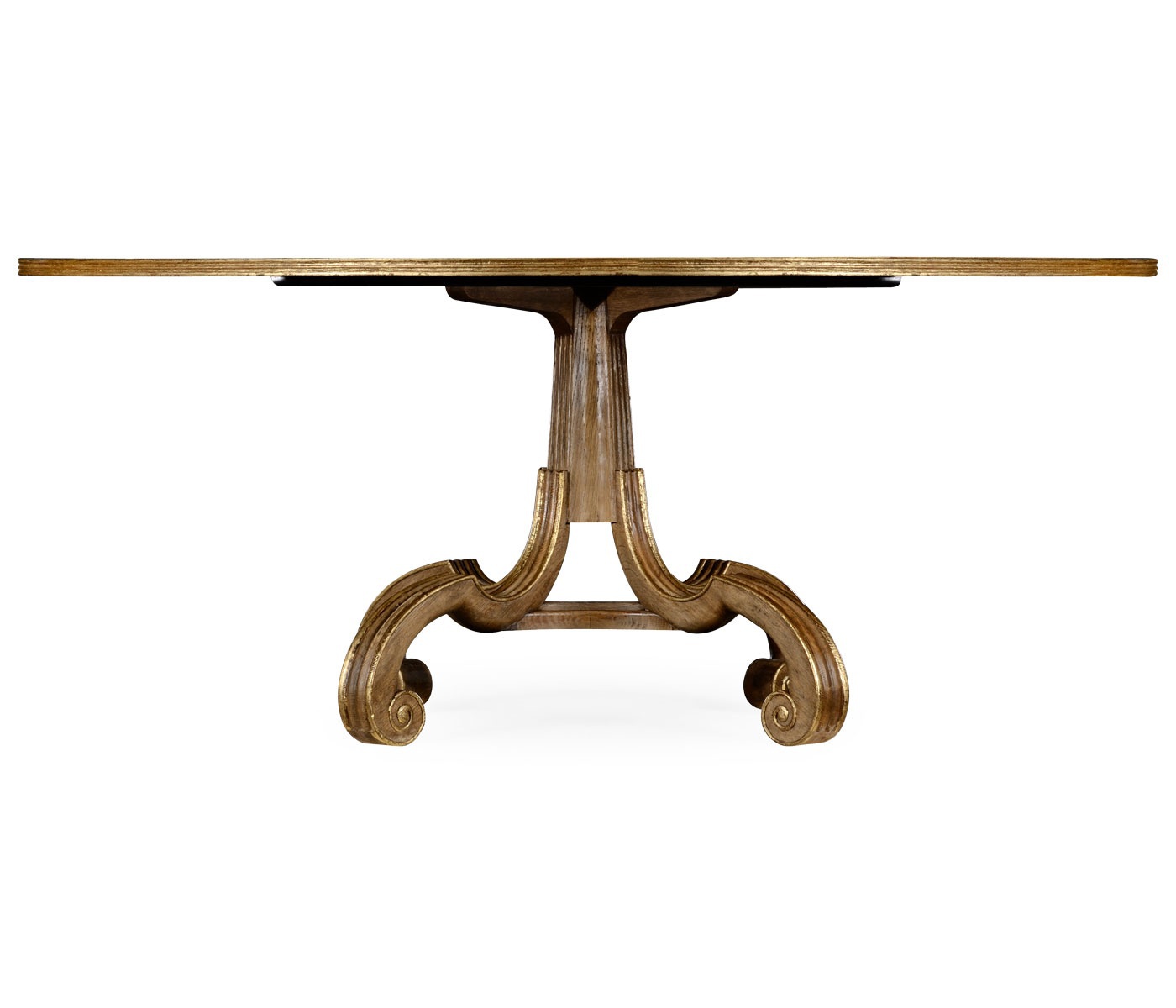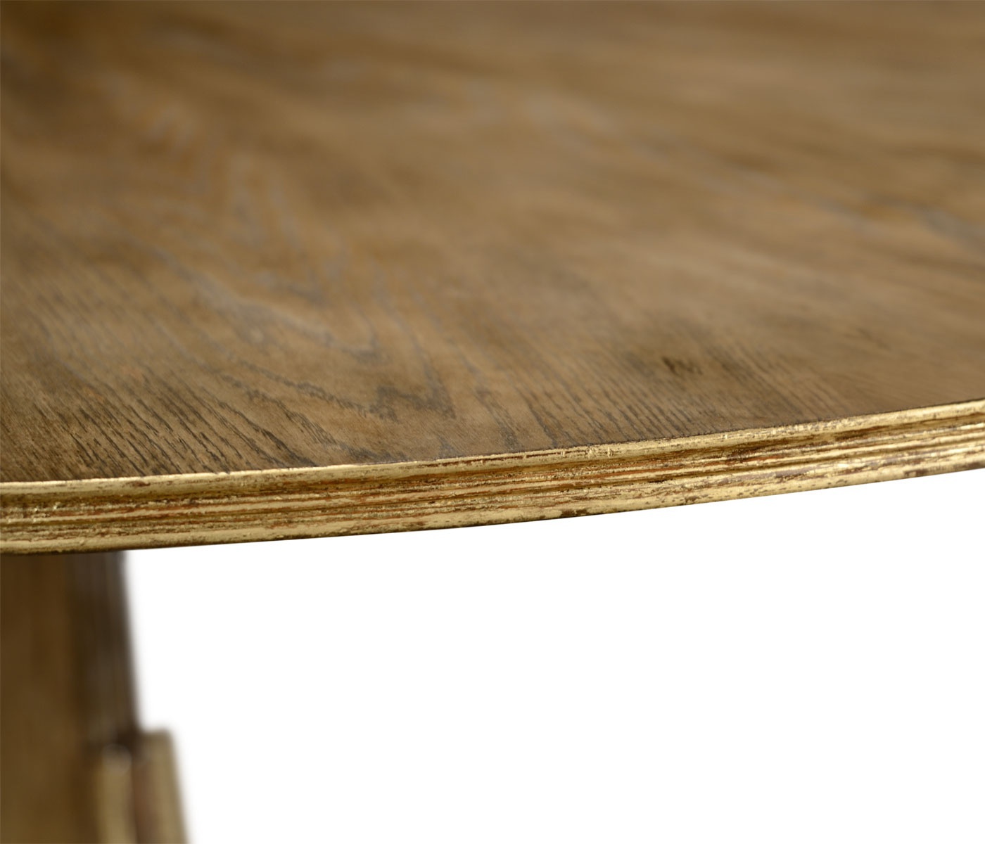 Lacock dining table from the American manufacturer Jonathan Charles. The model is made of wood with finishes in light oak with elements of gilding. Round top supported by legs. Table for 10 people.