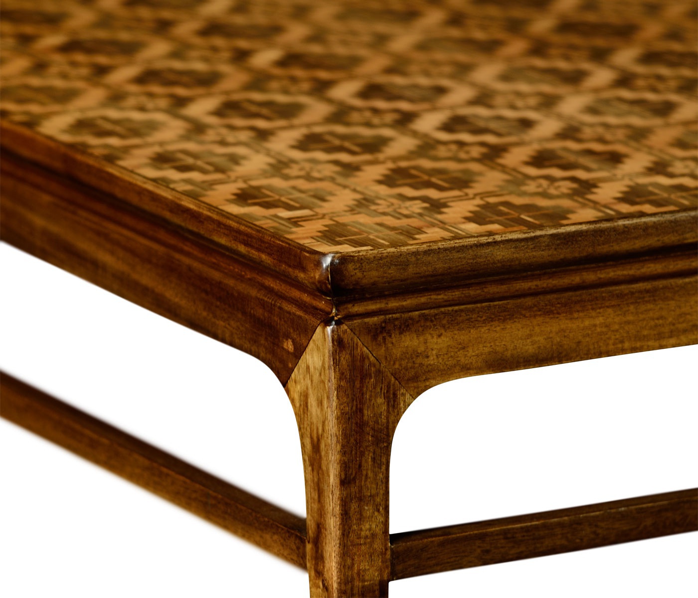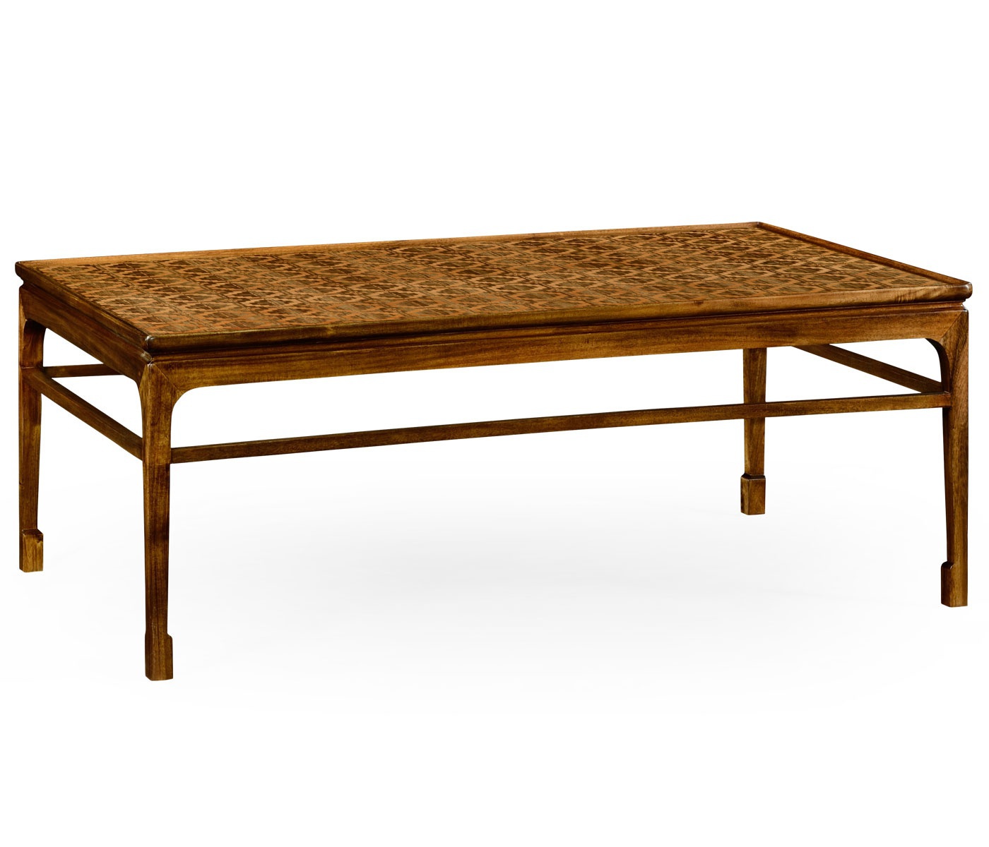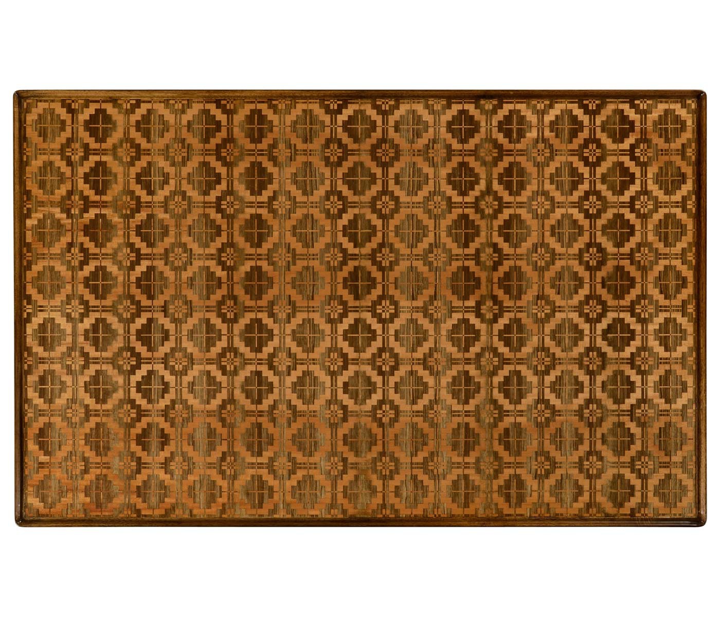 Table Leyburn from the American manufacturer Jonathan Charles. Coffee table rectangular shape made from wood. The table top is decorated with marquetry from ancient tissue.