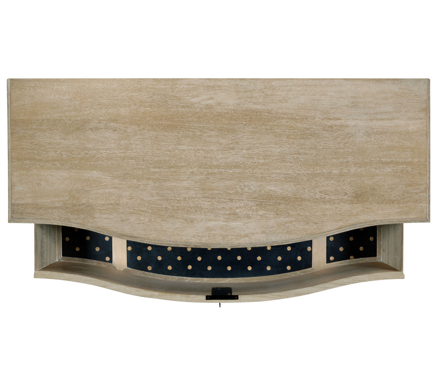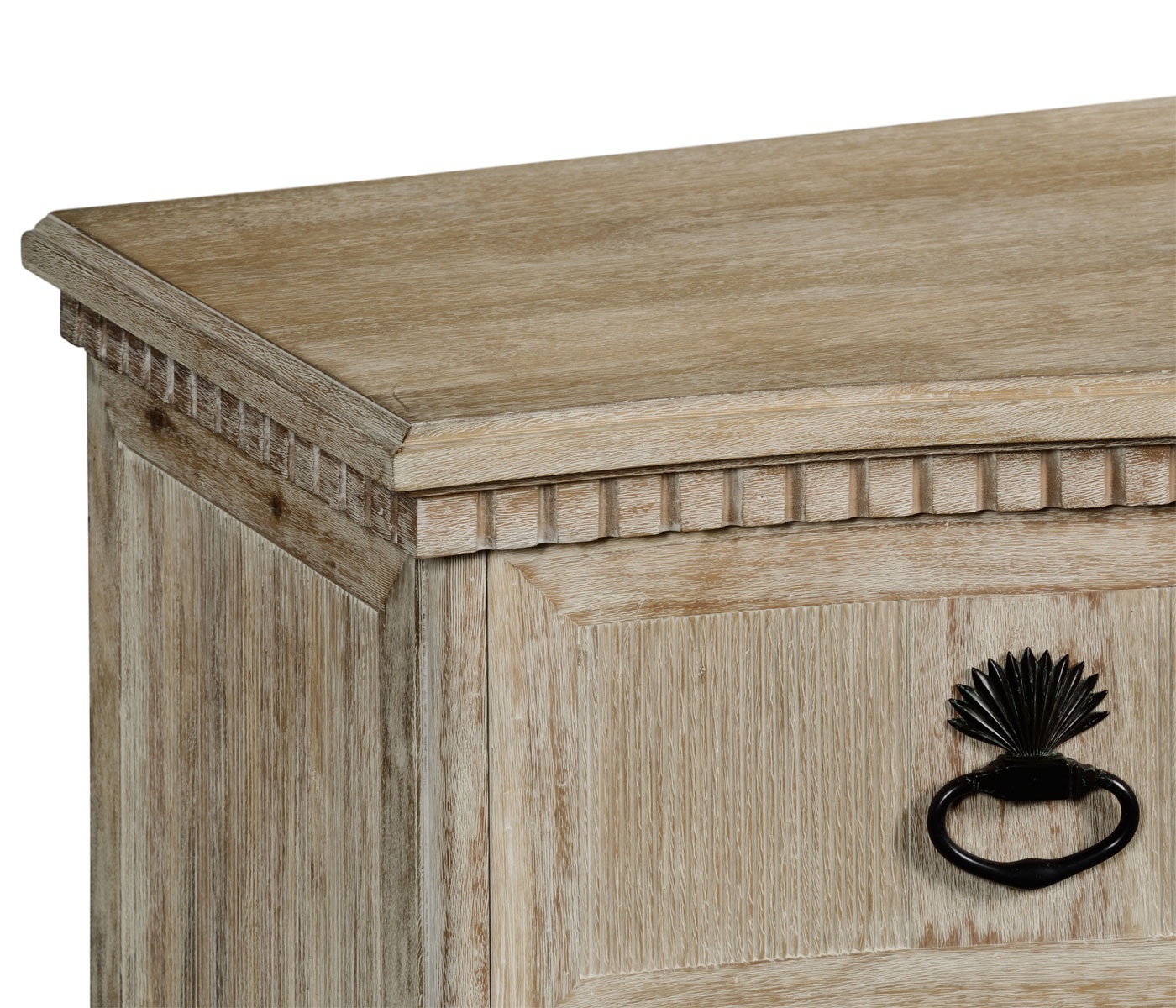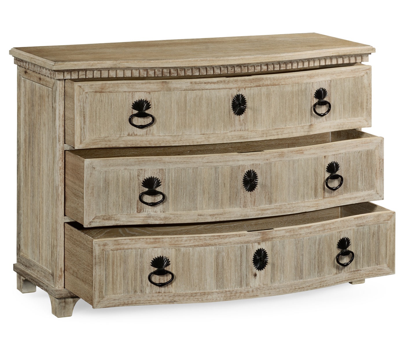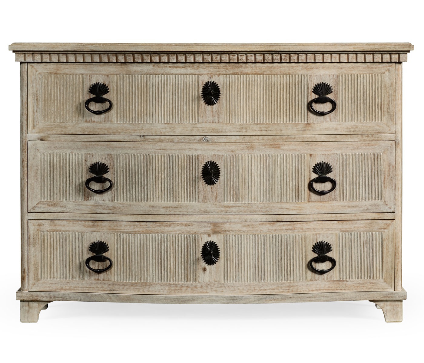 The Bickerton chest of drawers from the American manufacturer Jonathan Charles. The body is made of wood. The facade is curved and carved. Chest of drawers in classic style with three large drawers. Adorns the chest of drawers with original hardware in bronze. The model is inspired by the English 18th century chest of drawers.
