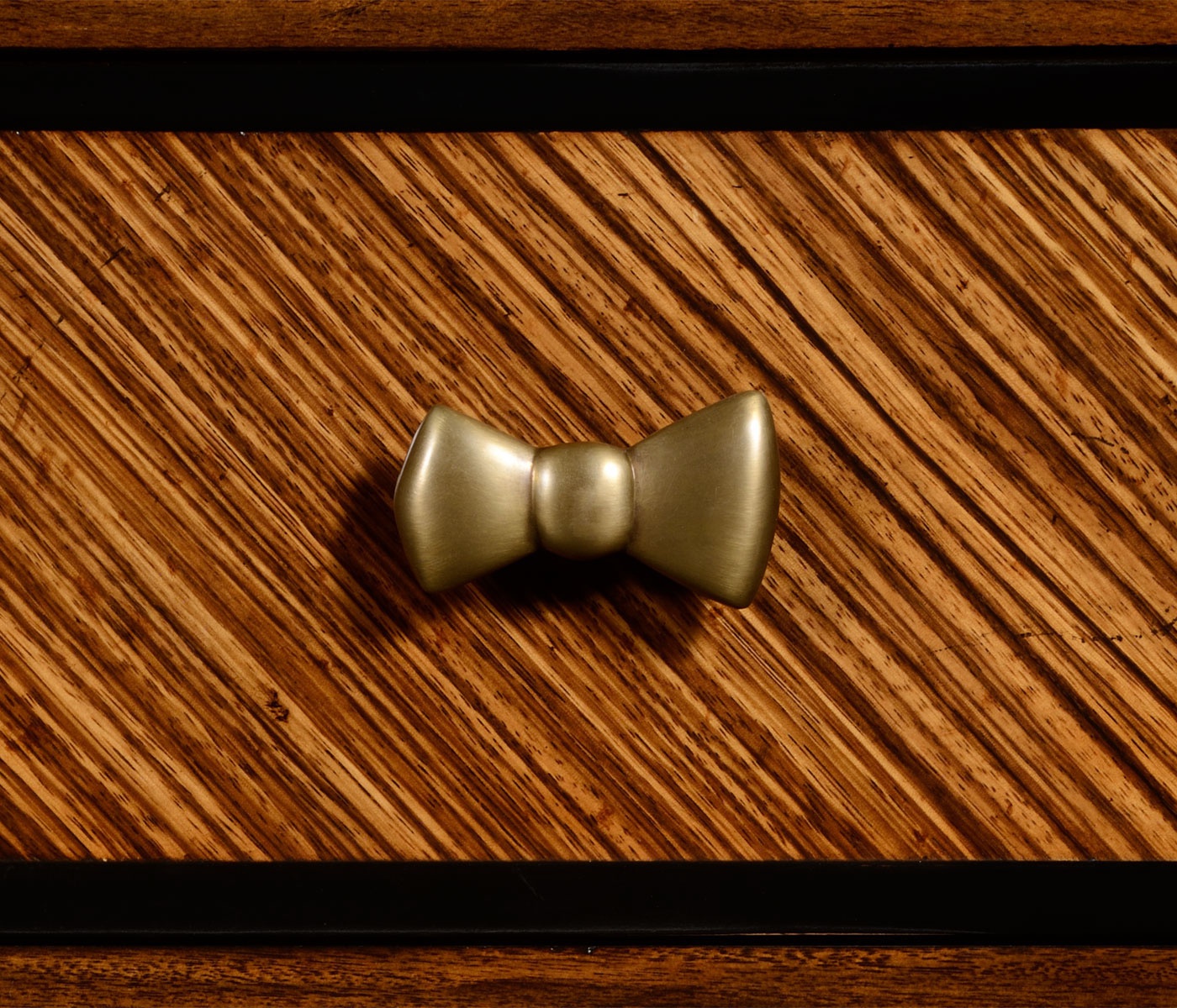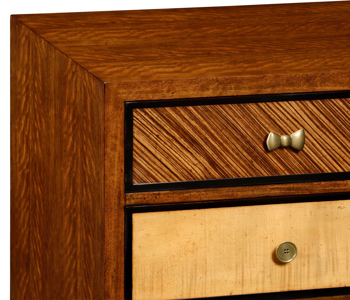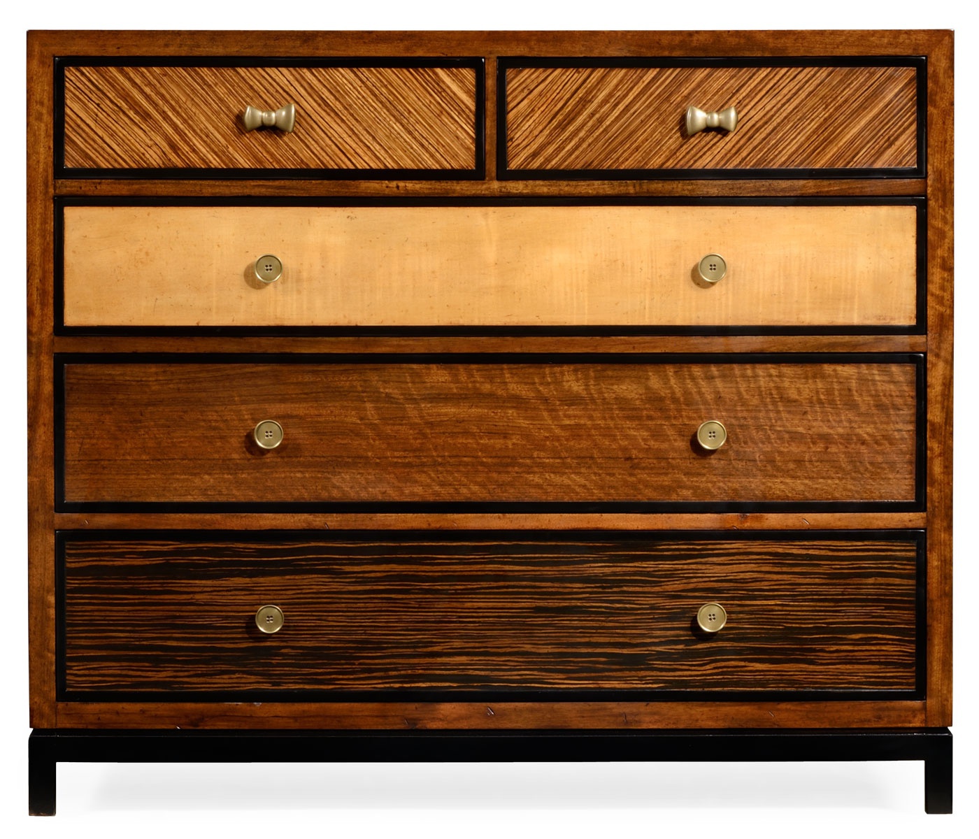 Chest Pasticcio from the American manufacturer Jonathan Charles. The body is made of wood and covered with veneer of different species. The model with three large and two half drawers. Very original handles on the drawers in the form of a bow tie and buttons. Low black legs made of wood.