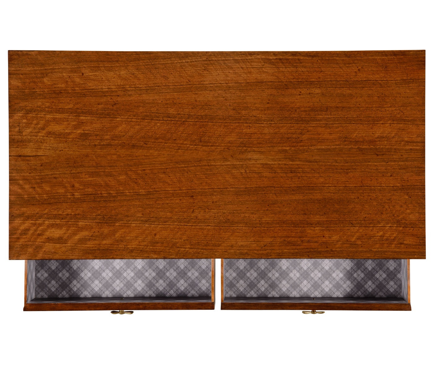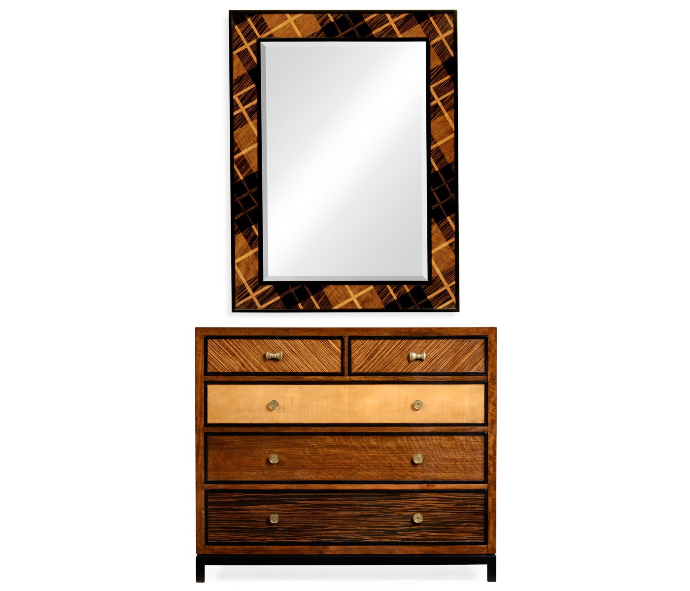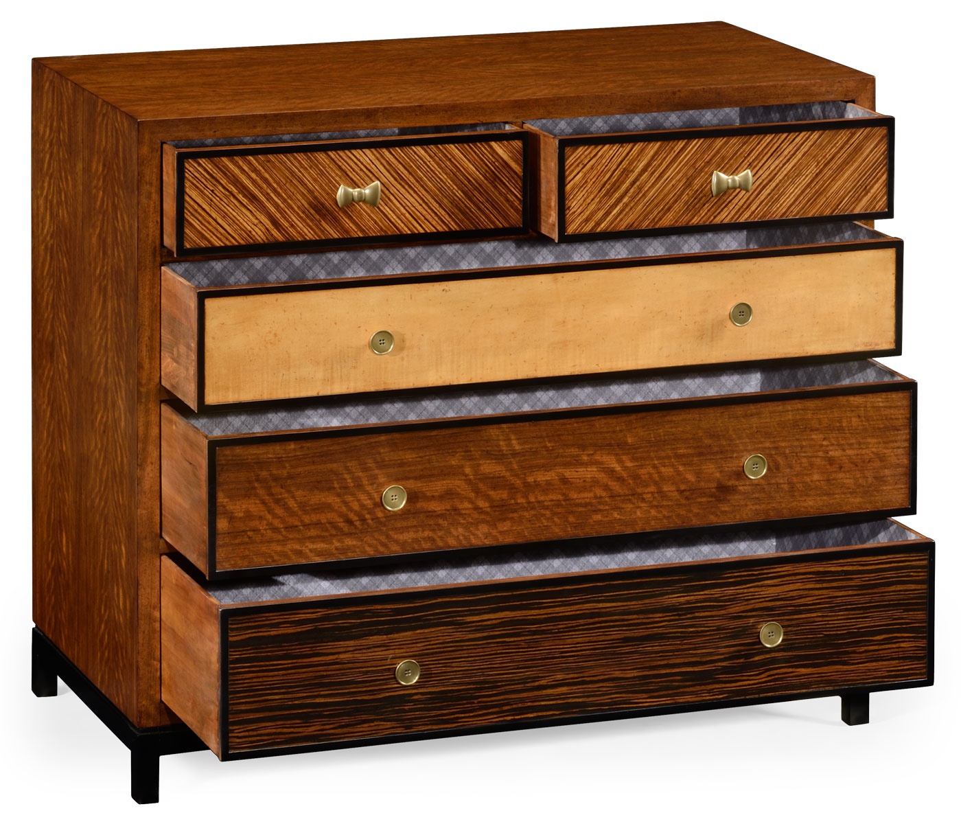 Chest Pasticcio from the American manufacturer Jonathan Charles. The body is made of wood and covered with veneer of different species. The model with three large and two half drawers. Very original handles on the drawers in the form of a bow tie and buttons. Low black legs made of wood.