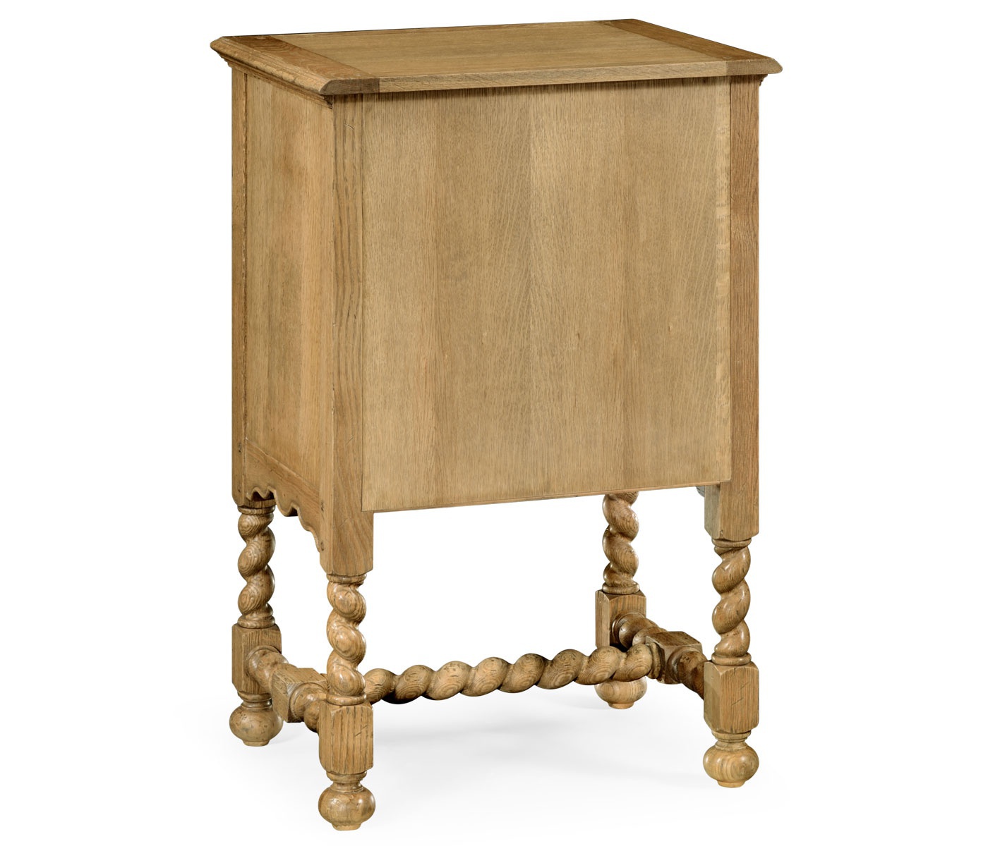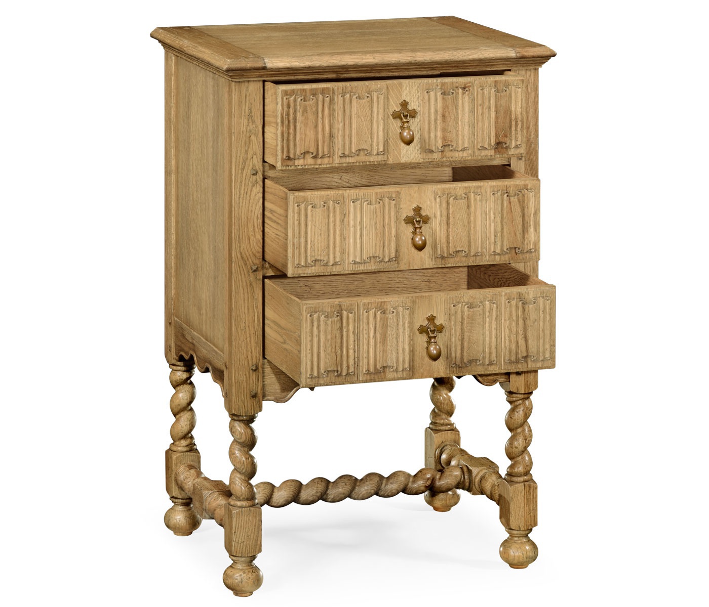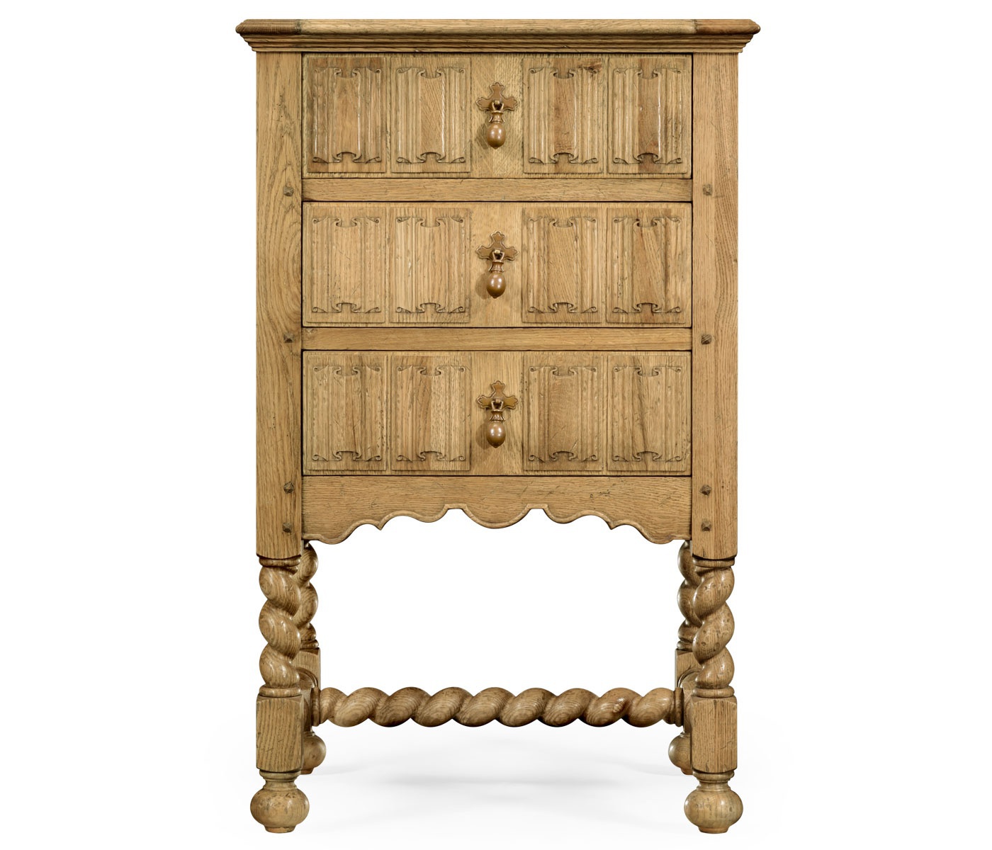 Dresser Natural Oak from the American manufacturer Jonathan Charles. The design is based on the model 1600. The body and legs are made of oak. Legs twisted. Fittings made of patinated brass. Bedside model is equipped with three drawers. The facades of the boxes carved in the form of lace.