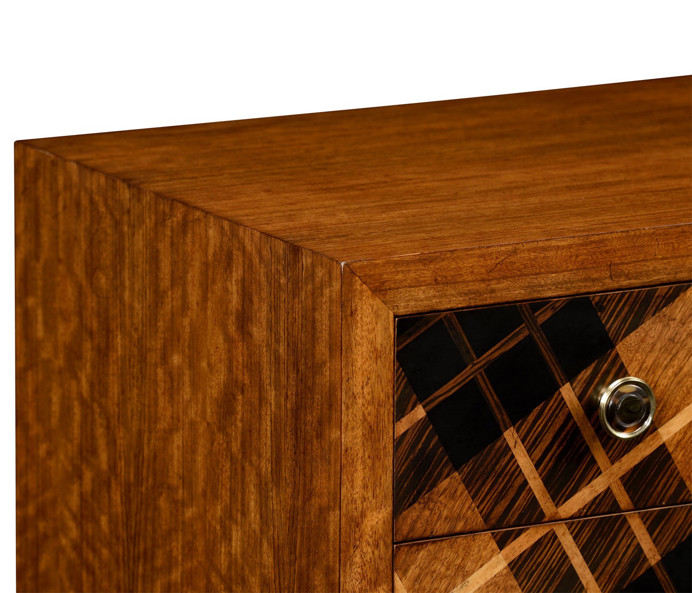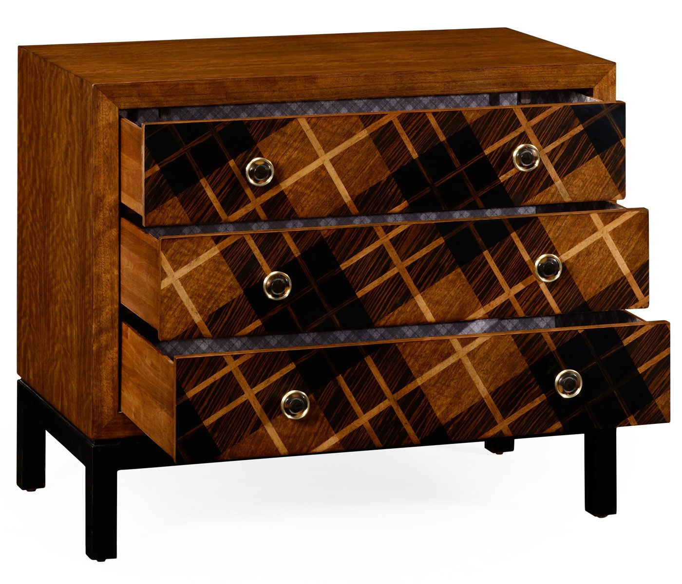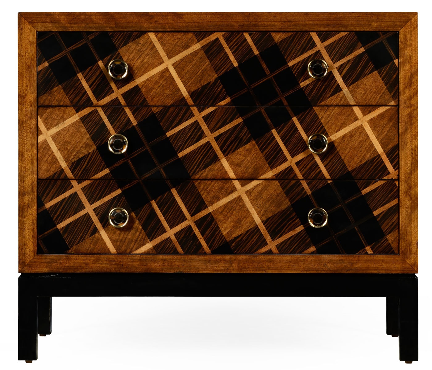 The Alexander Julian chest of drawers from the American manufacturer Jonathan Charles. Compact dresser with the hull made of wood. The facade is decorated with inlay. Model with three drawers. Legs black.