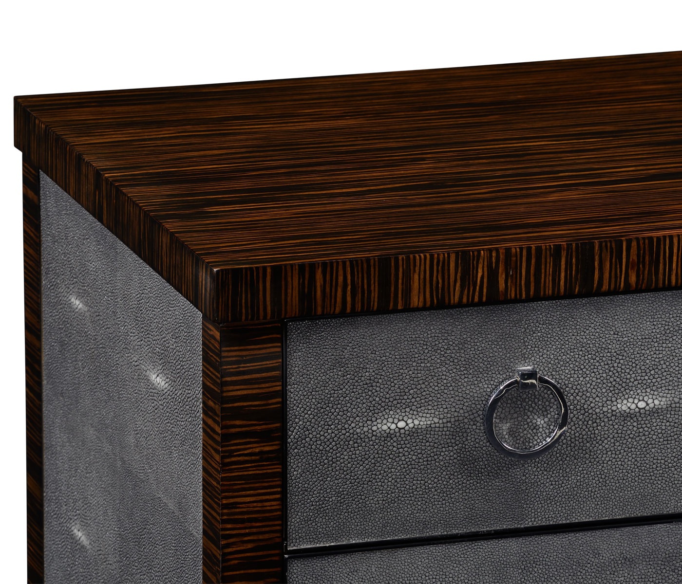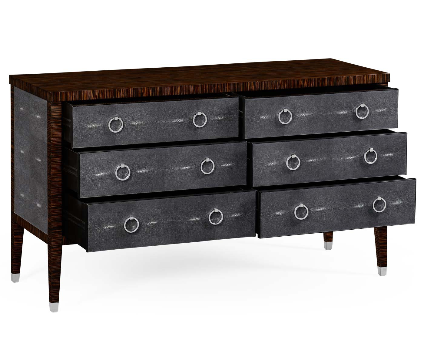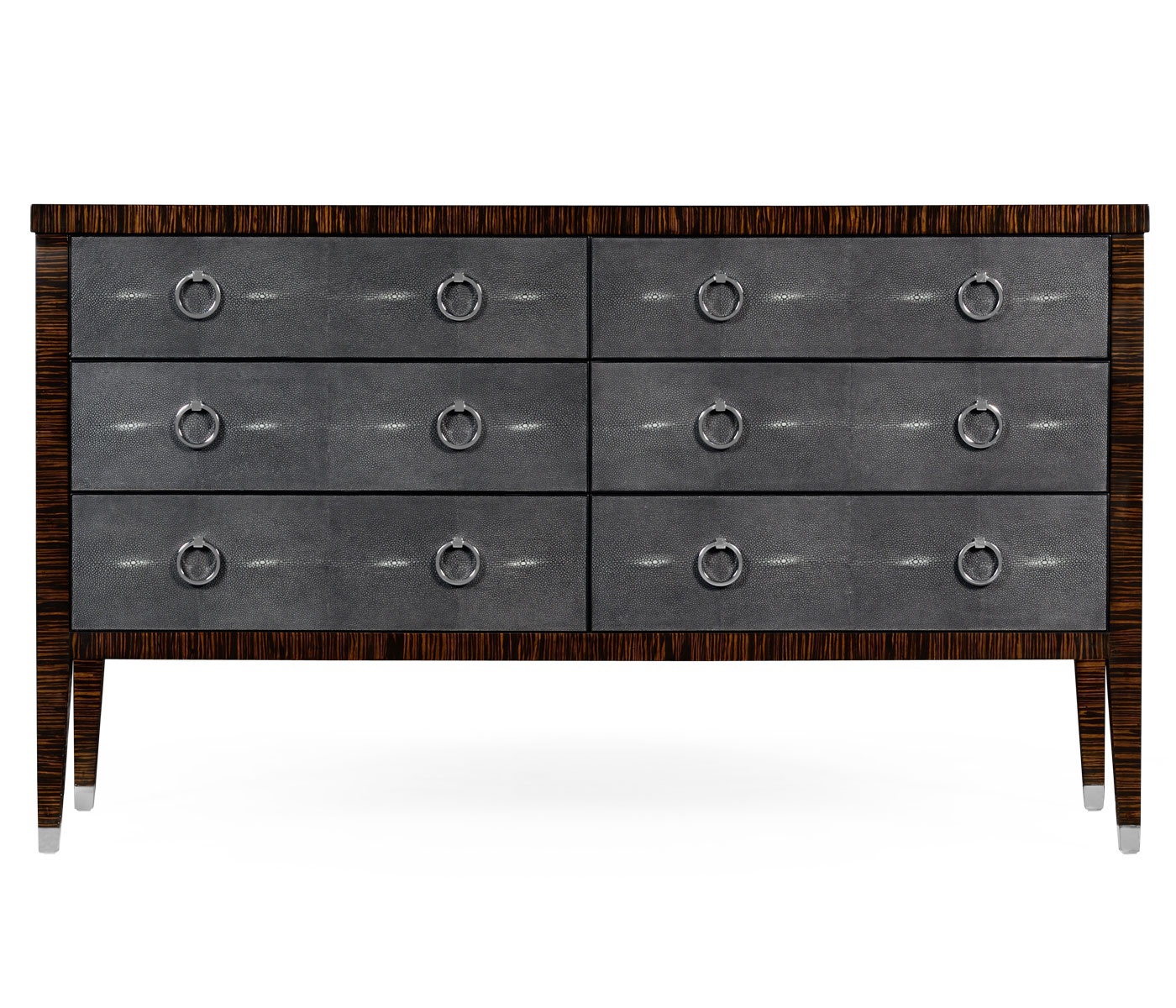 The Metropolitan chest of drawers from the American manufacturer Jonathan Charles. The body is made of wood and finished with veneer and faux shagreen. The model with six drawers. Round handles and ferrules on tapered legs made of Nickel.