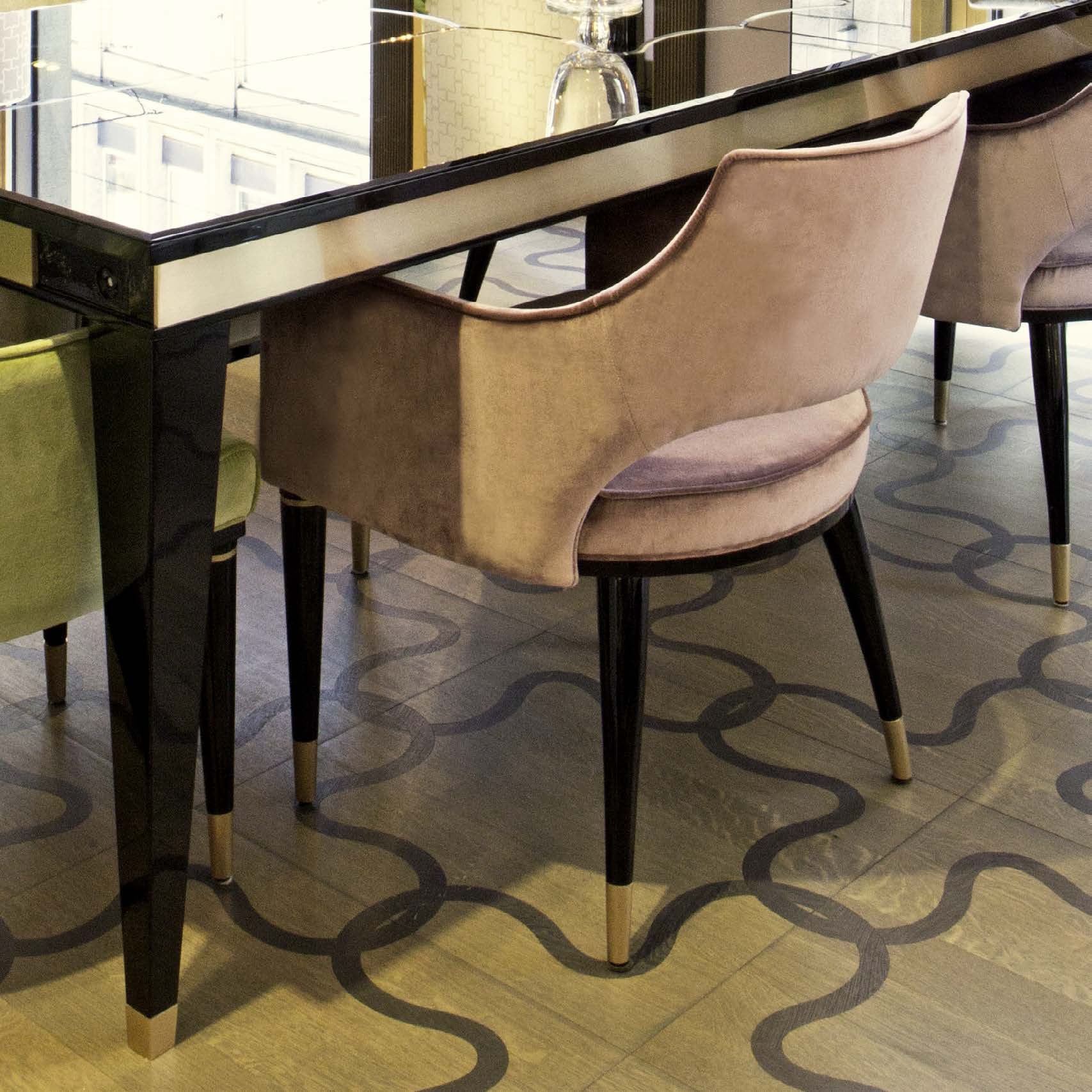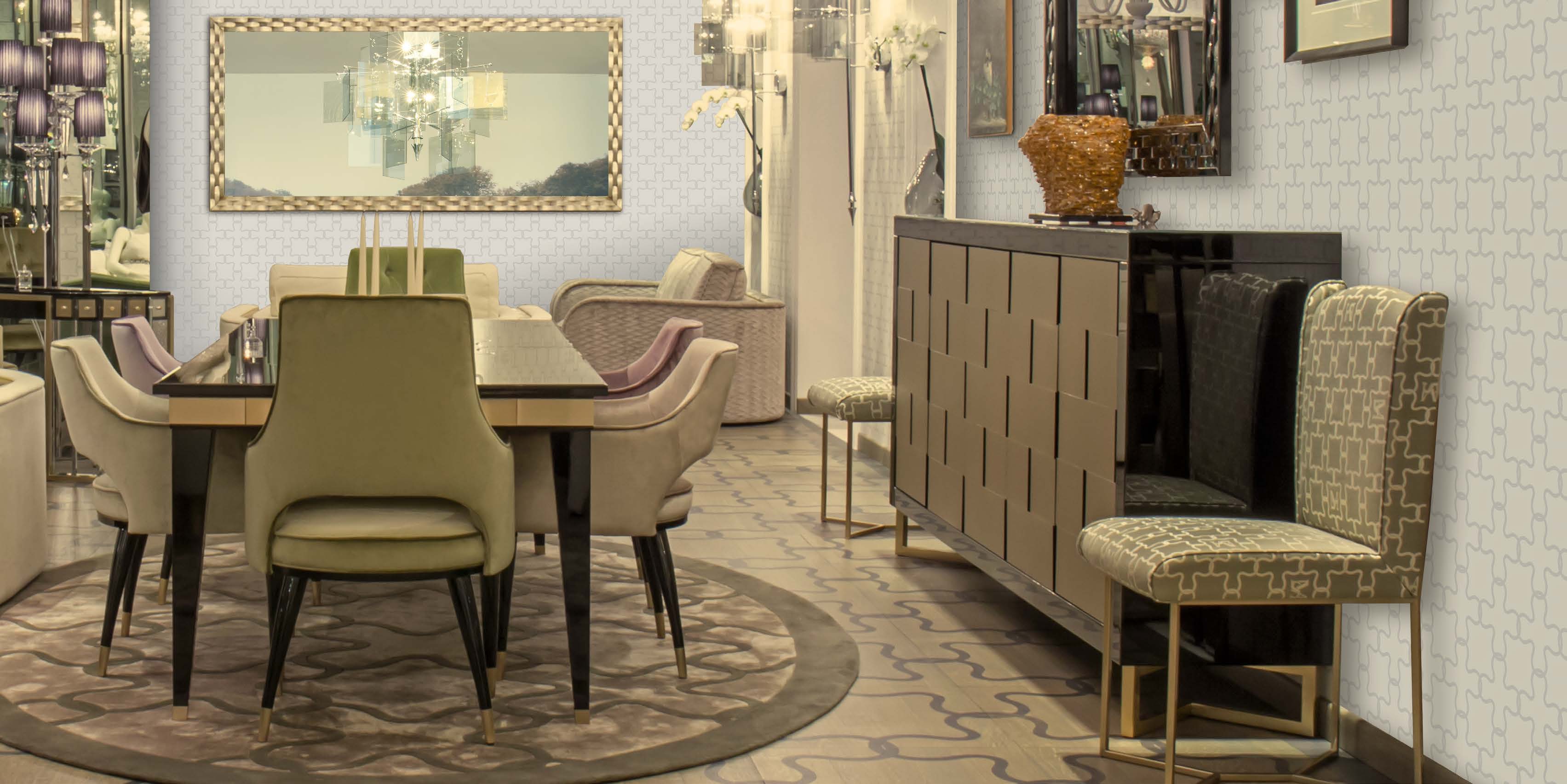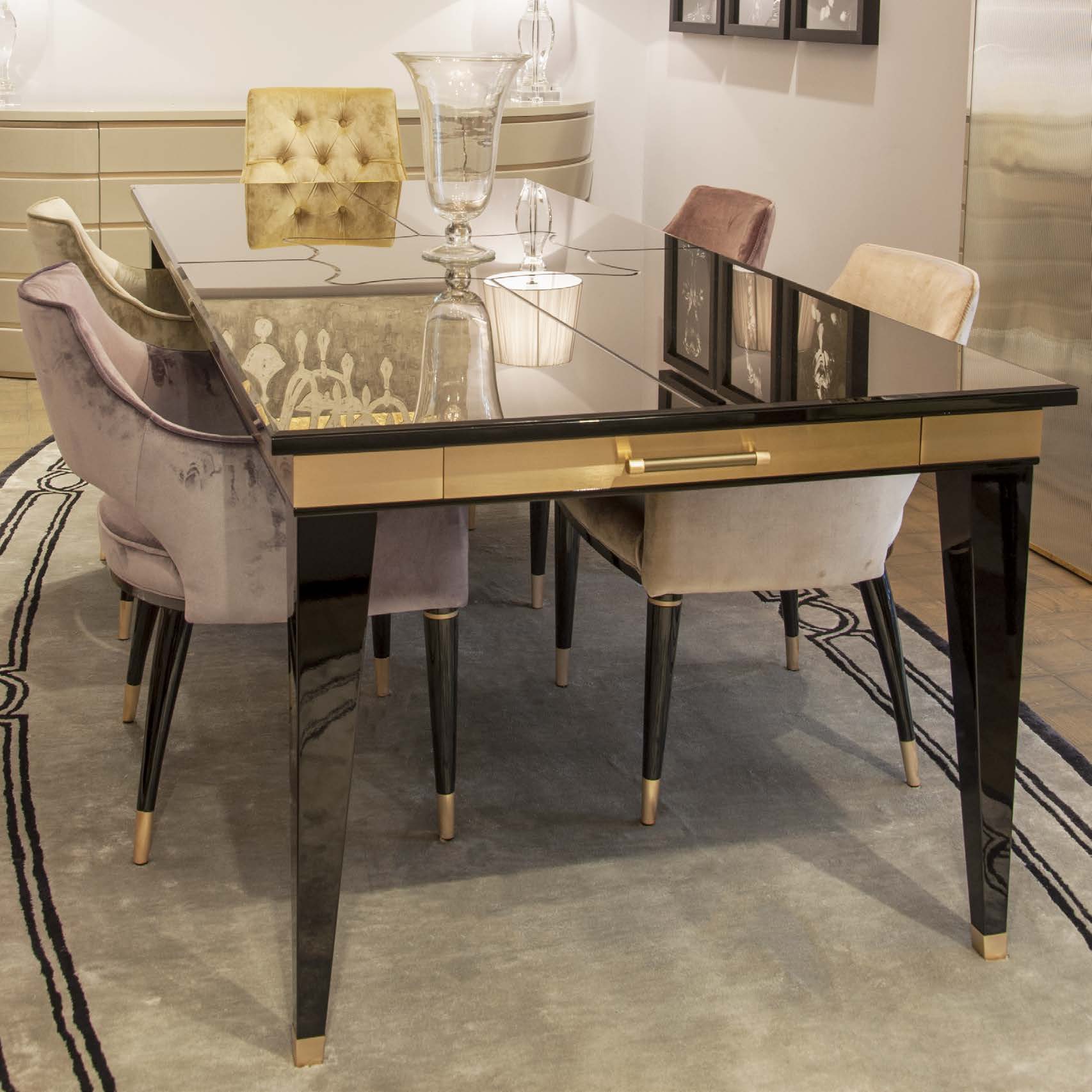 Dining room (dining set) Muzio from the Italian manufacturer Formitalia. Set from the collection Samuele Mazza. The frame is made from natural wood, to lacquered finish. The chairs in fabric. Decorative items made of metal (brass). The model is made in modern style.
