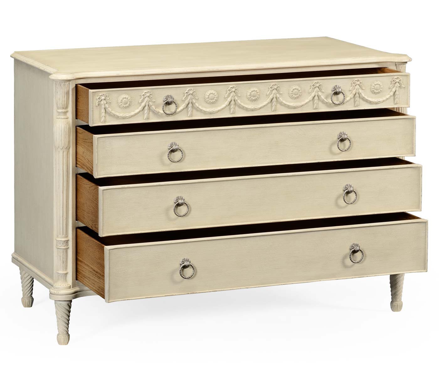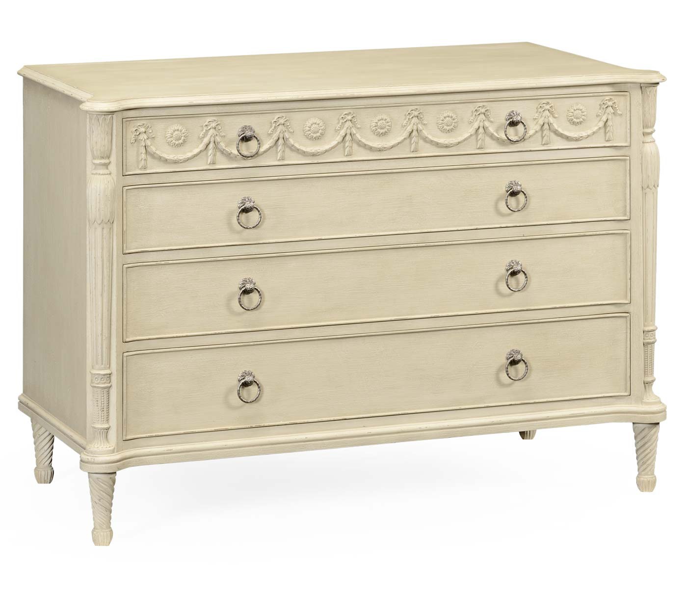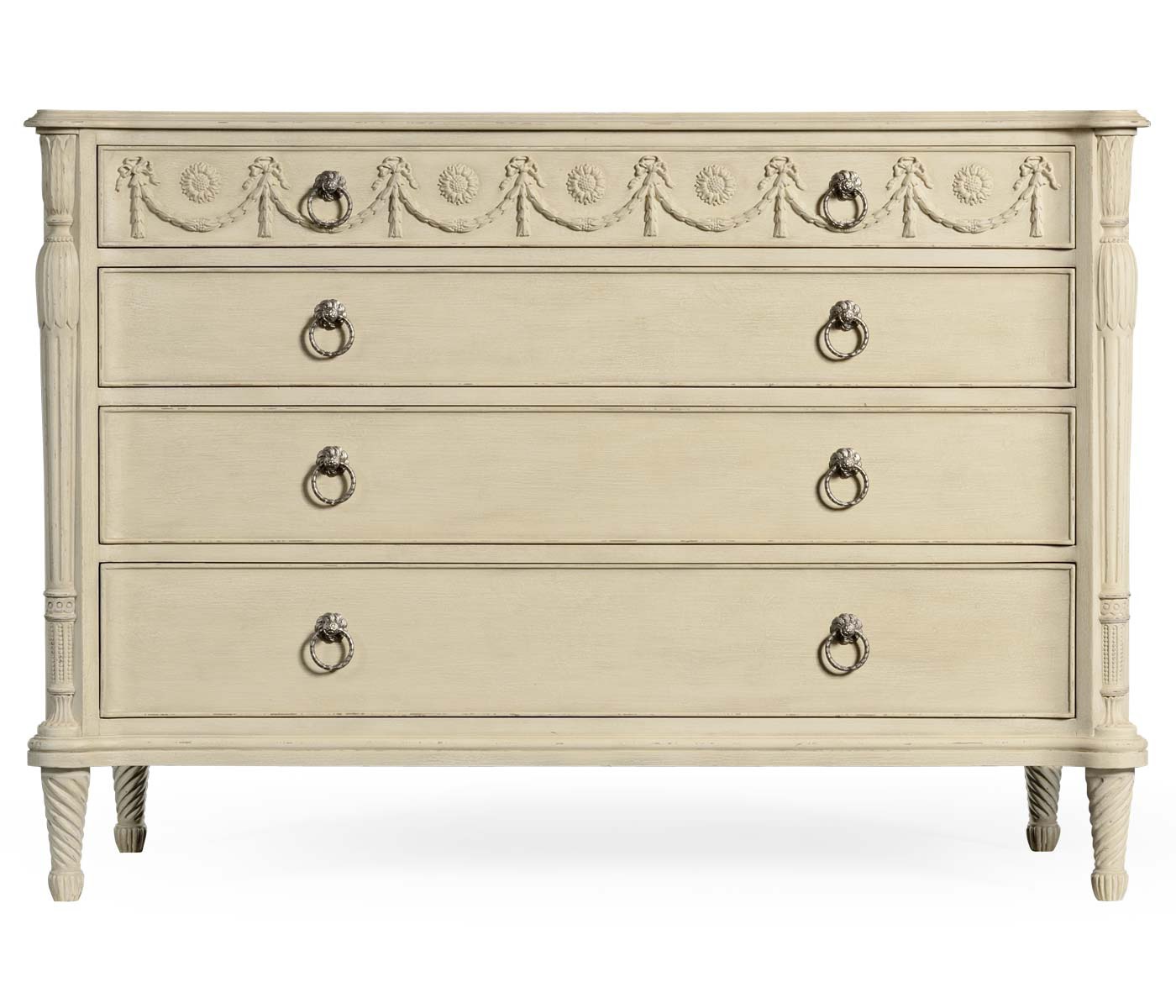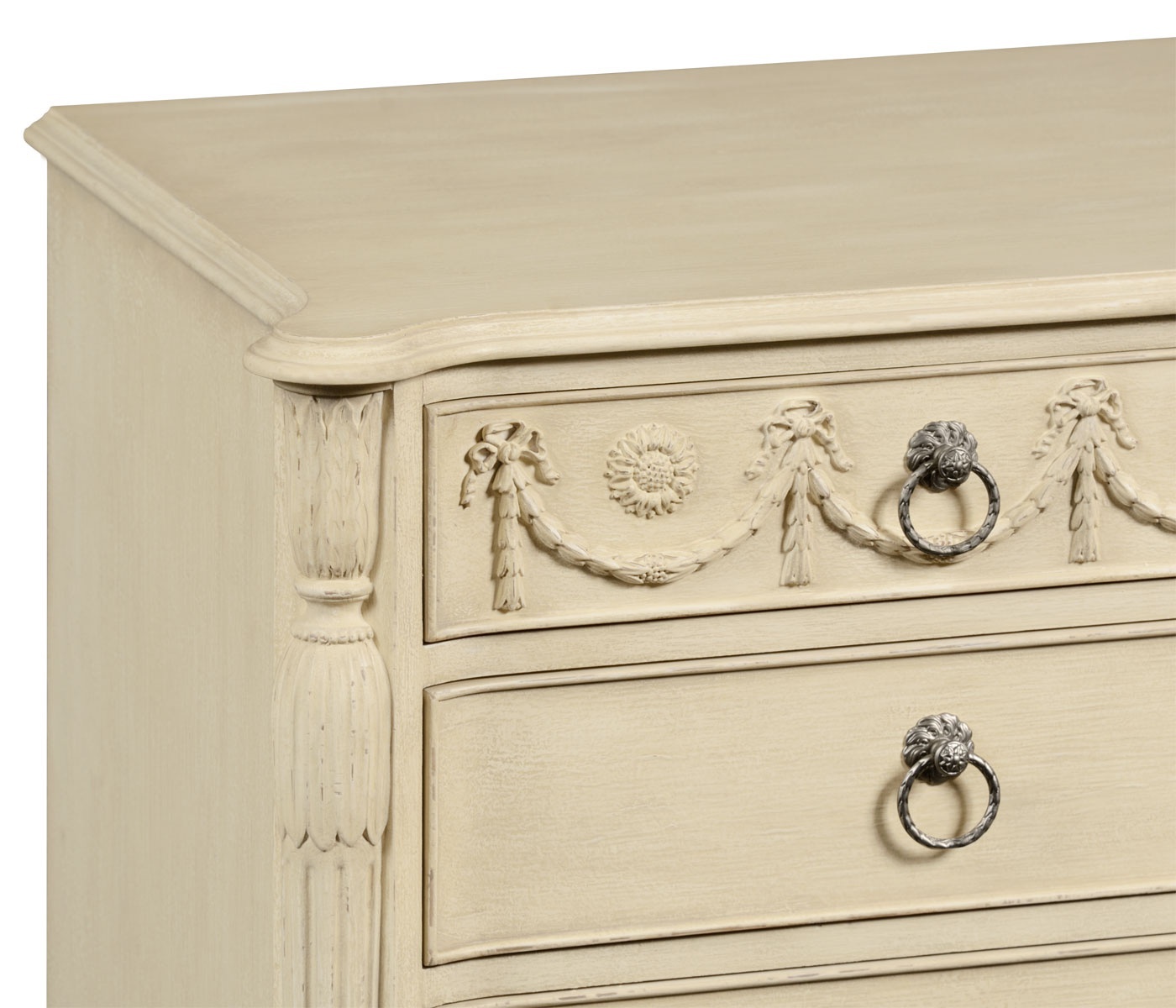 The Artisan chest from the American manufacturer Jonathan Charles. Model with case made of wood. Rounded corners with decorative columns. Legs - carved cone. The dresser has four drawers. The top drawer is decorated with a carved decoration in the form of a garland. The finishes are exquisite with white paint.