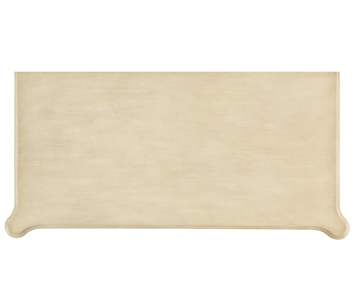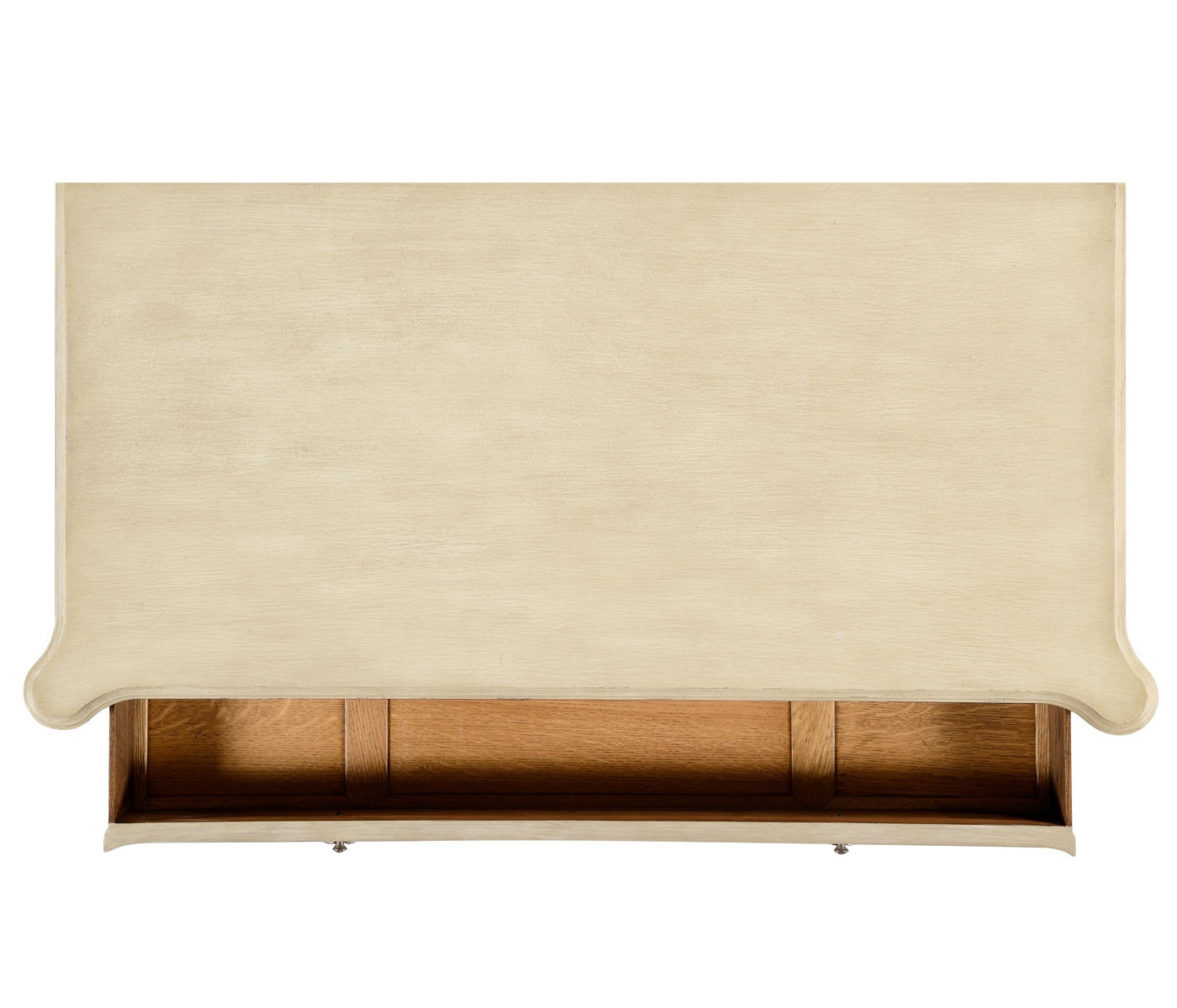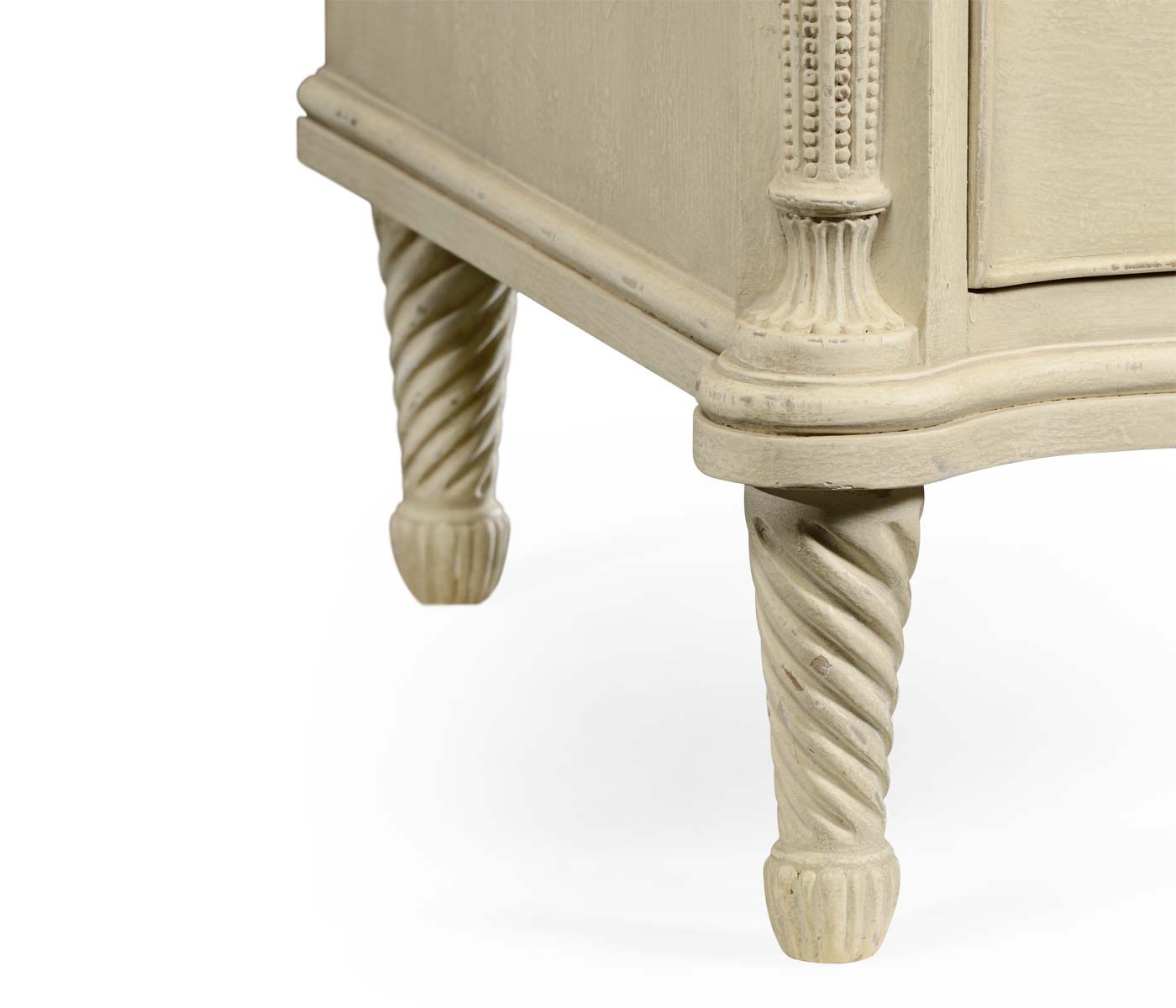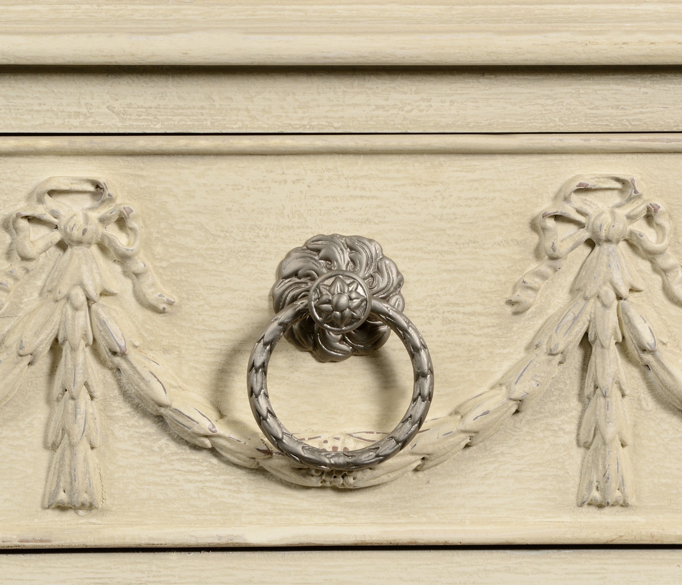 The Artisan chest from the American manufacturer Jonathan Charles. Model with case made of wood. Rounded corners with decorative columns. Legs - carved cone. The dresser has four drawers. The top drawer is decorated with a carved decoration in the form of a garland. The finishes are exquisite with white paint.