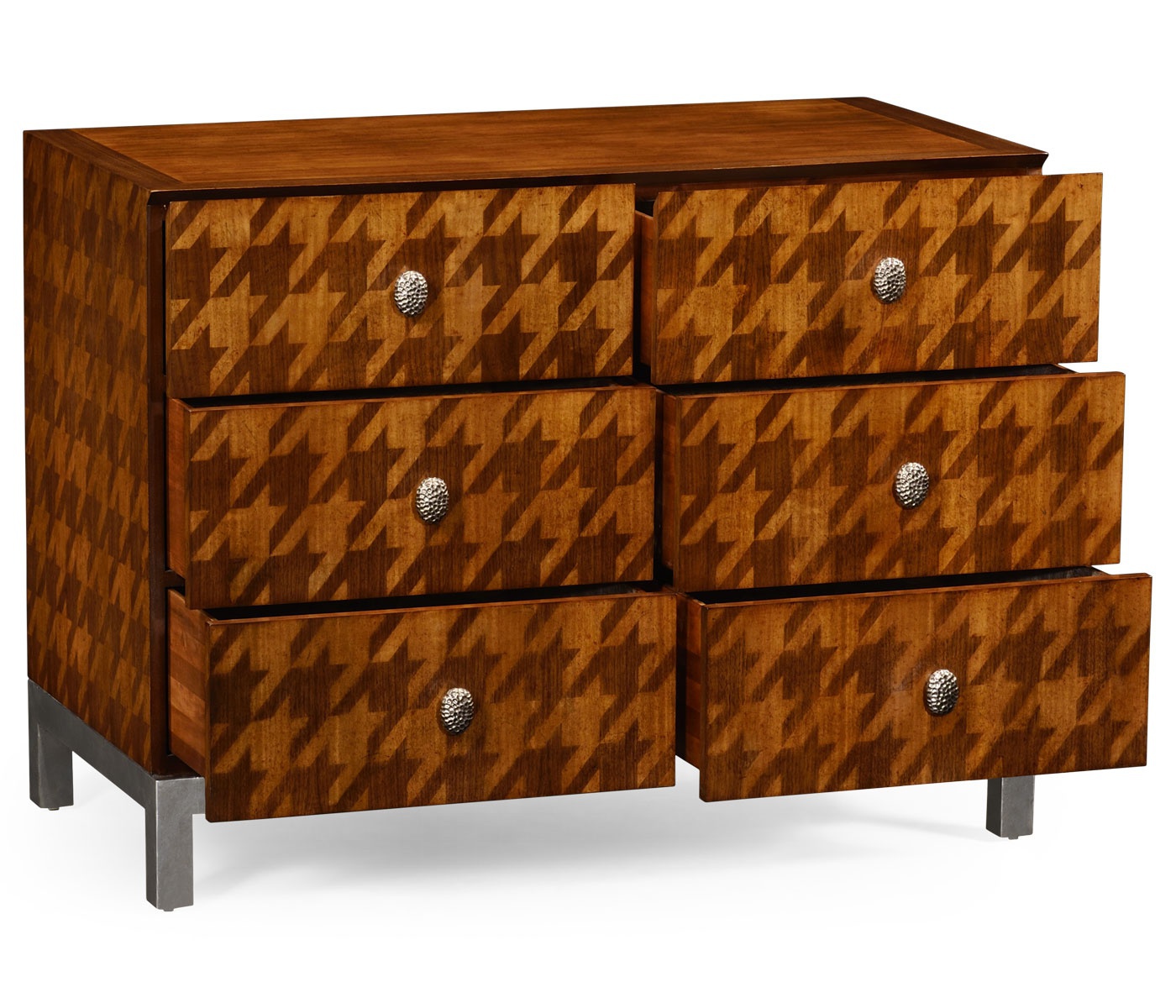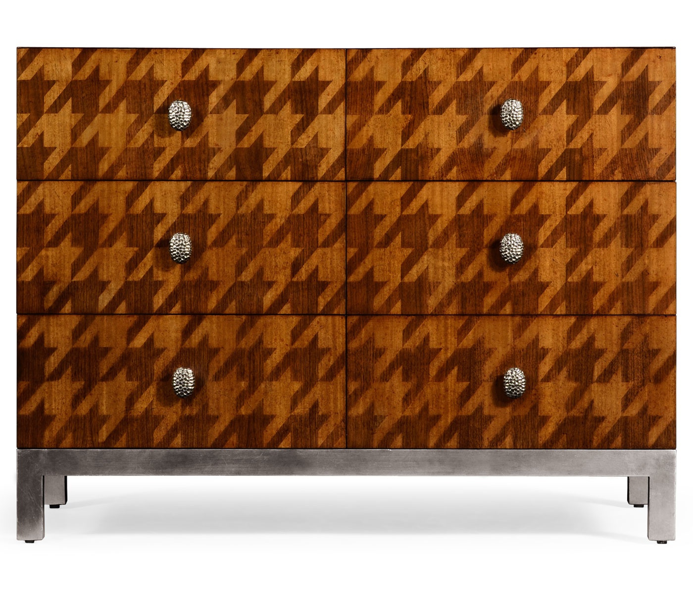 Houndstooth dresser from the American manufacturer Jonathan Charles. The case is made from natural wood and finished with veneer. The facade is decorated with inlay. Bearing is made of silvered metal. The model of rectangular form with six drawers.