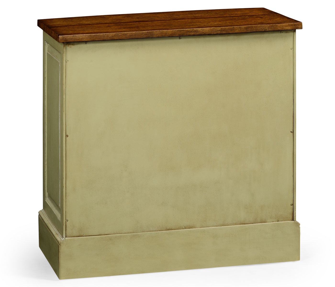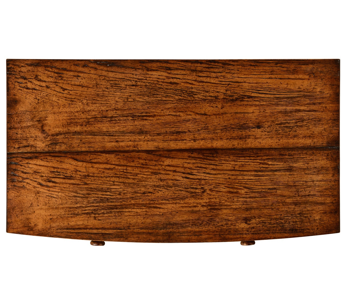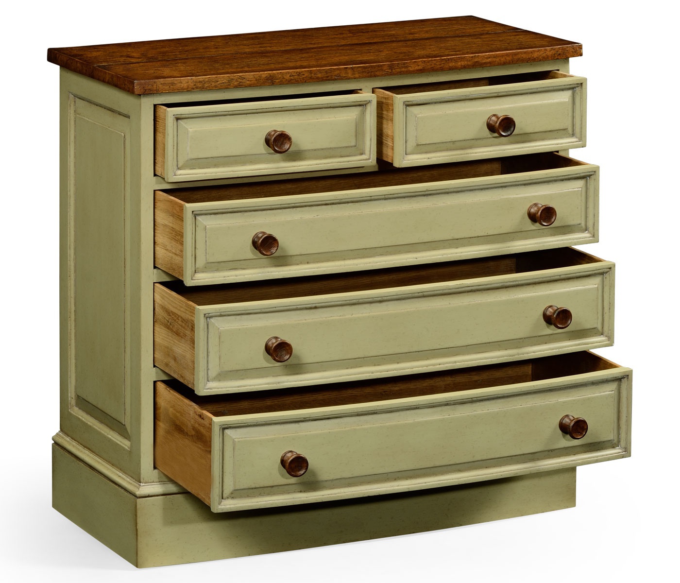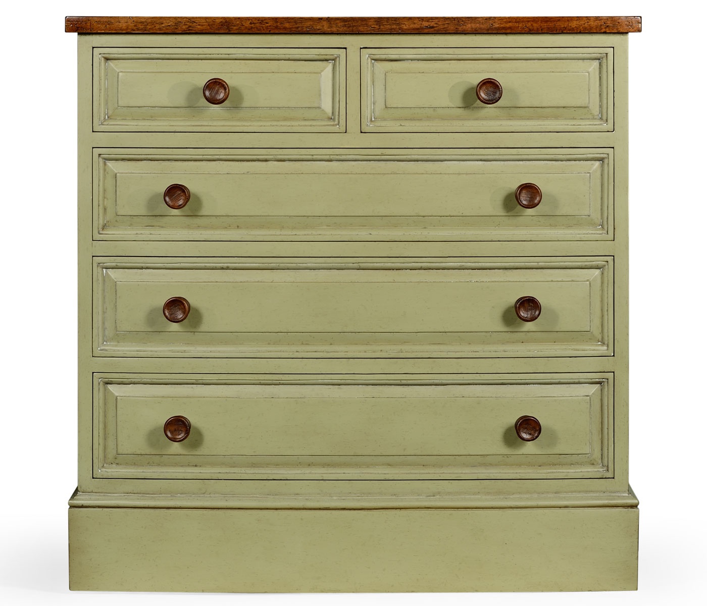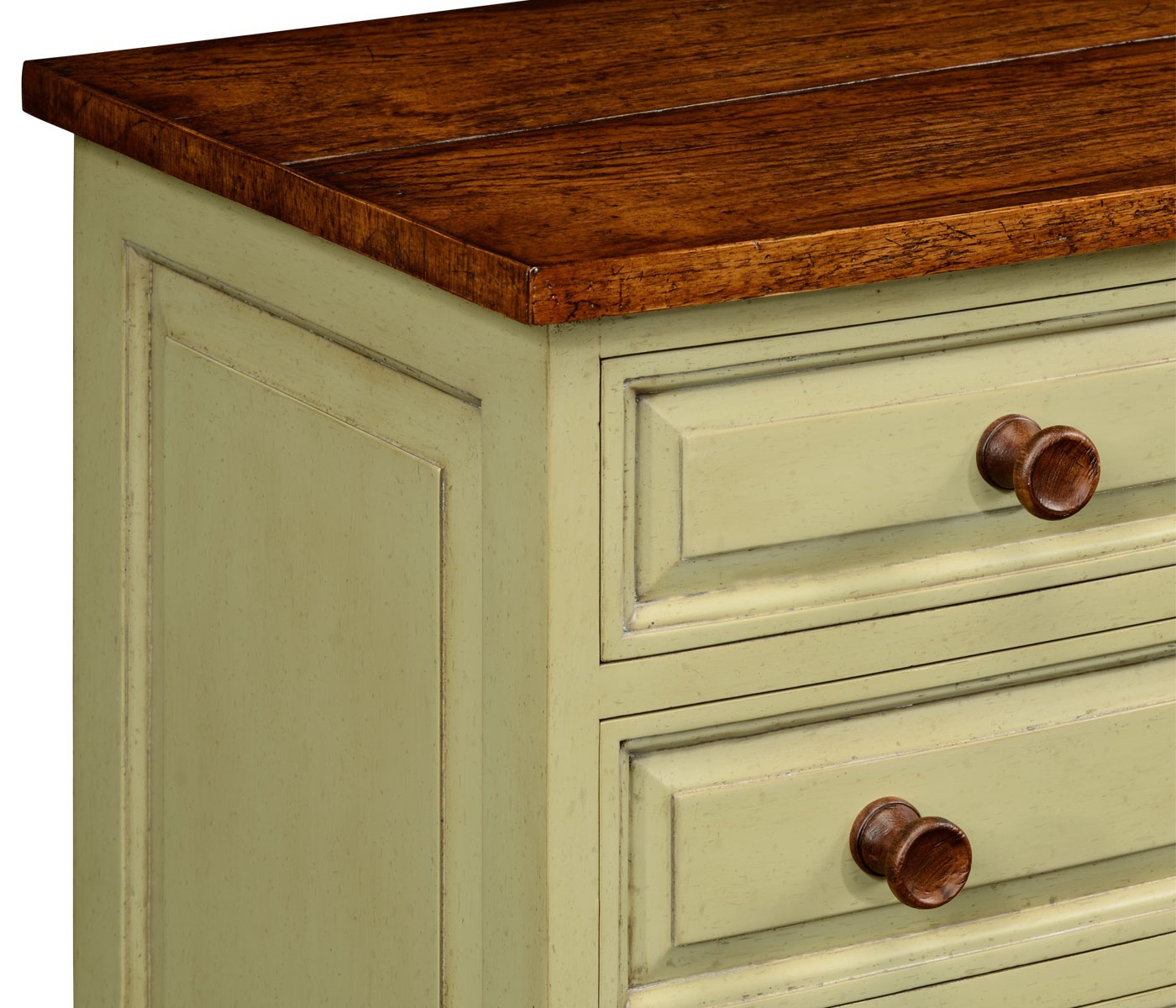 The Huntingdon dresser from the American manufacturer Jonathan Charles. The case is made of natural wood. Finished with paint scuffs. The handle is made of wood. The model is a rectangular shape on a pedestal, with three long and two small drawers.