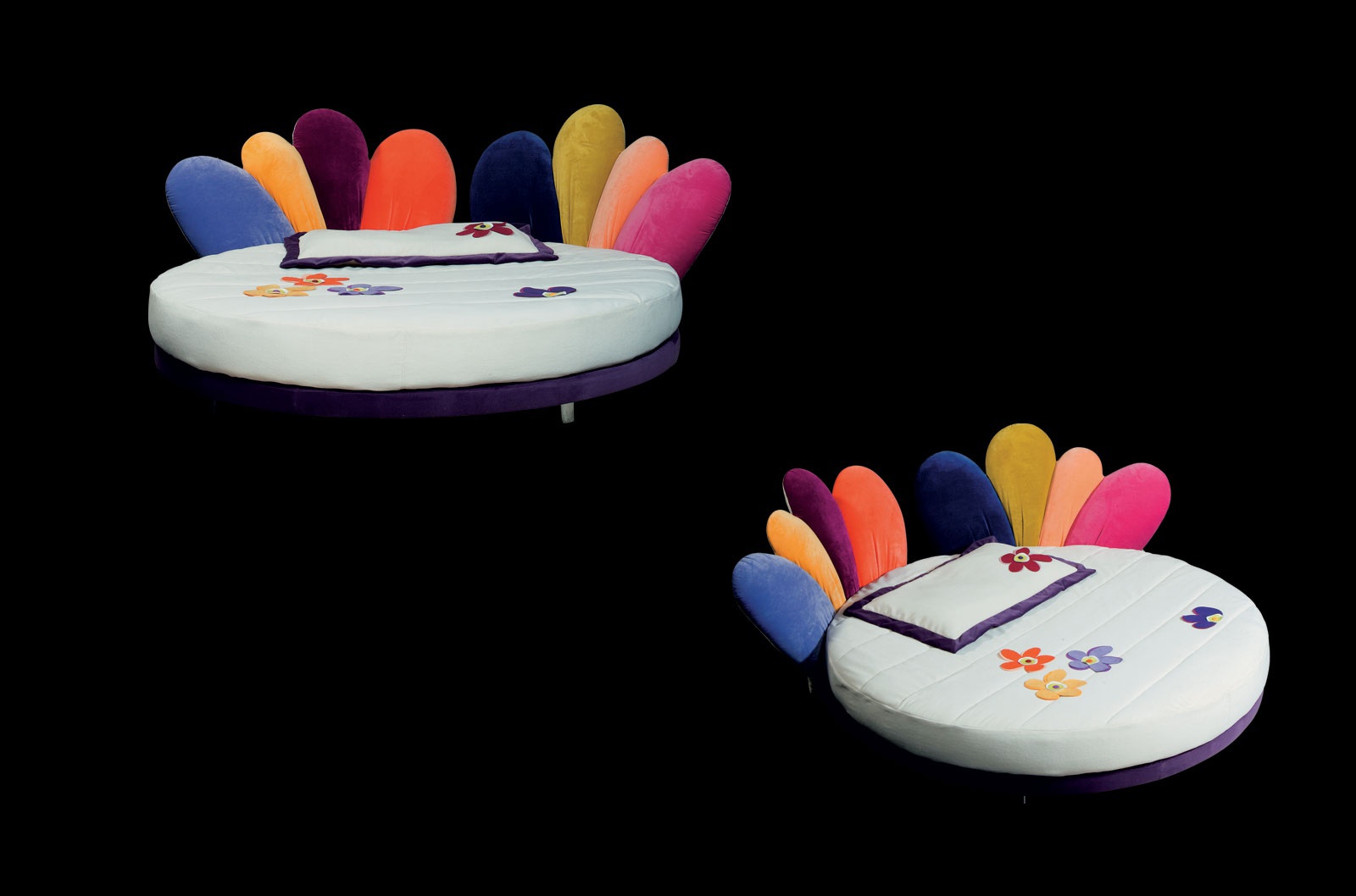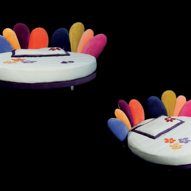 Bed round baby letto Viola from the Italian manufacturer Il Loft. The frame is made of wood and metal covered with textile. Headboard upholstered, upholstery textiles. Filled with non-deformable polyurethane foam. Model of modern design. Colors range from the manufacturer.