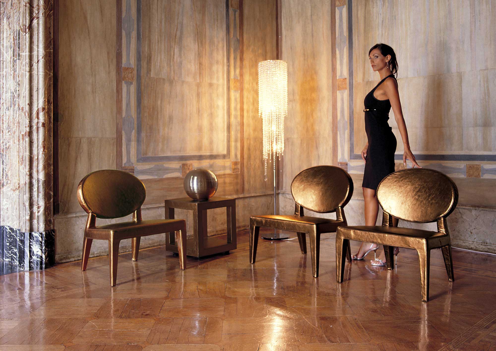 Chair X 605 Midori from the Italian manufacturer Longhi. The frame is made of metal, filler - foam, upholstery - leather or textiles from a range of companies. Great model living room design decoration. Product color Golden.