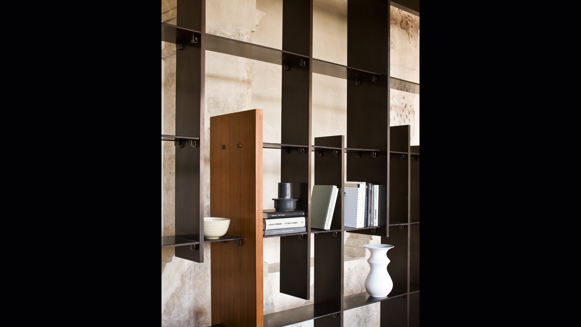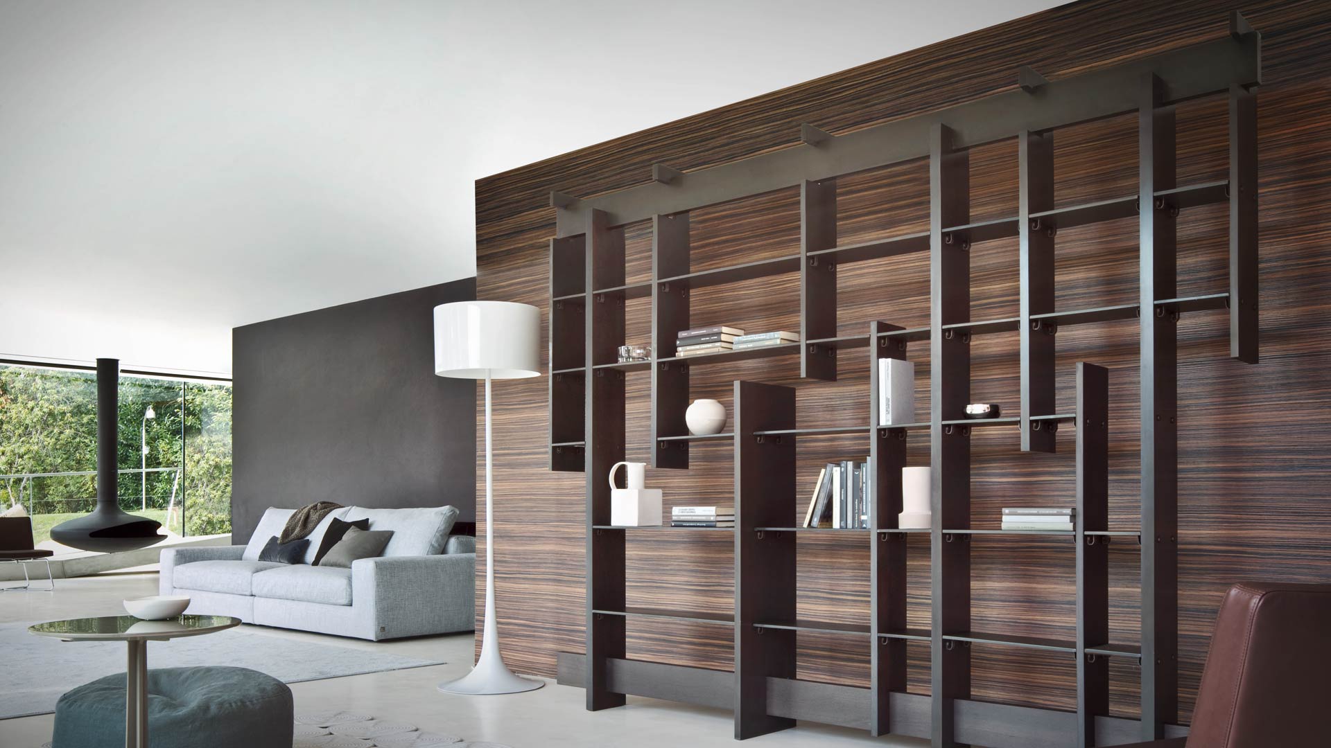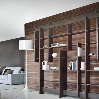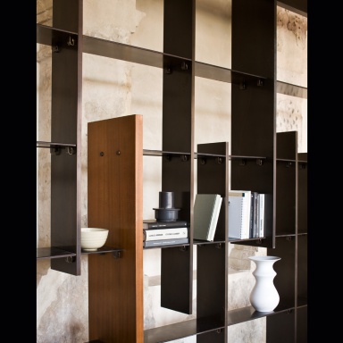 Rack f.t.b. for books from the Italian manufacturer Busnelli. The frame is made of natural wood, the surface is treated with varnish or wax from the range of the campaign. Shelves made of wood, tempered glass or metal. The rack can be mounted to a wall or can stand separately. The model is designed for modern interiors. Colours in stock.