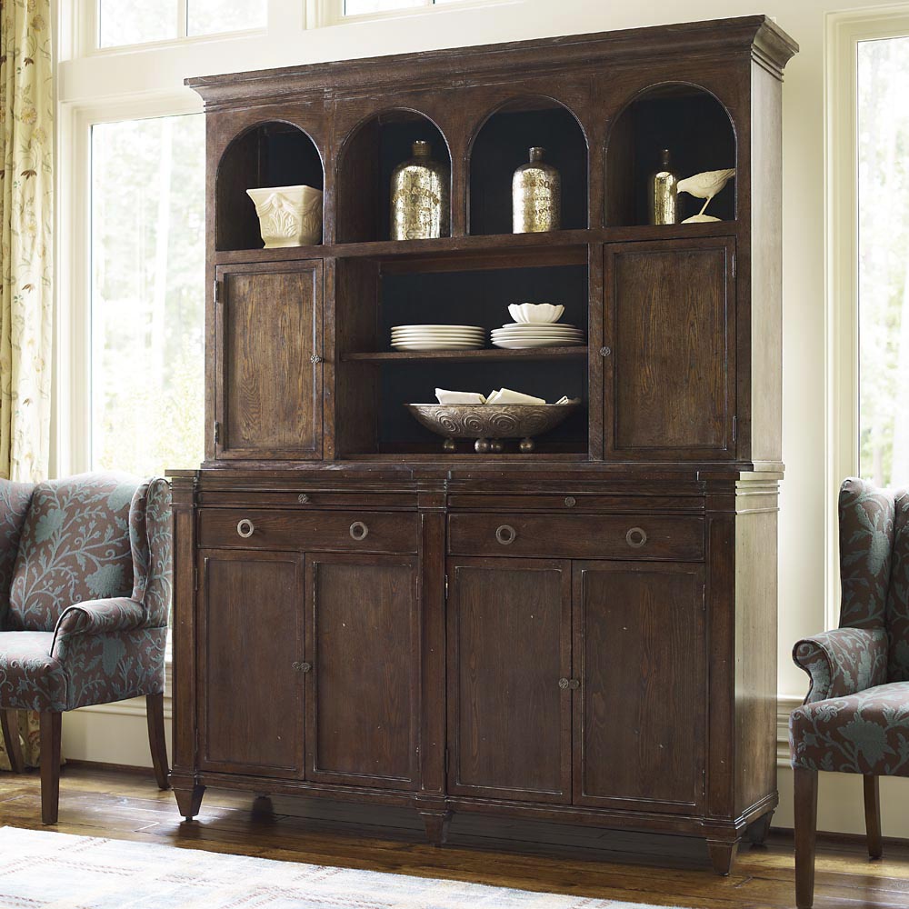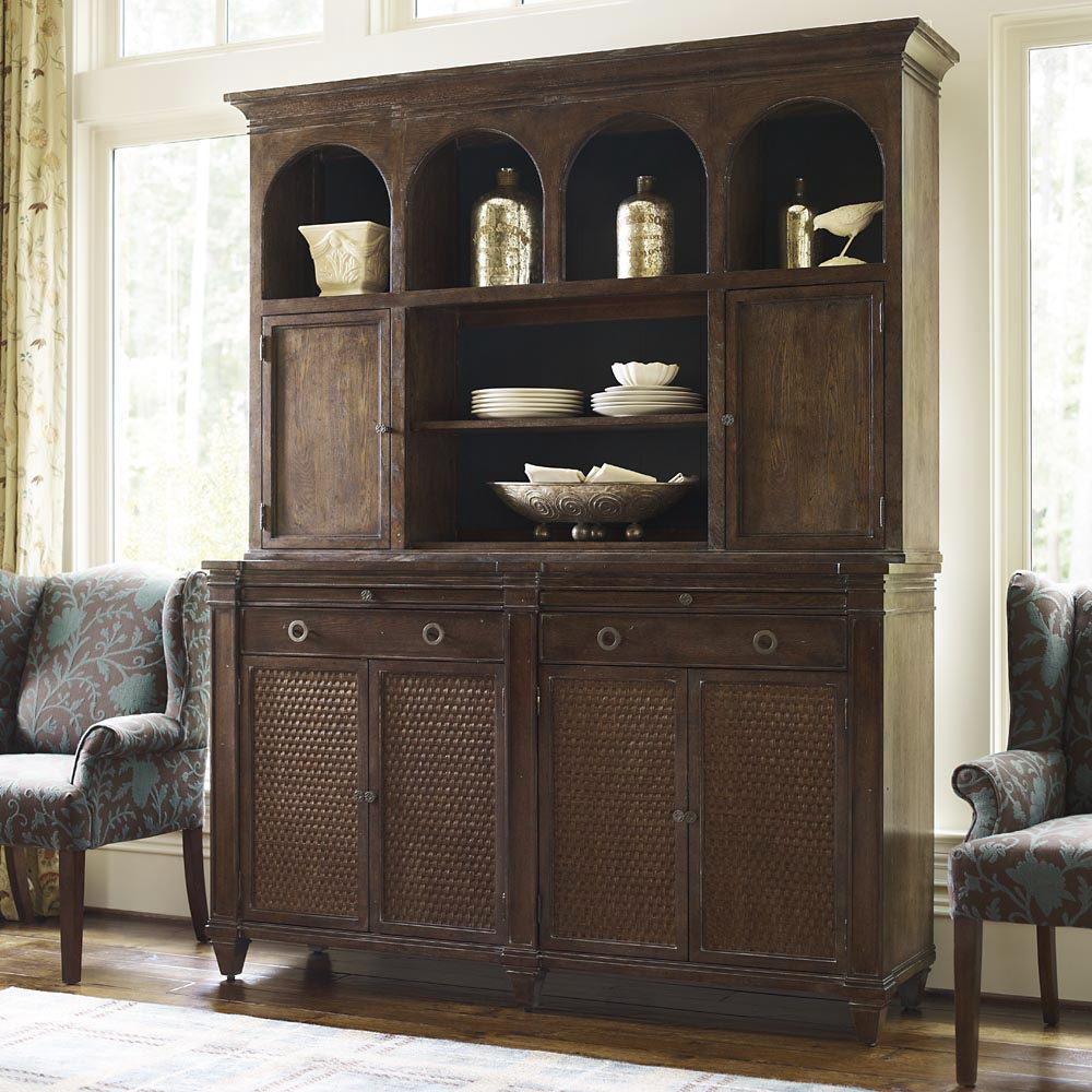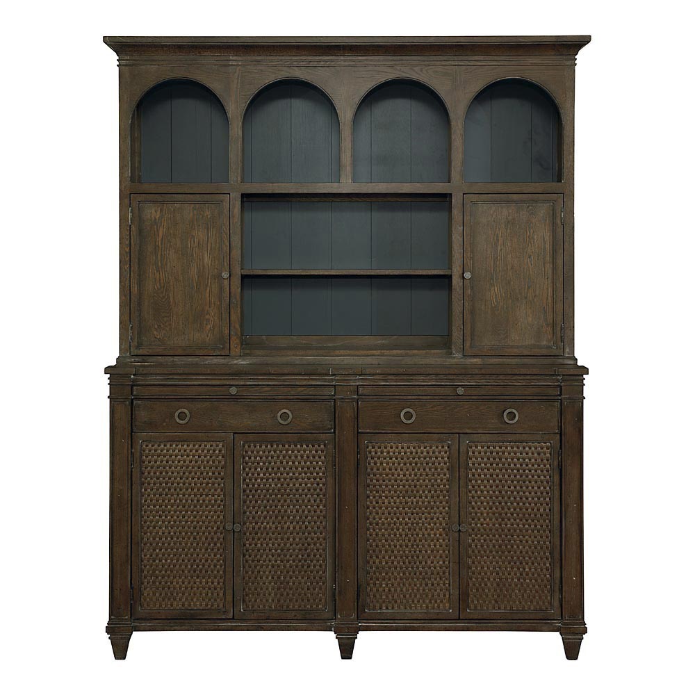 The Woodlands buffet from an American manufacturer Bassett. The model is equipped with upper Cabinet with two doors and open shelves for dishes and a base with two drawers, two pullout work surfaces and four doors. Housing and shelves made of wood. Finish offered in the catalog of the manufacturer. The door panels are offered from wood or woven reeds. The design is made in the style of the cottage.