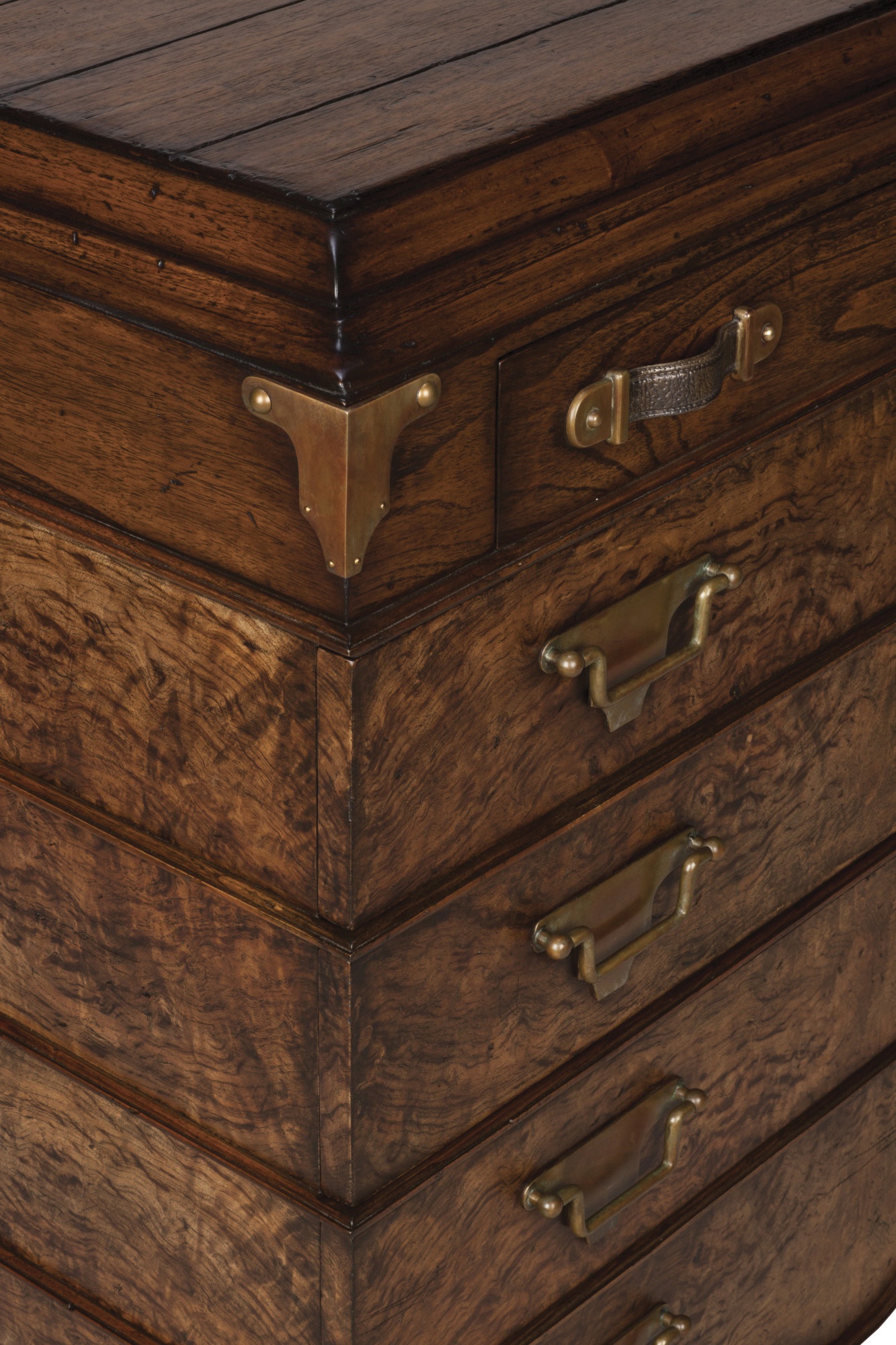 The Meadmore Five Drawer chest from the American manufacturer Currey & Company. The frame is made of brown English oak. The texture of the wood in veneer expresses a majestic and unique pattern. Fantastic details of cast brass, such as the upper corners, handles and legs make it especially unique. The drawers are separated by a smooth convex lines. The model has five drawers. Narrow drawer at the top of the drawers with handles of leather gives the feeling courage.