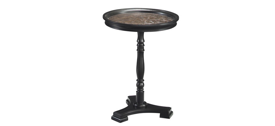 Table Kingston from an American manufacturer Avenue B. Round table top with a pattern made of MDF and covered with faux metal. Prop is made from wood, an Asian hardwood. Finished with antique black color.