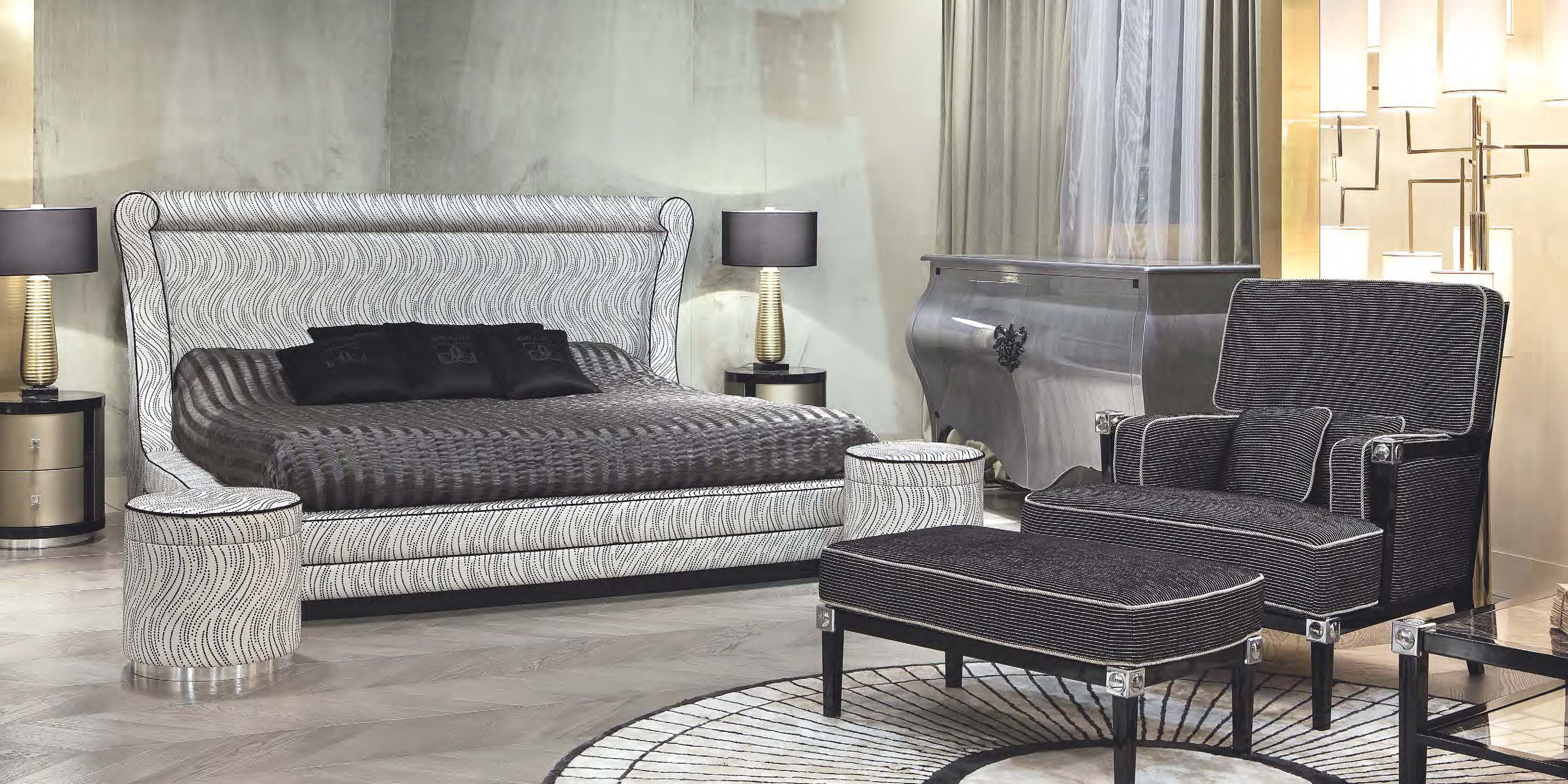 King size bed from Italian manufacturer Formitalia. Model of the collection Samuele Mazza. Frame made of natural wood, upholstery - textiles. The model is in modern style. Colours in stock.