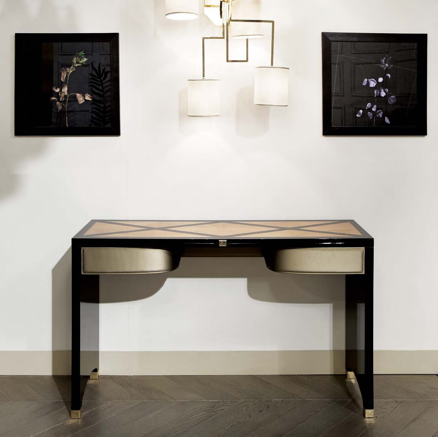 Console Queen from the Italian manufacturer Formitalia. Model of the collection Samuele Mazza. Made of natural wood. Drawers in leather. Colours in stock.