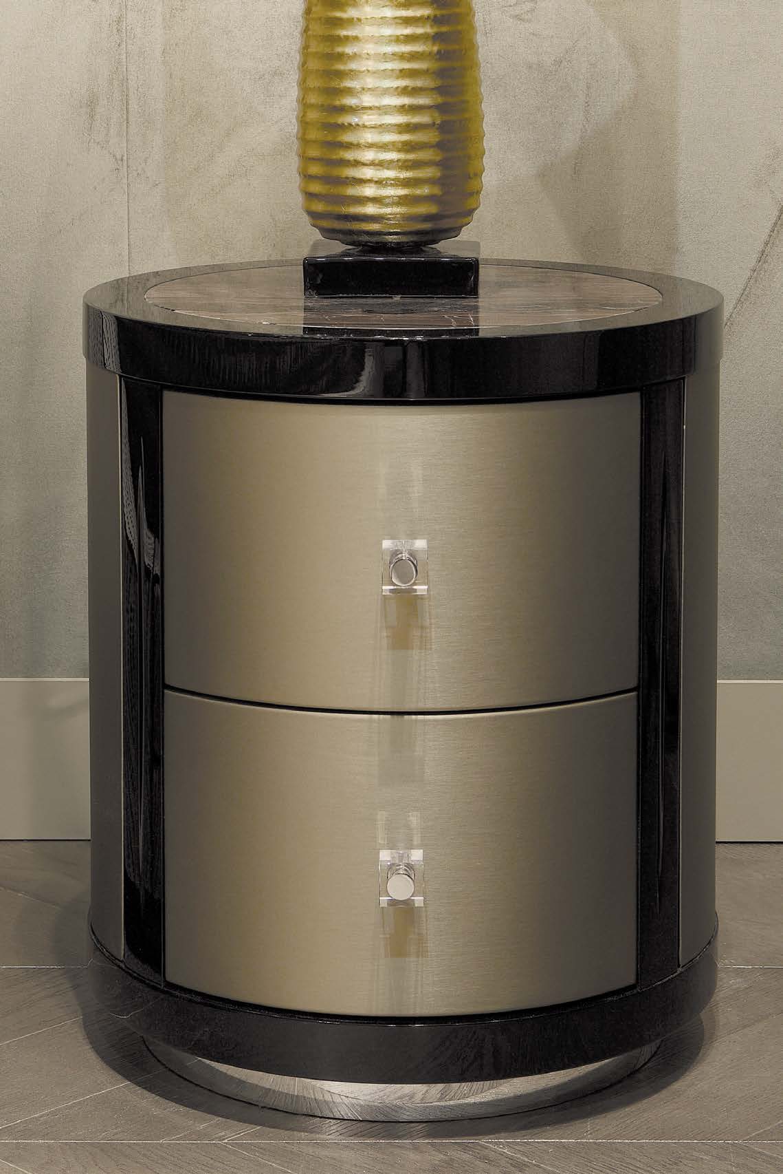 Bedside table Queen from the Italian manufacturer Formitalia. Model of the collection Samuele Mazza. The frame is made of wood. Decorative items made of metal and glass. The model is made in modern style. Colours in stock.