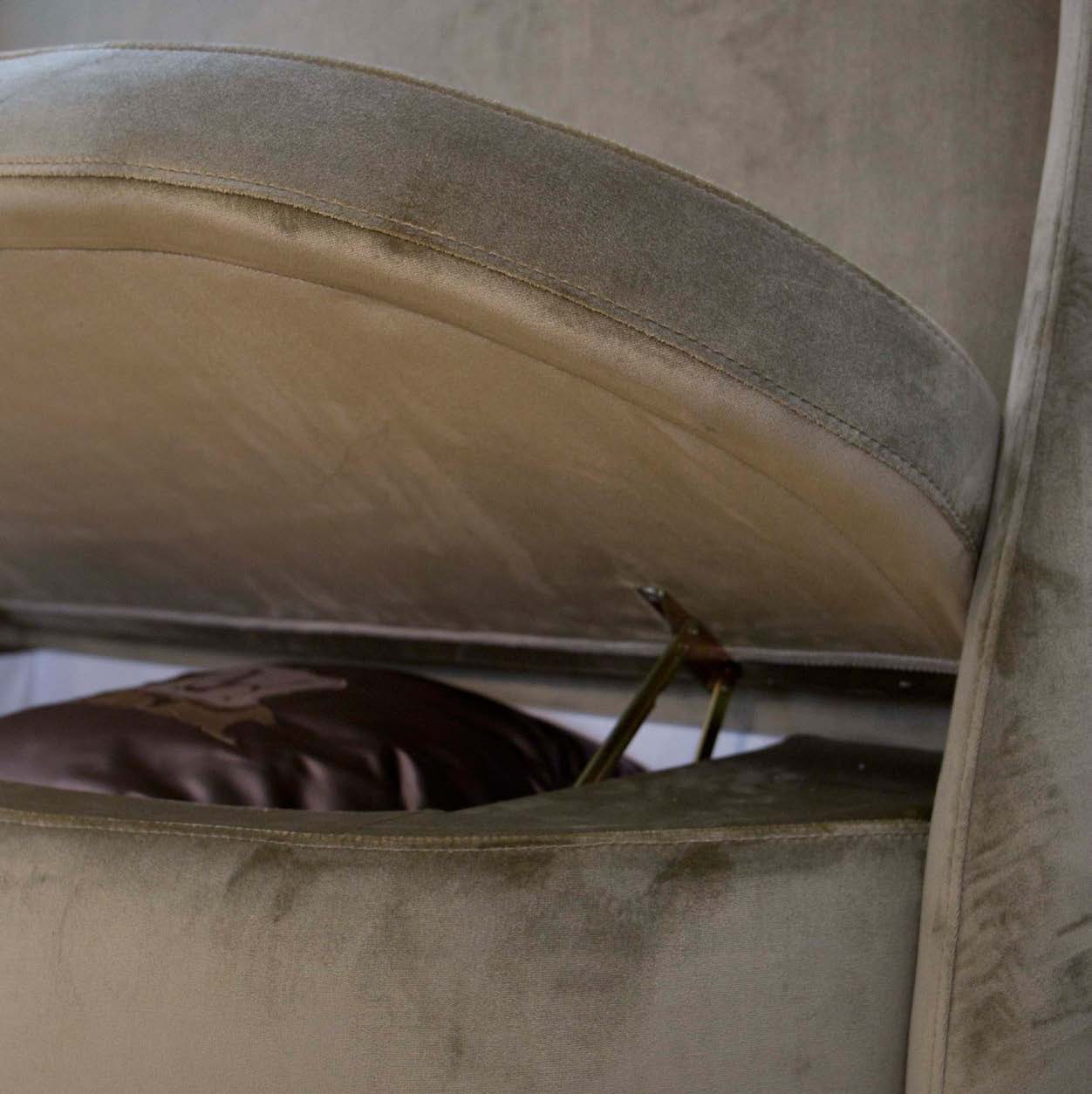 Bench with a high back Muzio from the Italian manufacturer Formitalia. The model is made in a modern style, from the collection of Samuele Mazza. Frame made of natural wood, upholstery - textiles from the company portfolio. Internal drawer in the leather upholstery. Decorative items made of metal. Colours in stock.