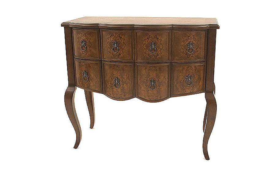 Chest Belmonde from the American manufacturer Avenue B. Model high bent legs. The frame and legs made of Asian hardwood, MDF housing and a veneered cherry. A chest of drawers for bedroom in classical style.