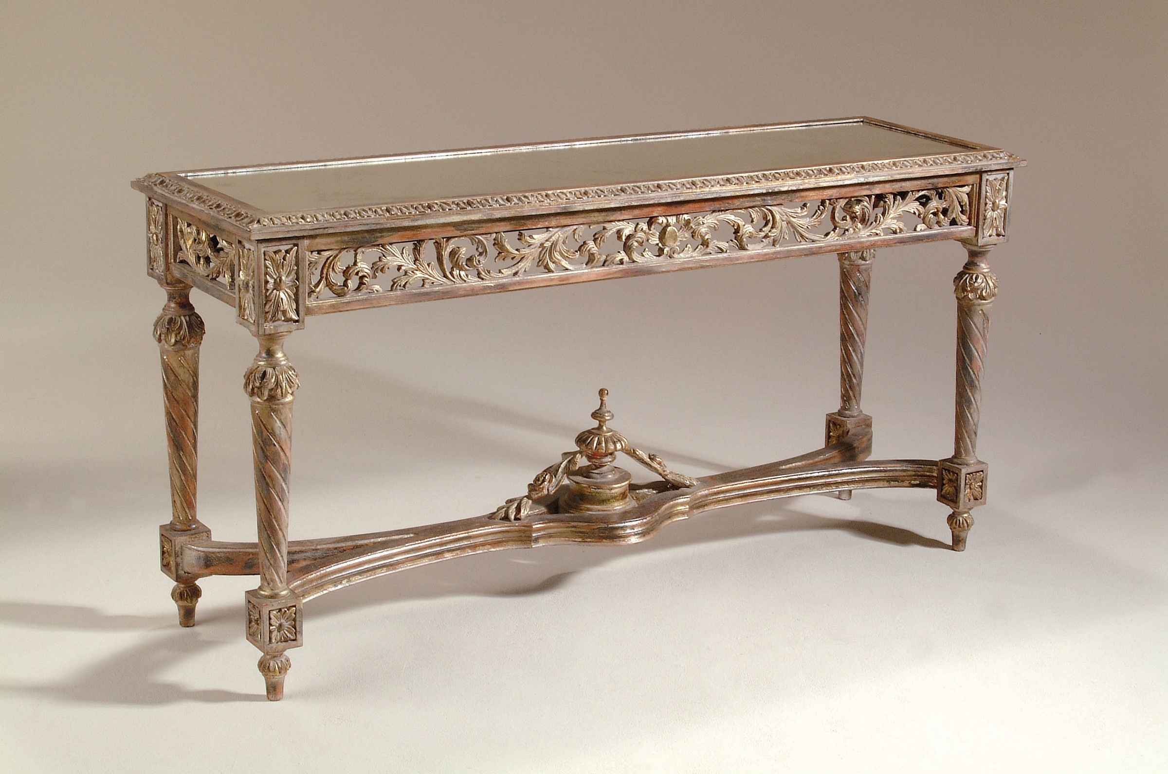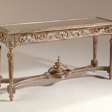 The console table from the American manufacturer La Barge. Venetian Console, antique Gothic. The frame is made of brass in silver plated and gold plated finish with glass top. Colours in stock.