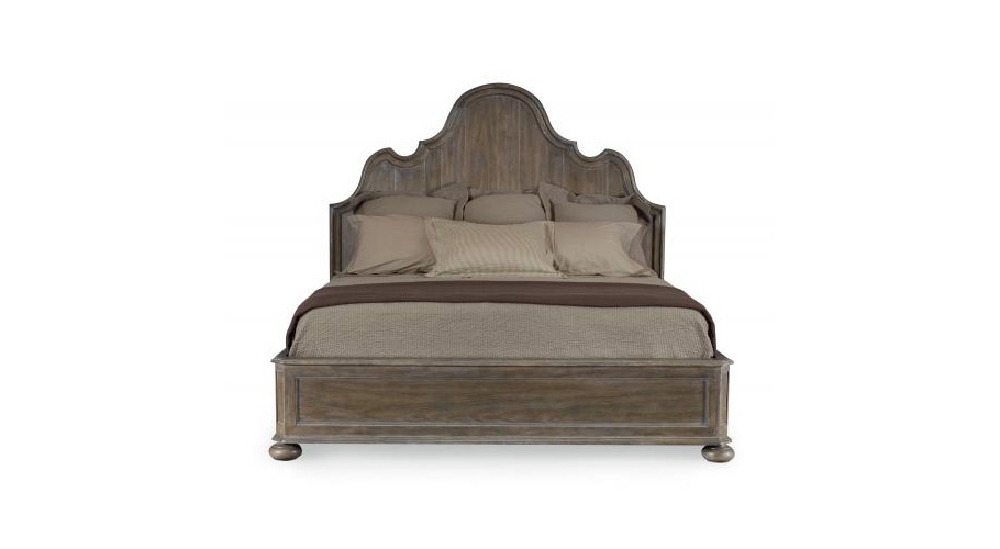 The Belgian Oak bed from the American manufacturer Bernhardt. The manufacturer offers a double model in three different sizes: King, California King, Queen. Model on the runway with a sculpted headboard. Frame and round legs made of wood. The trim is made in wood veneer white oak.